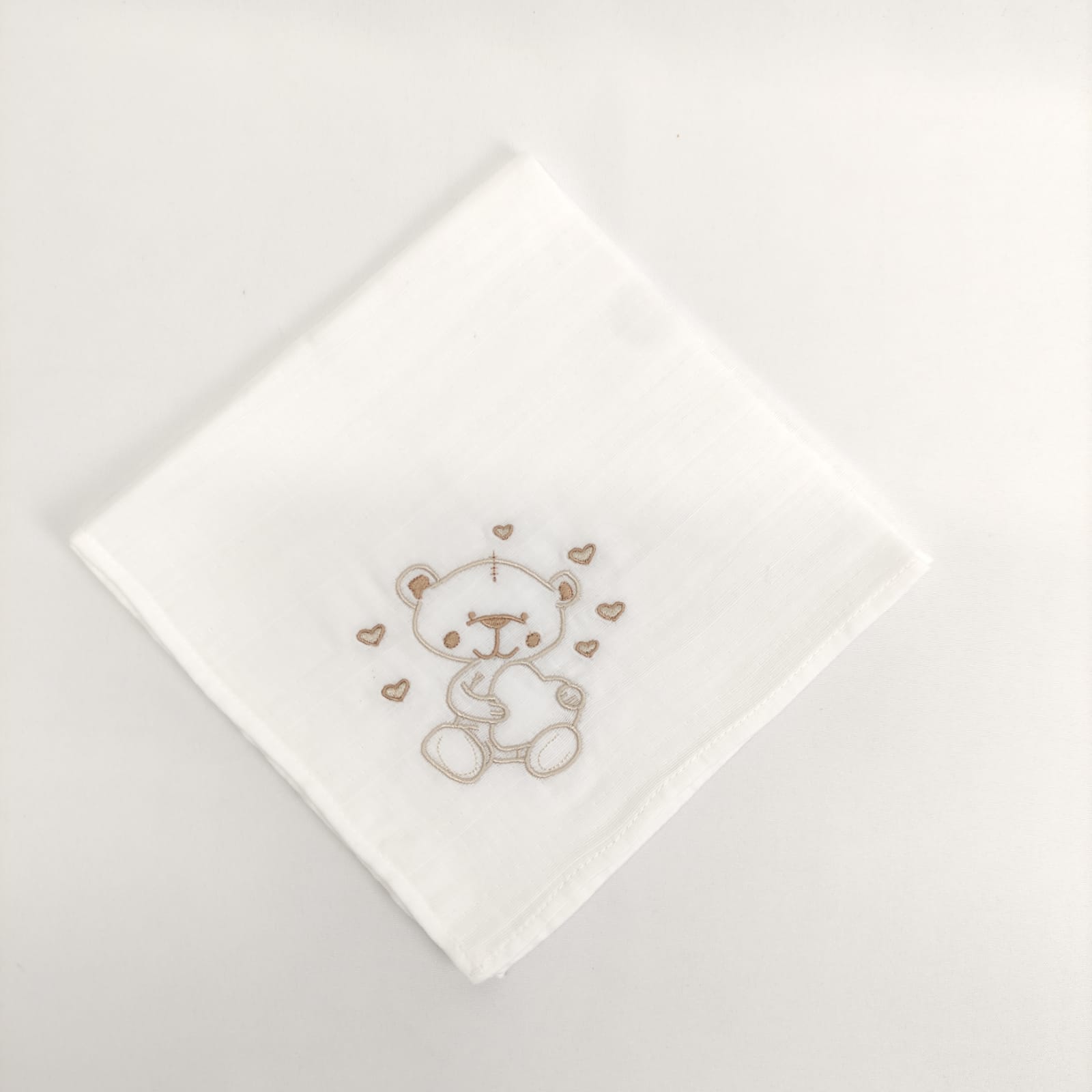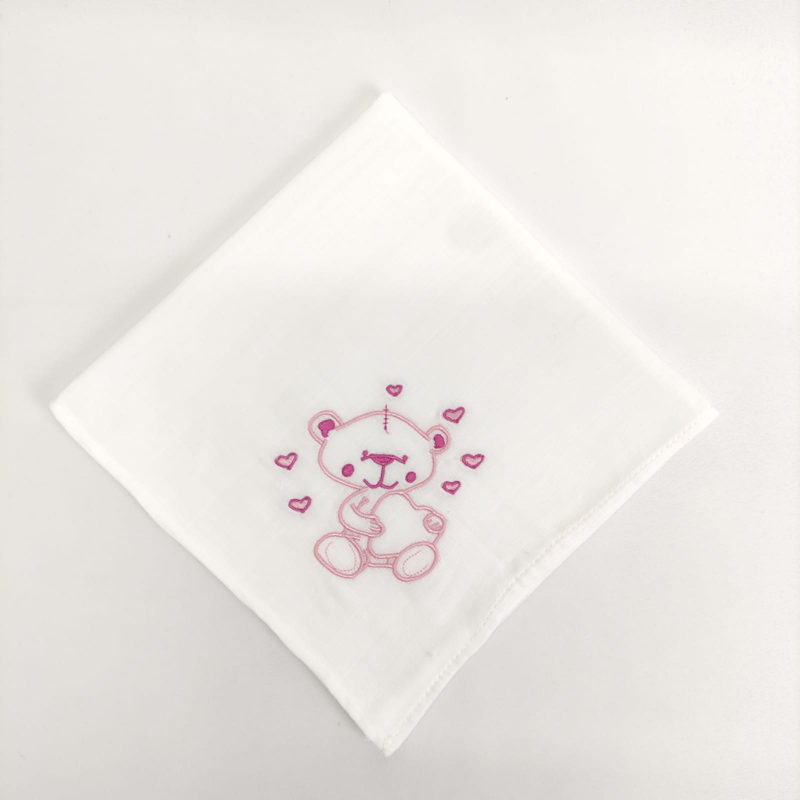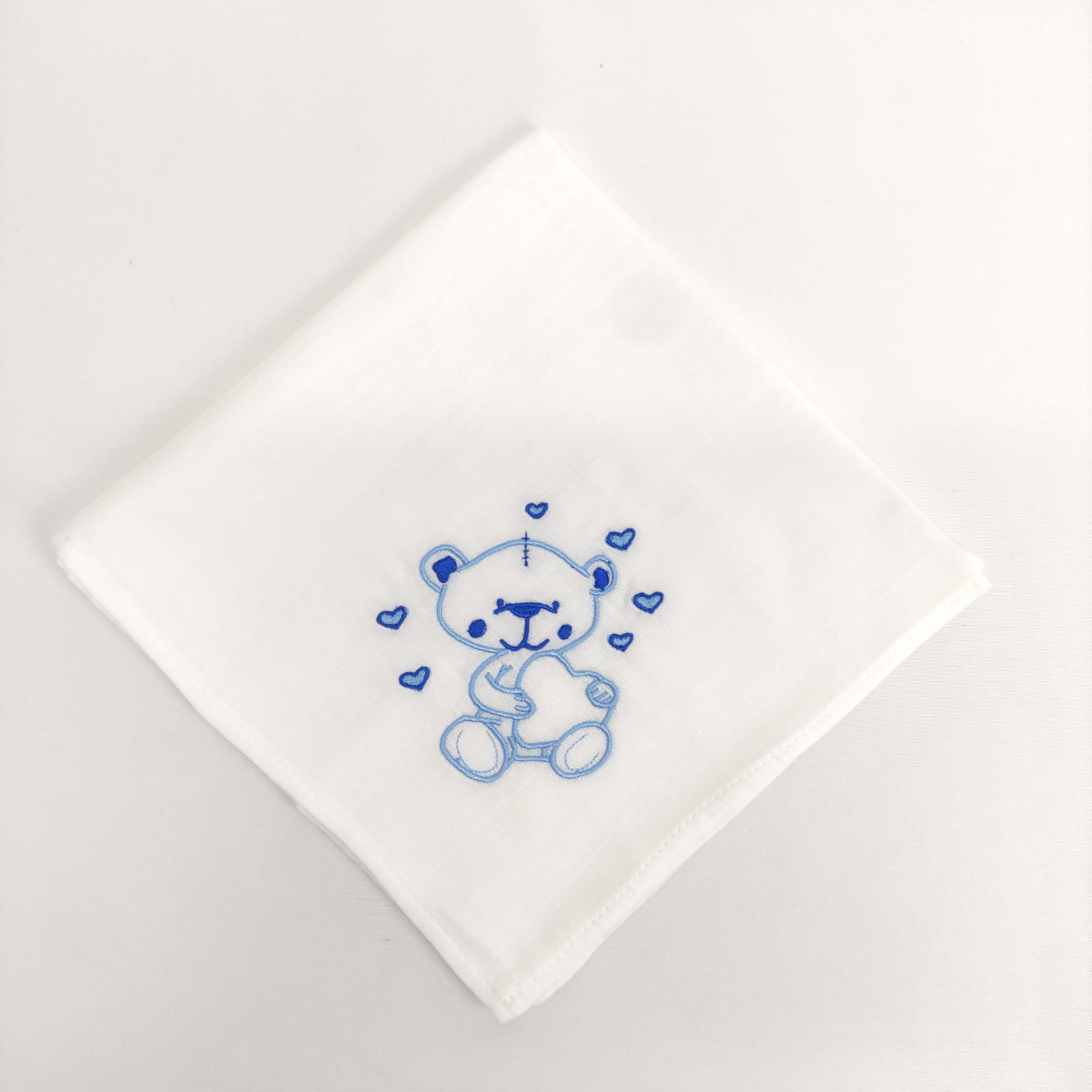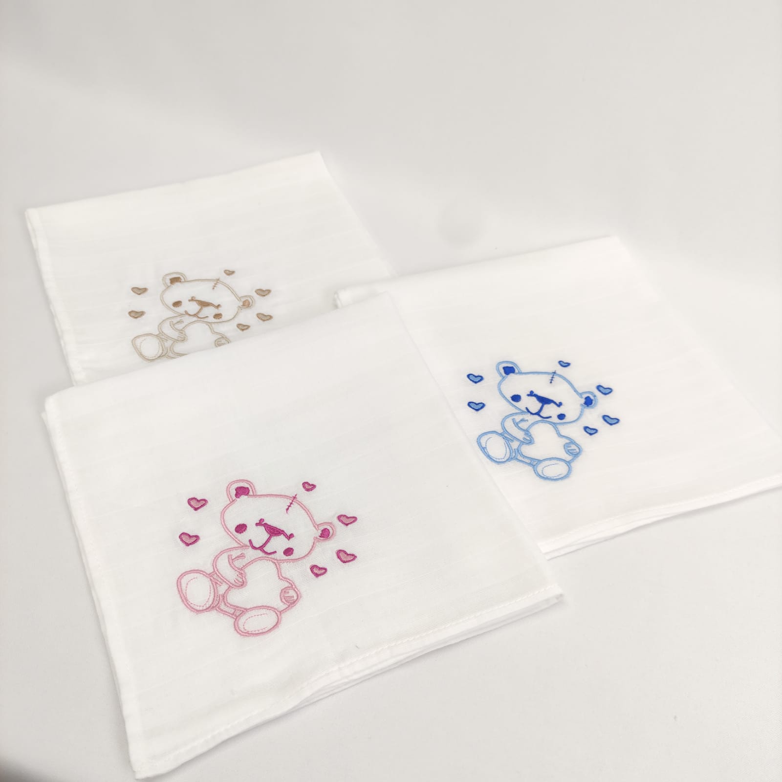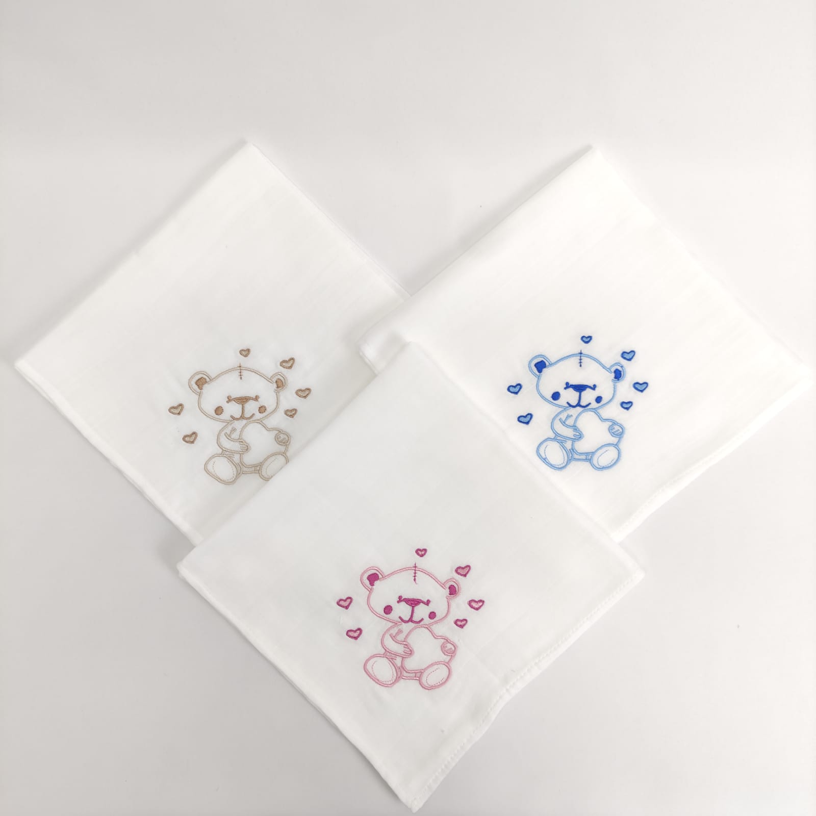 Fralda em algodão com bordado infantil. Disponível em azul, bege e rosa.