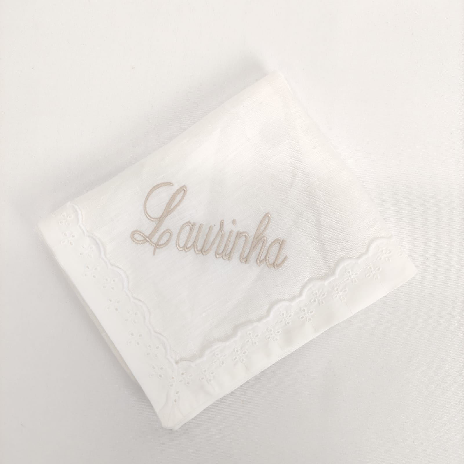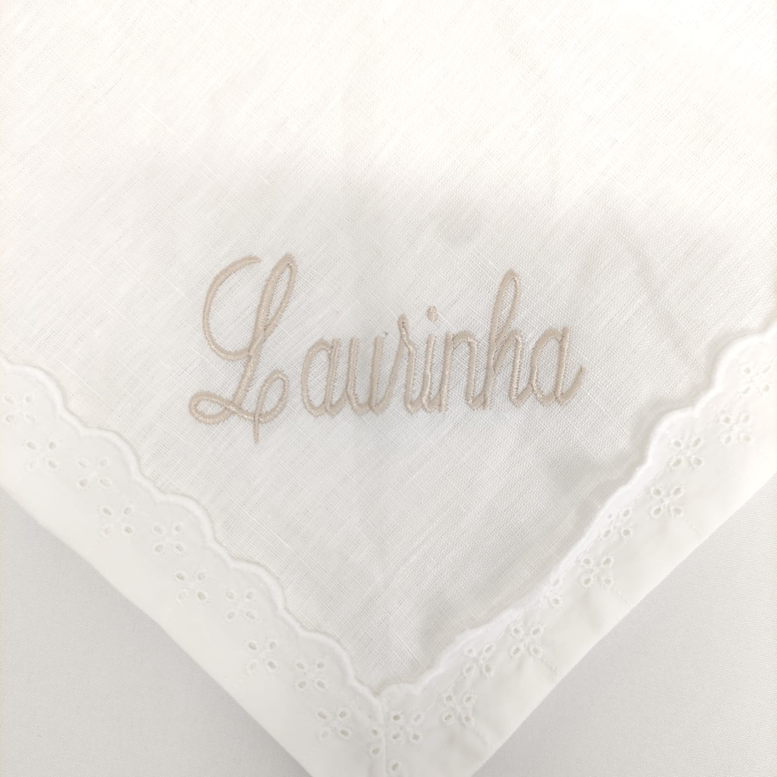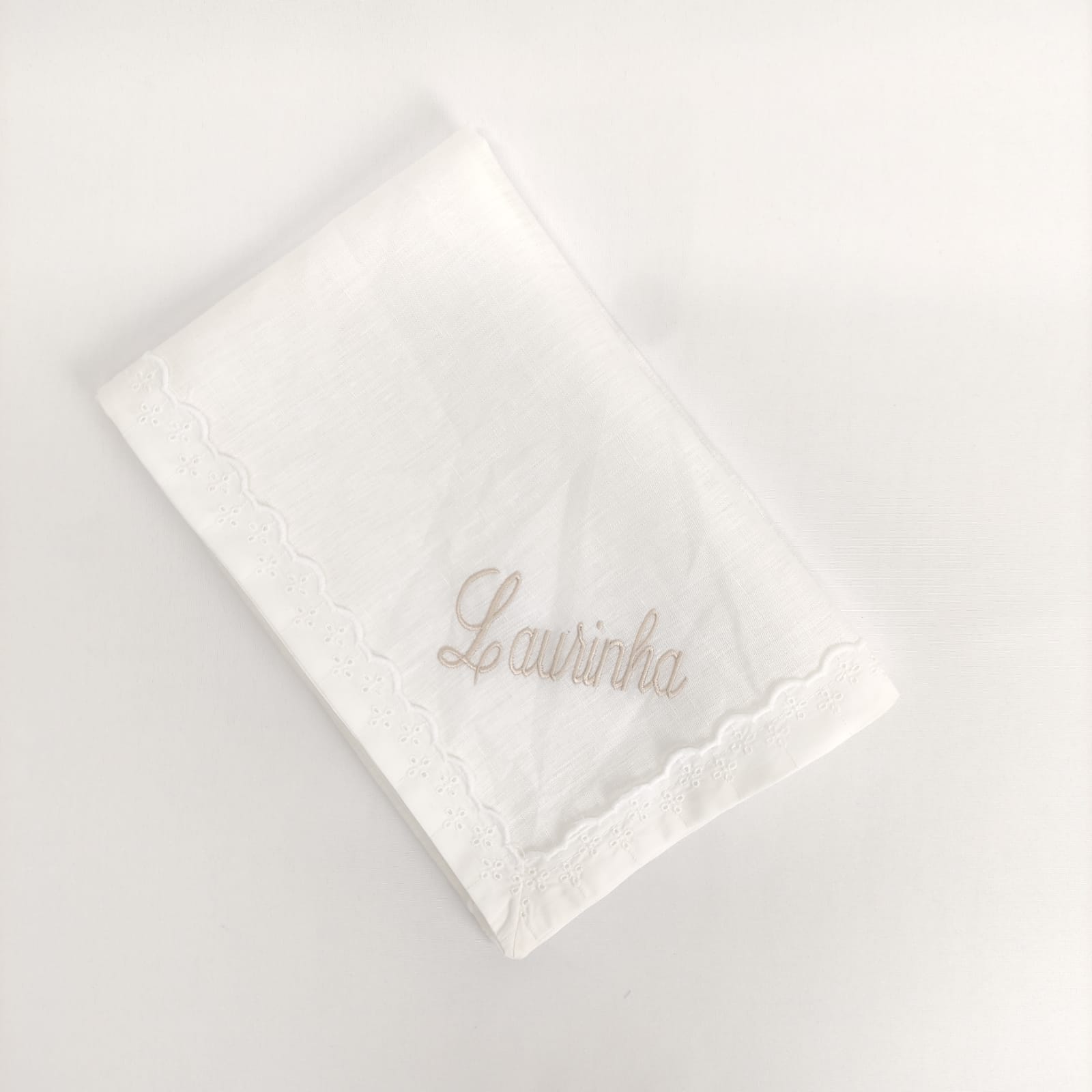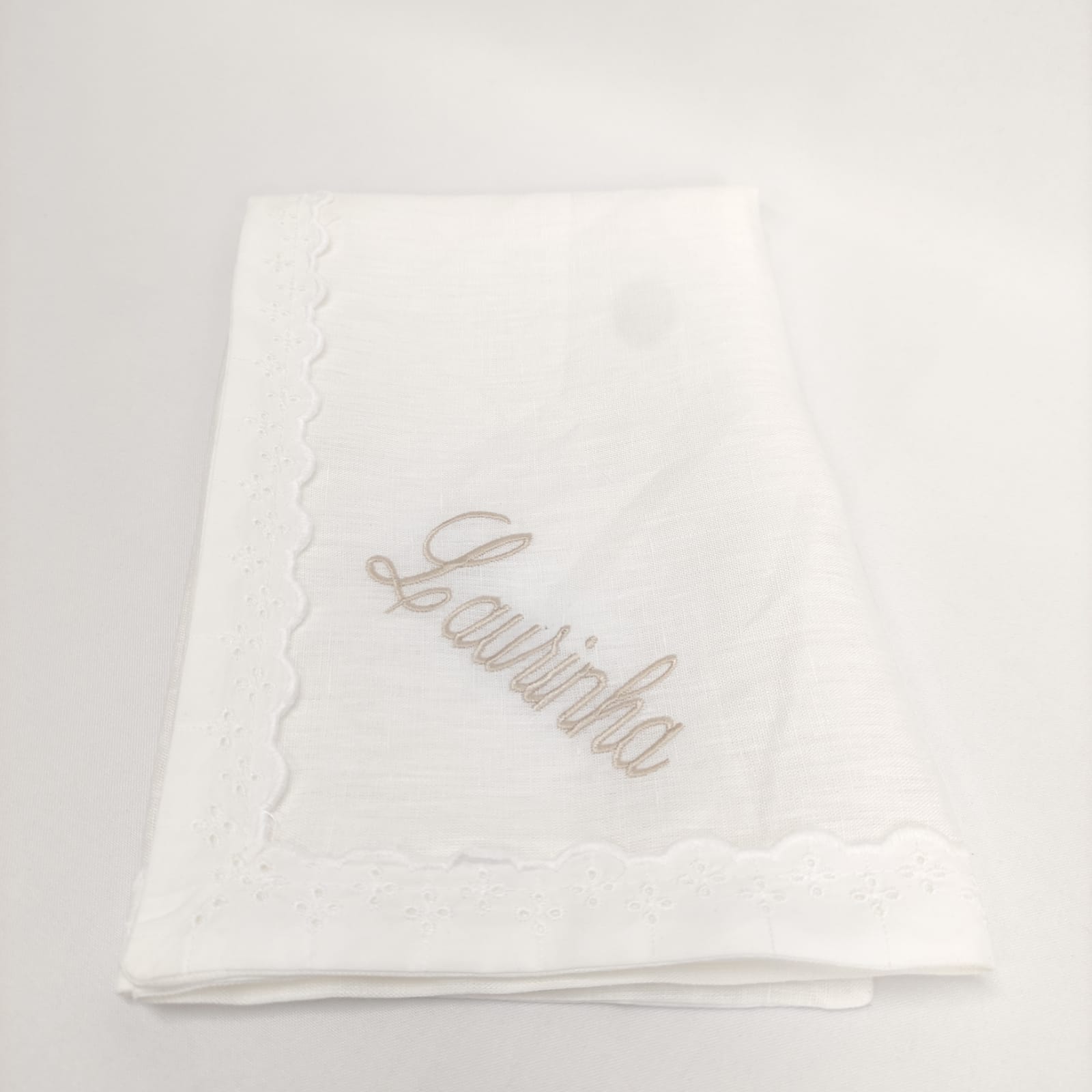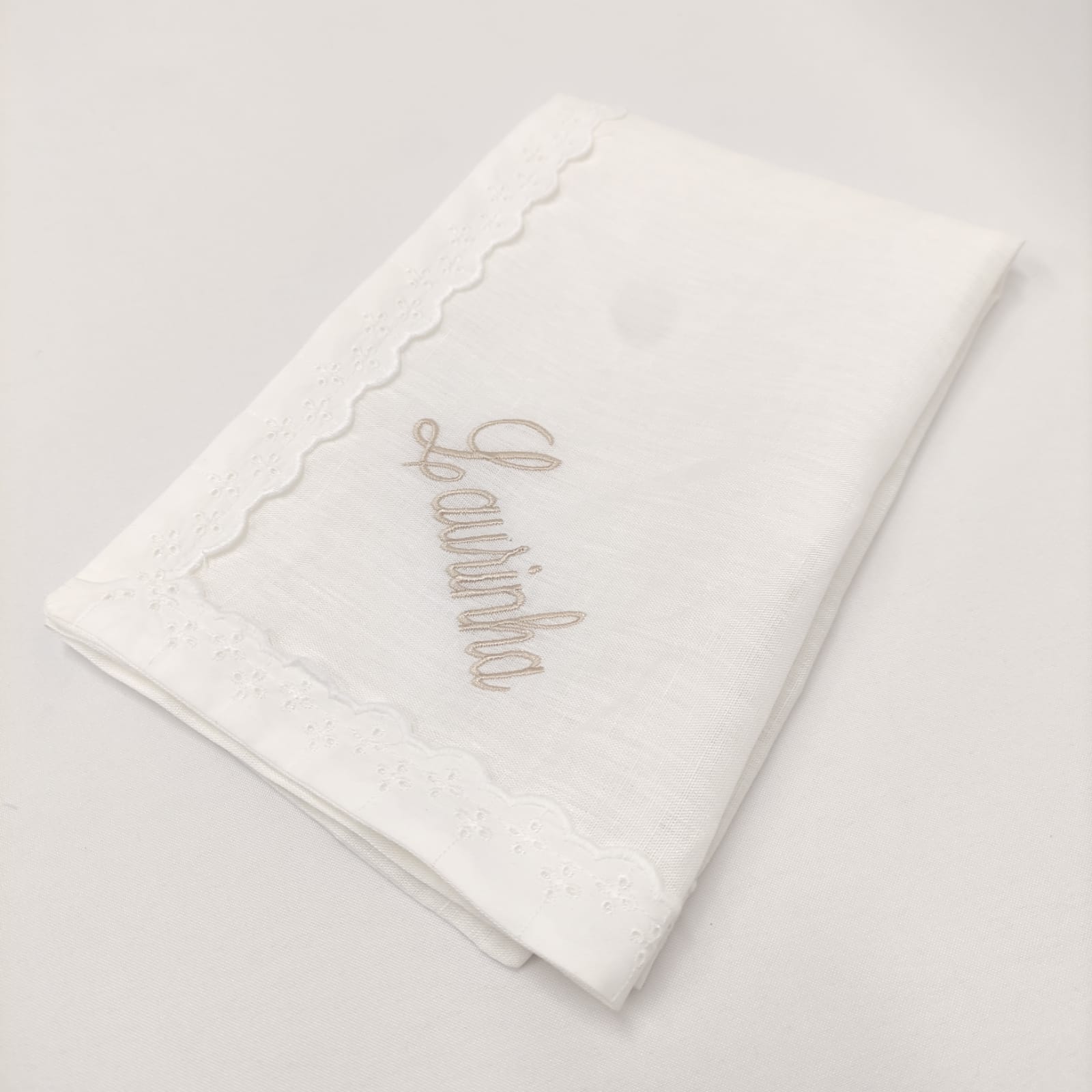 Fralda em musselina de algodão branco com detalhe em renda branca, indispensáveis na proteção e limpeza da pele aveludada e macia do bebé. Ideal para bordar