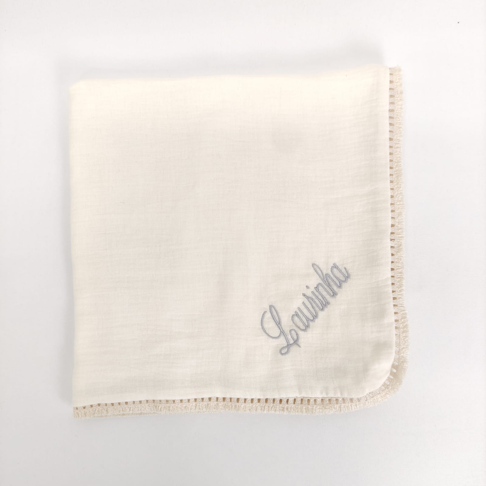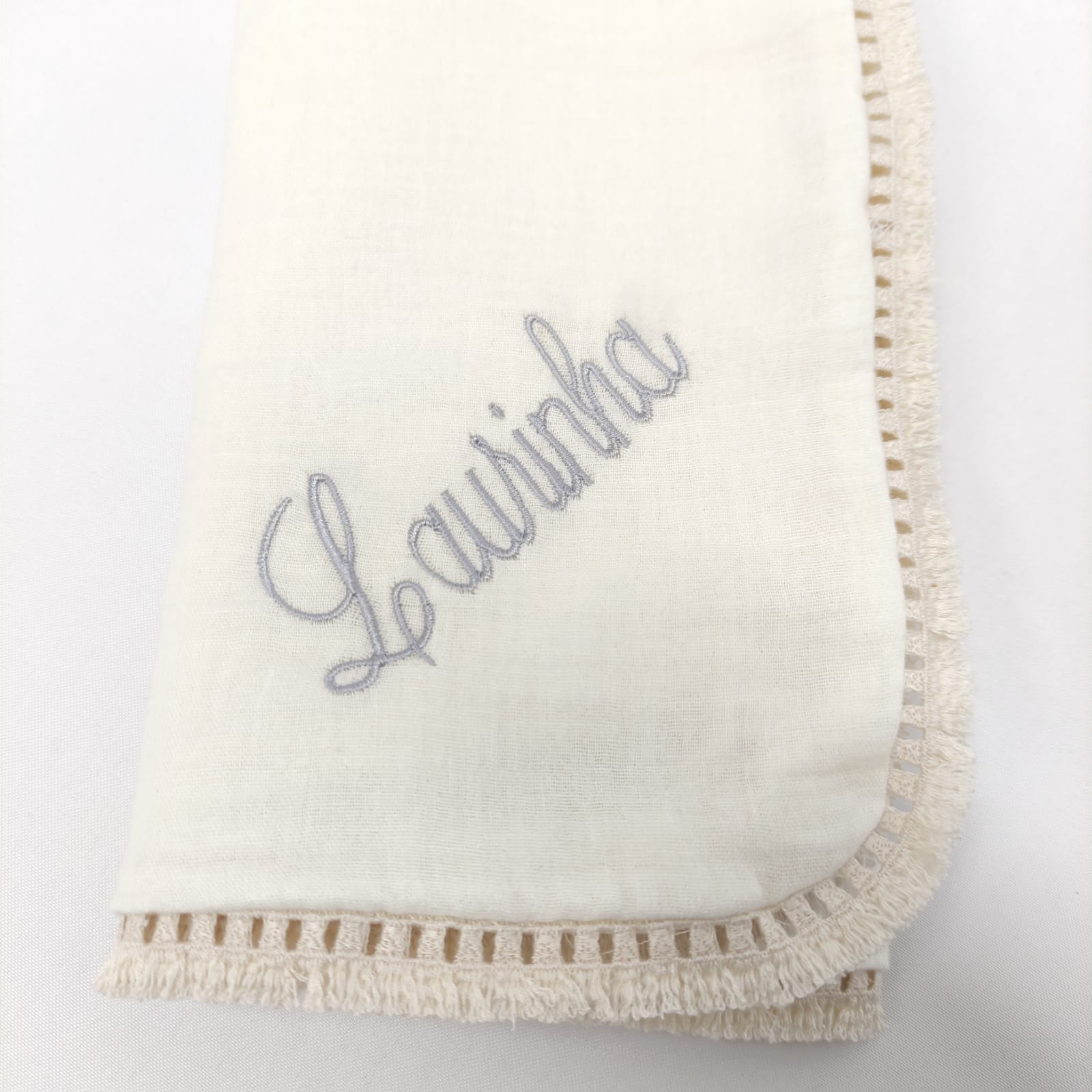 Fralda Dupla musselina bege, com aplicação de renda em franja em bege. Possibilidade de Bordar.