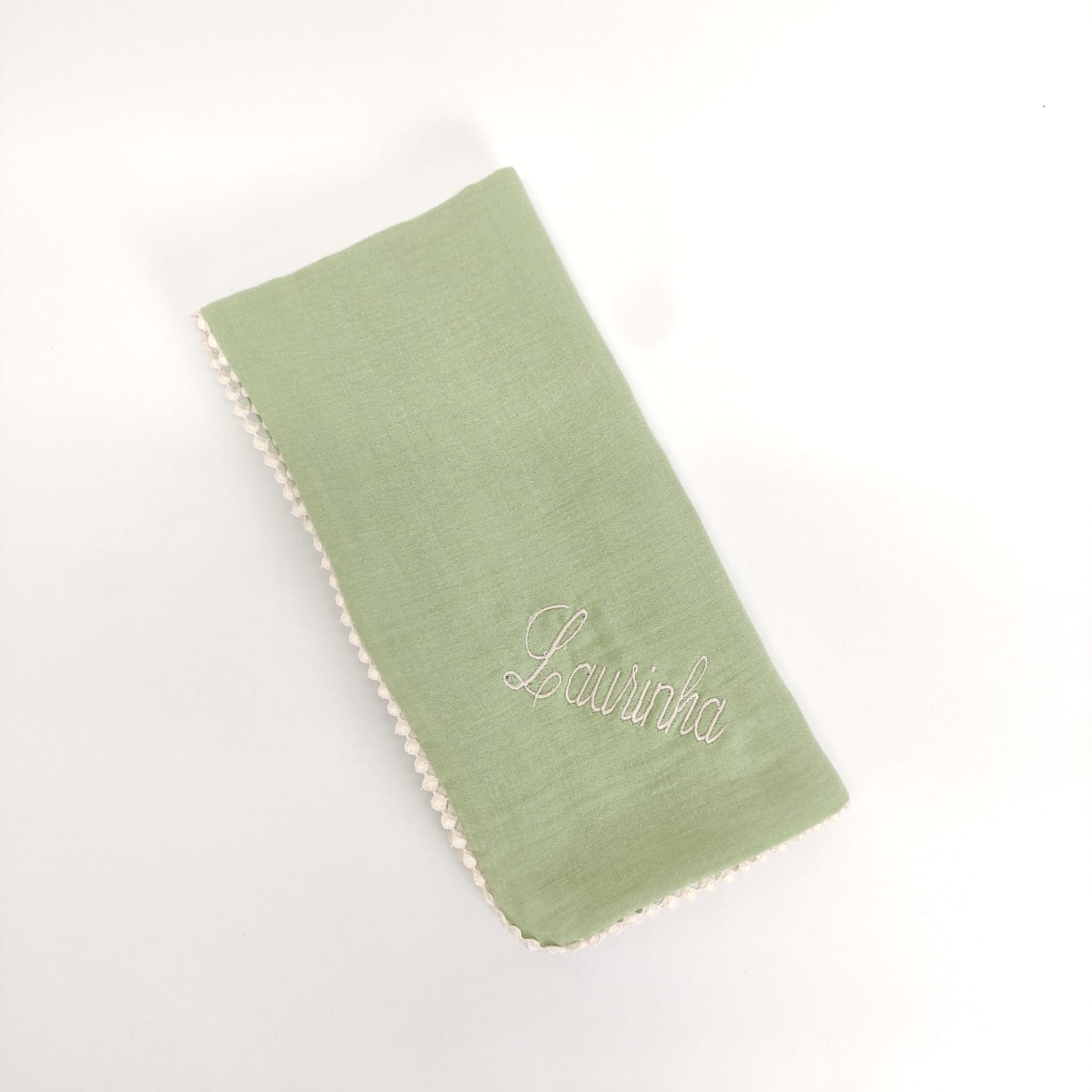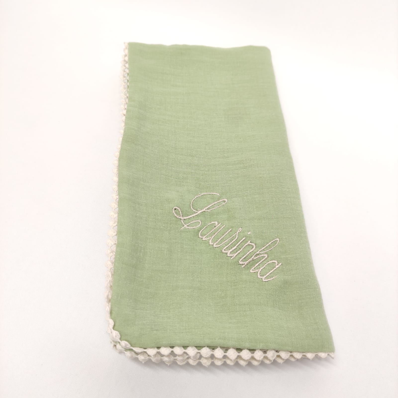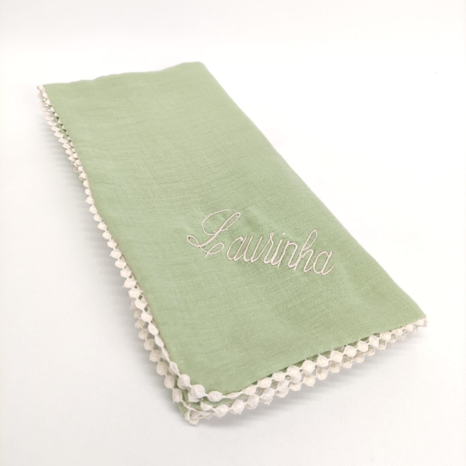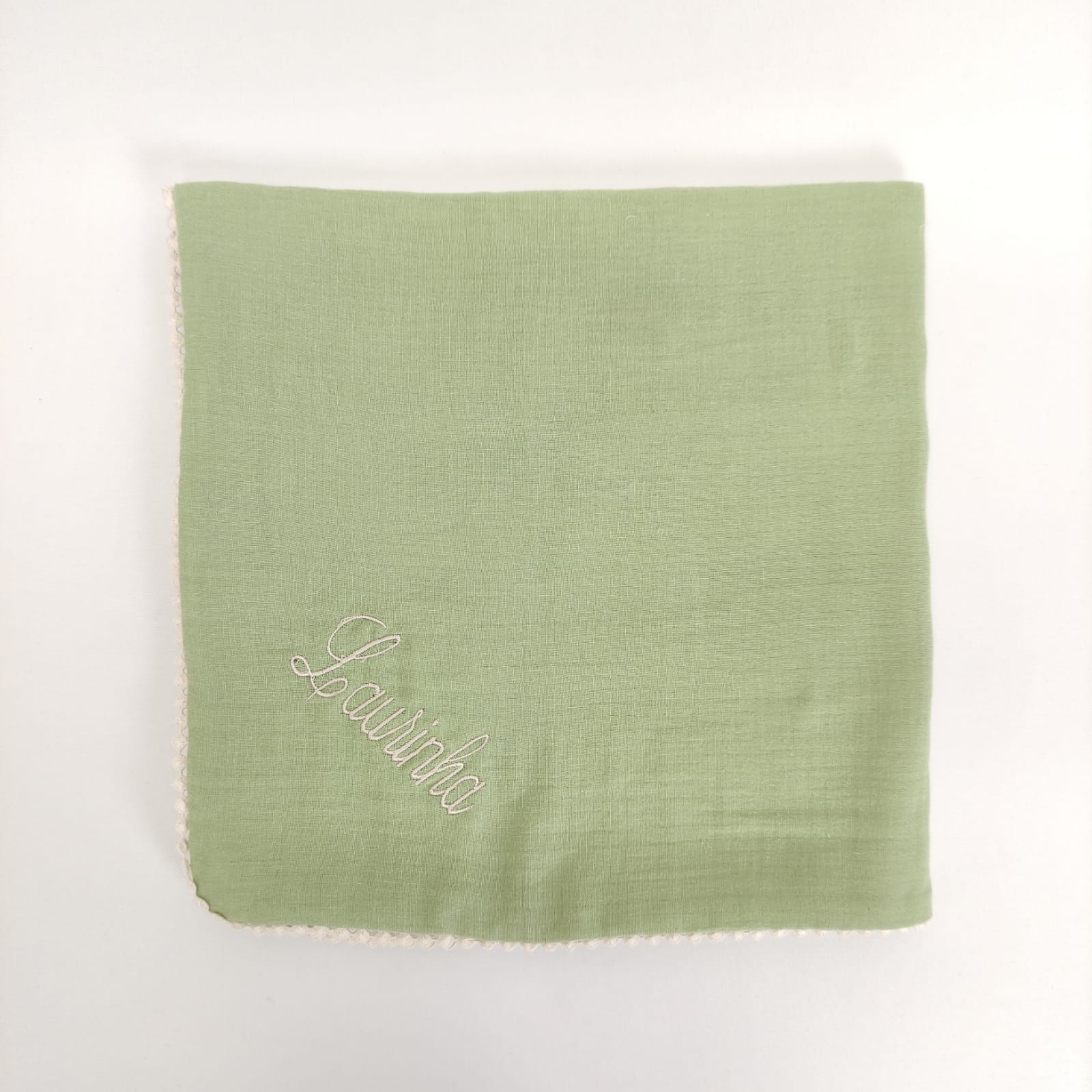 Coleção em musselina de algodão verde com acabamento em renda bege . Possibilidade de Bordar Nome.