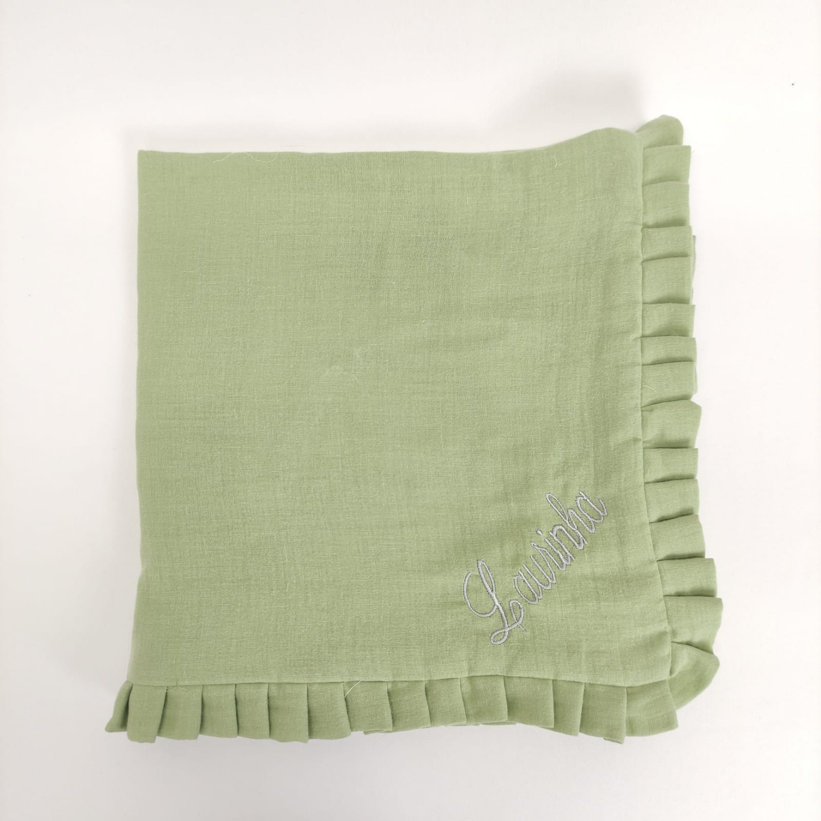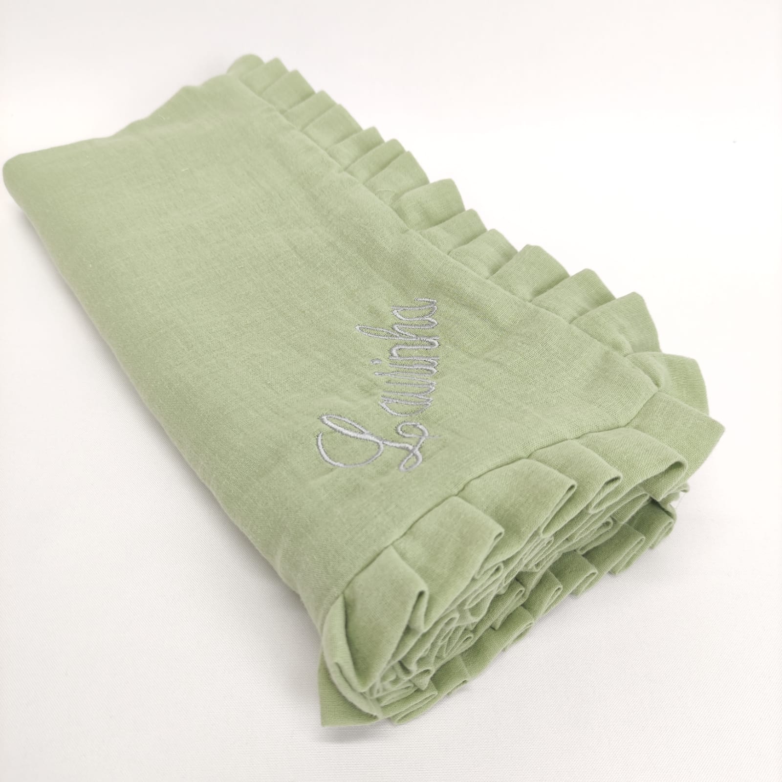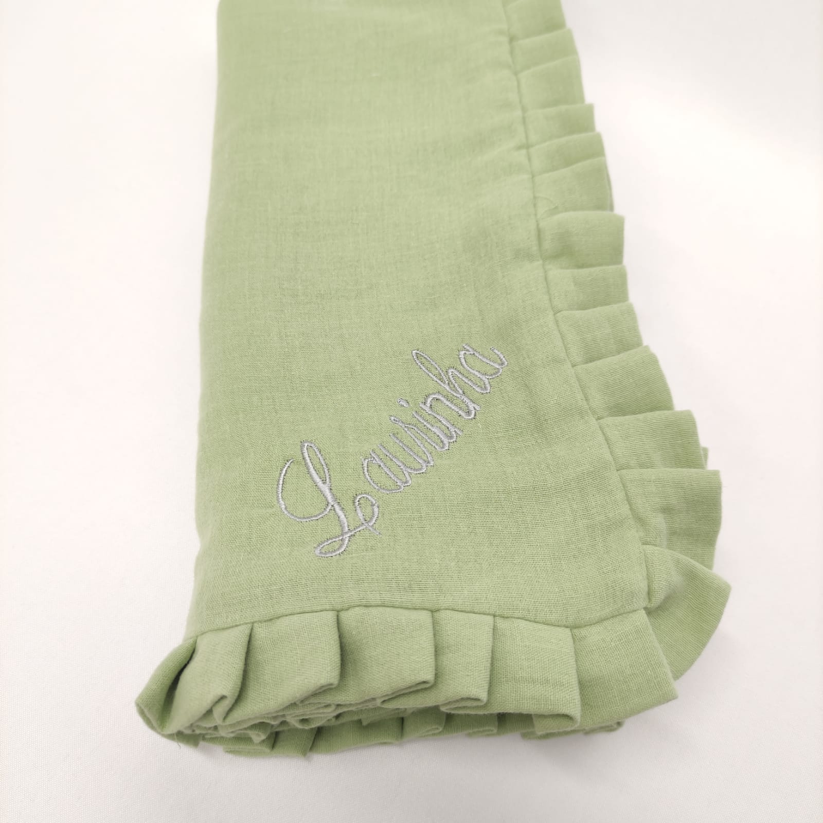 Fralda Dupla musselina Verde, com aplicação de folho da mesma cor. Possibilidade de Bordar.