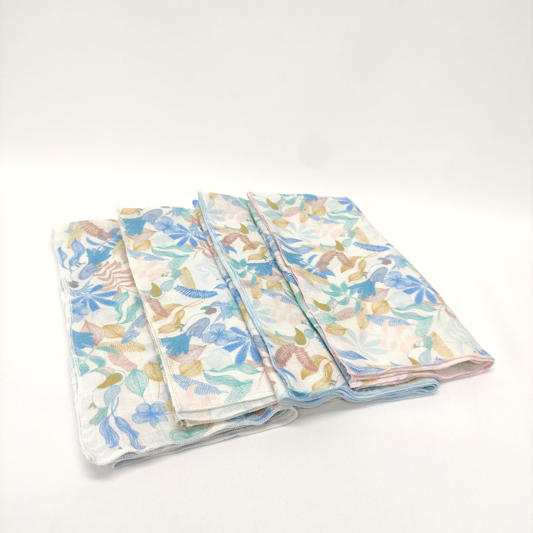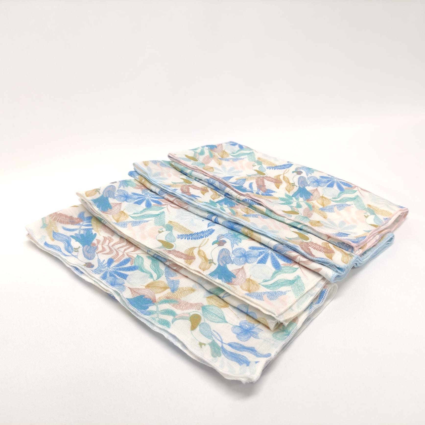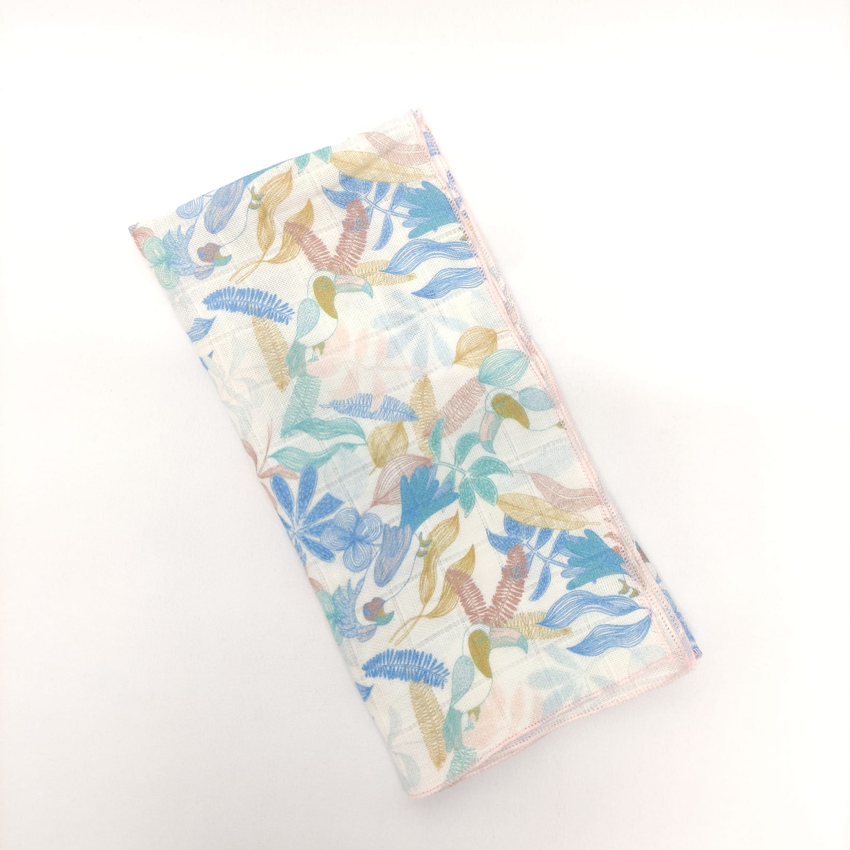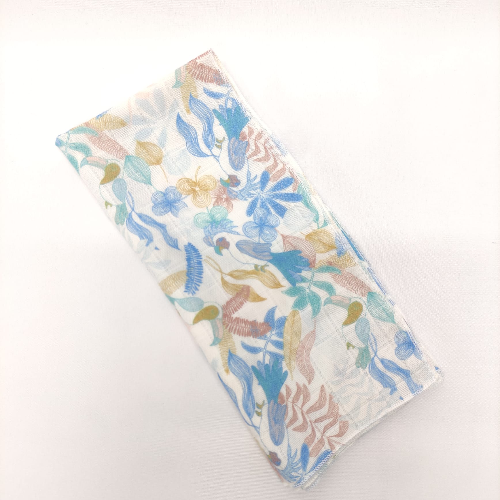 Fralda estampada em algodão. Detalhe de acabamento em rolinho.