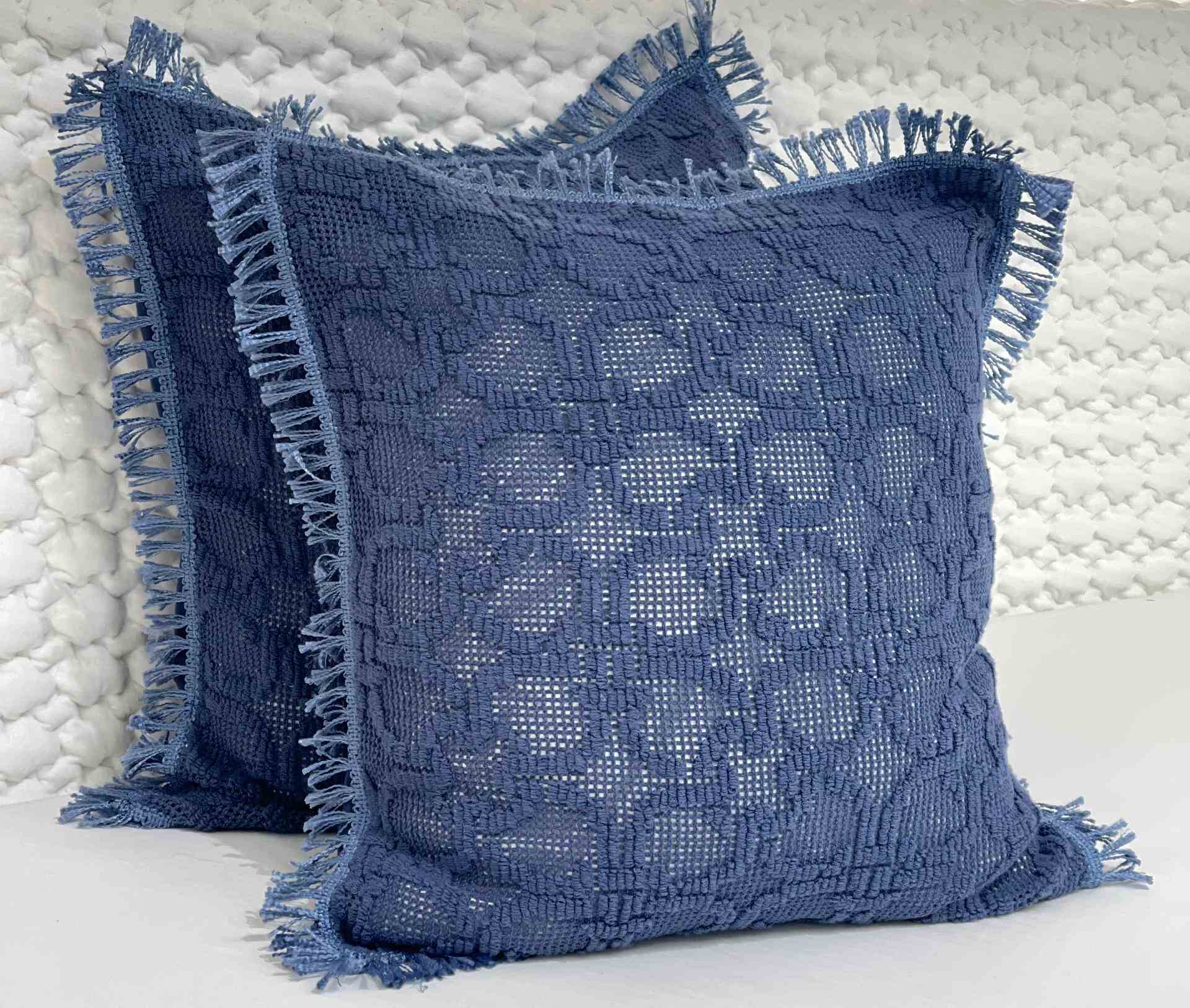 Fronha de almofada decorativa. Modelo em azul escuro, com trabalhado e detalhe de franja a toda a volta.