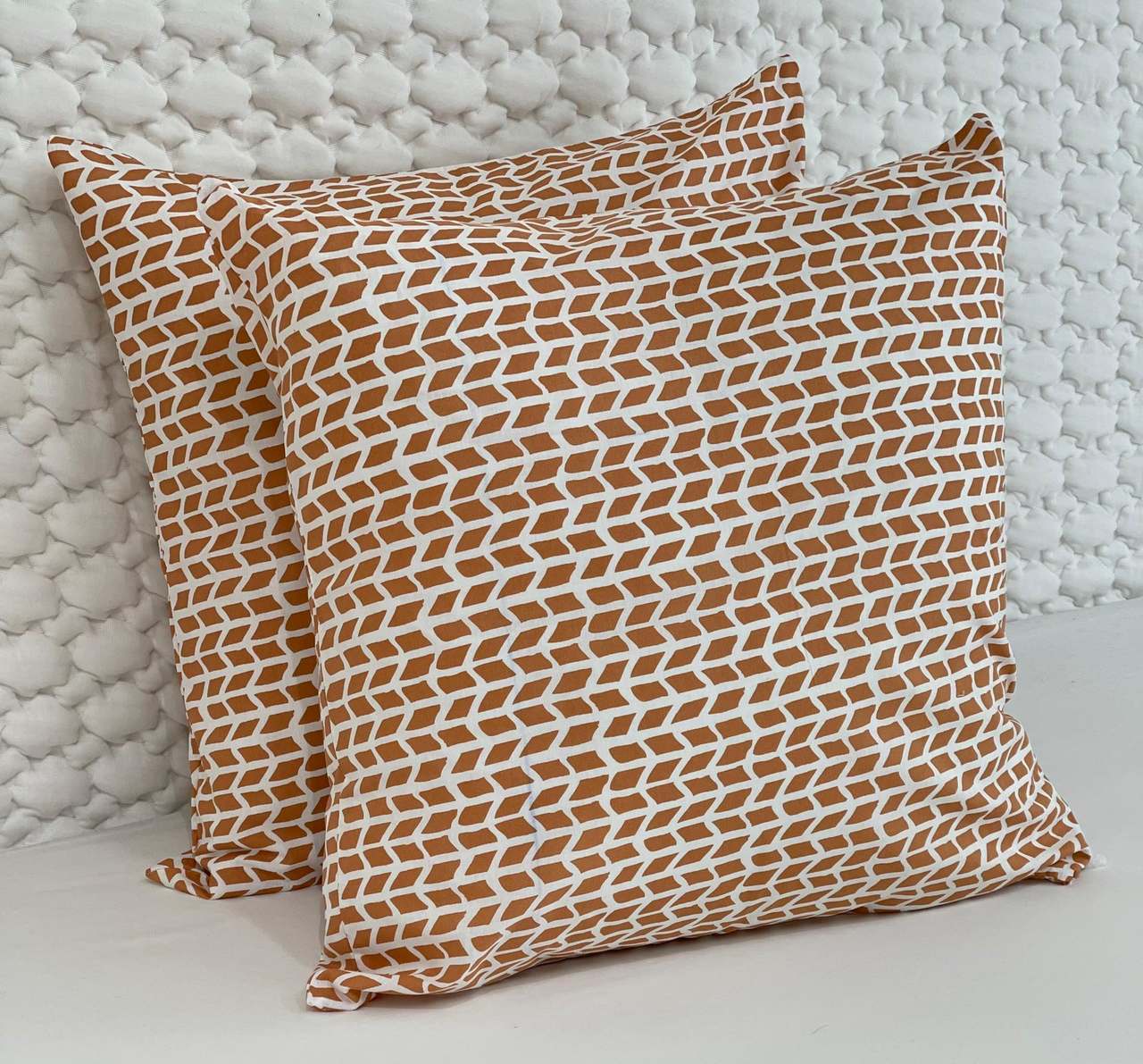 Fronha almofada decorativa com fecho. Modelo com padrão em tons de caramelo e branco.