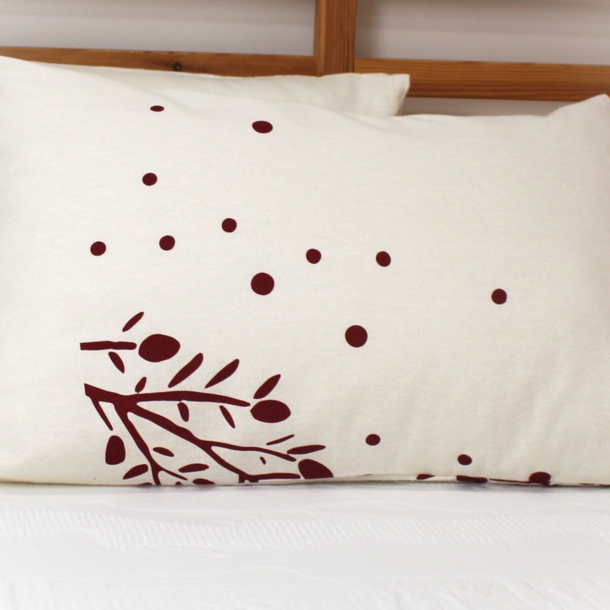 Fronha almofada de Flanela em tons de pérola estampado com elementos vermelhos.