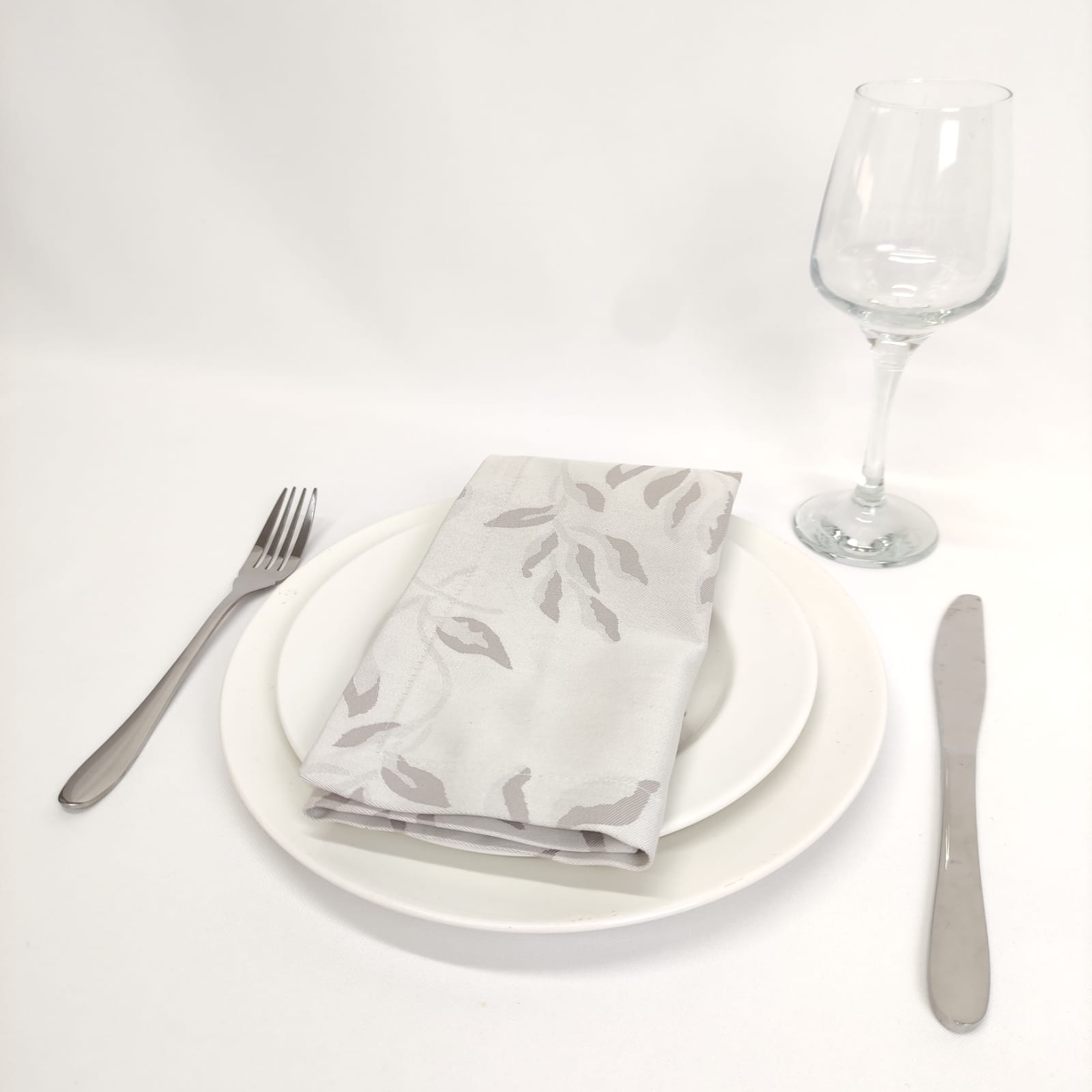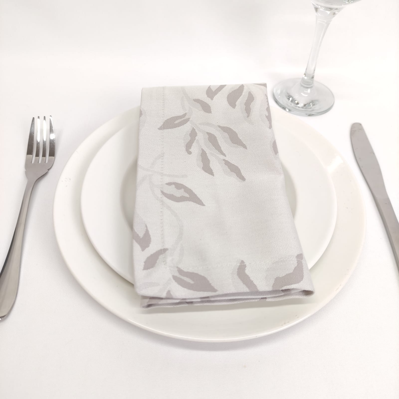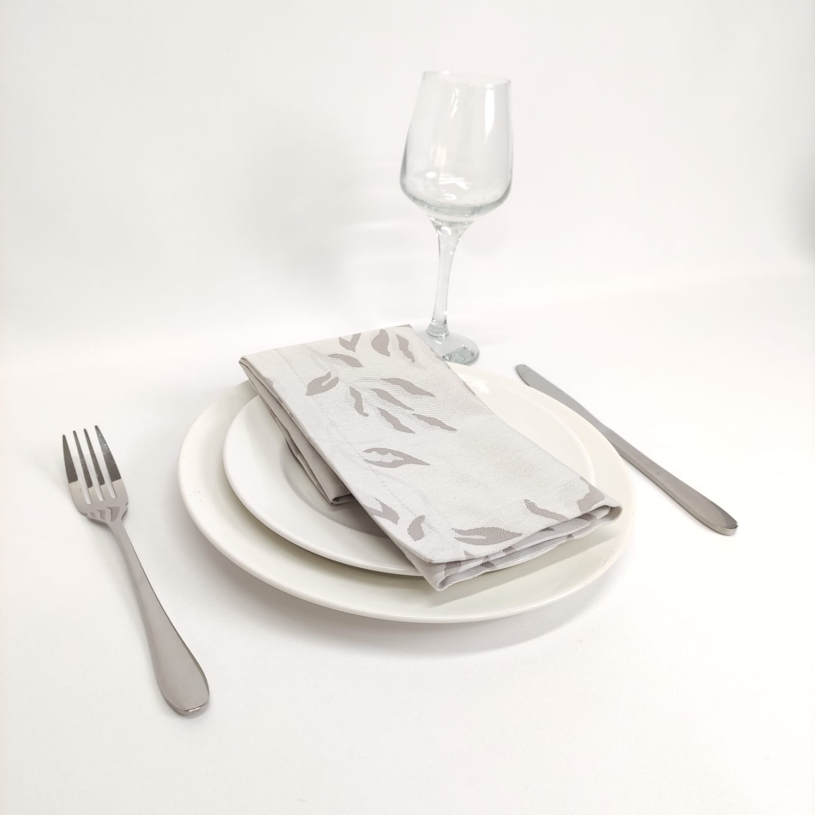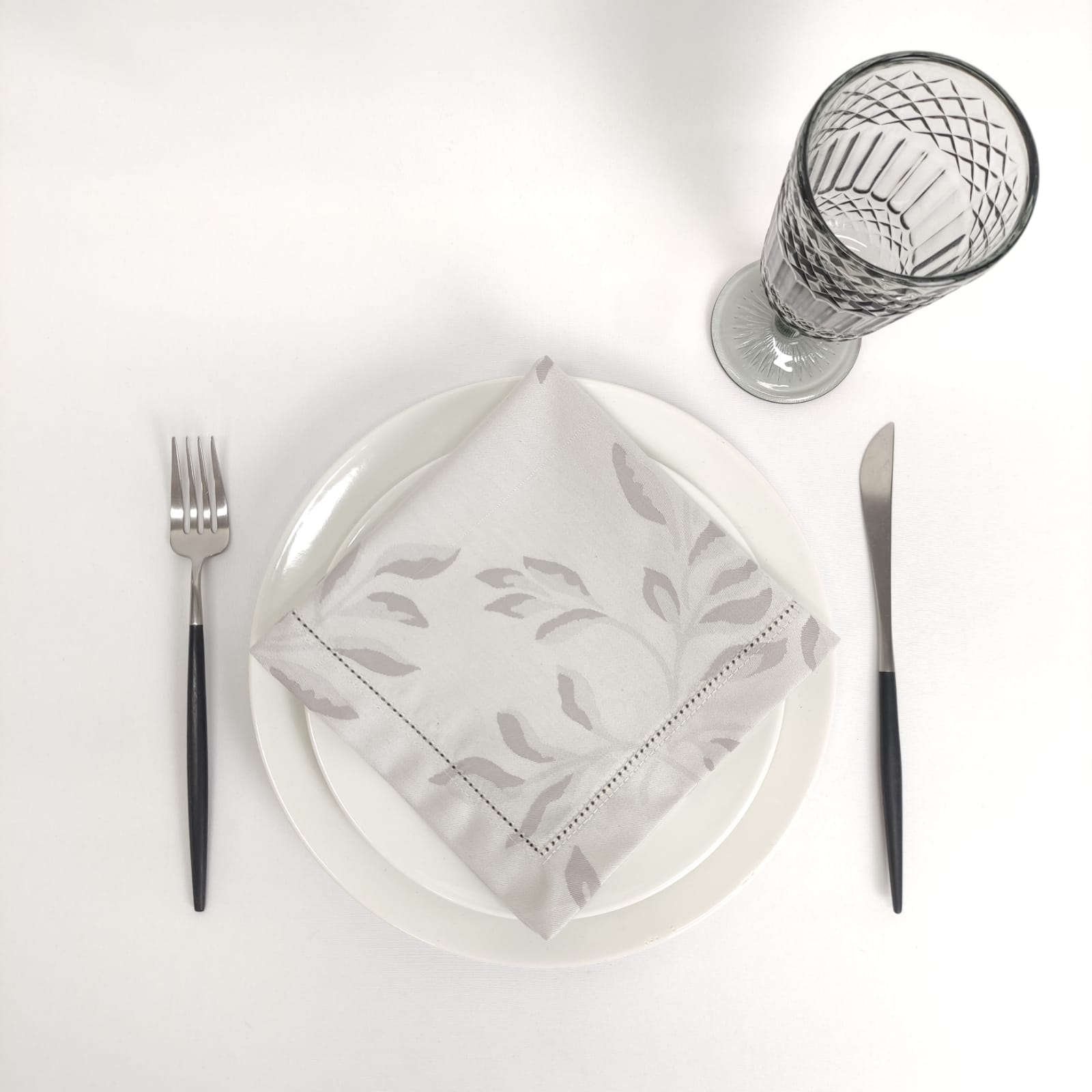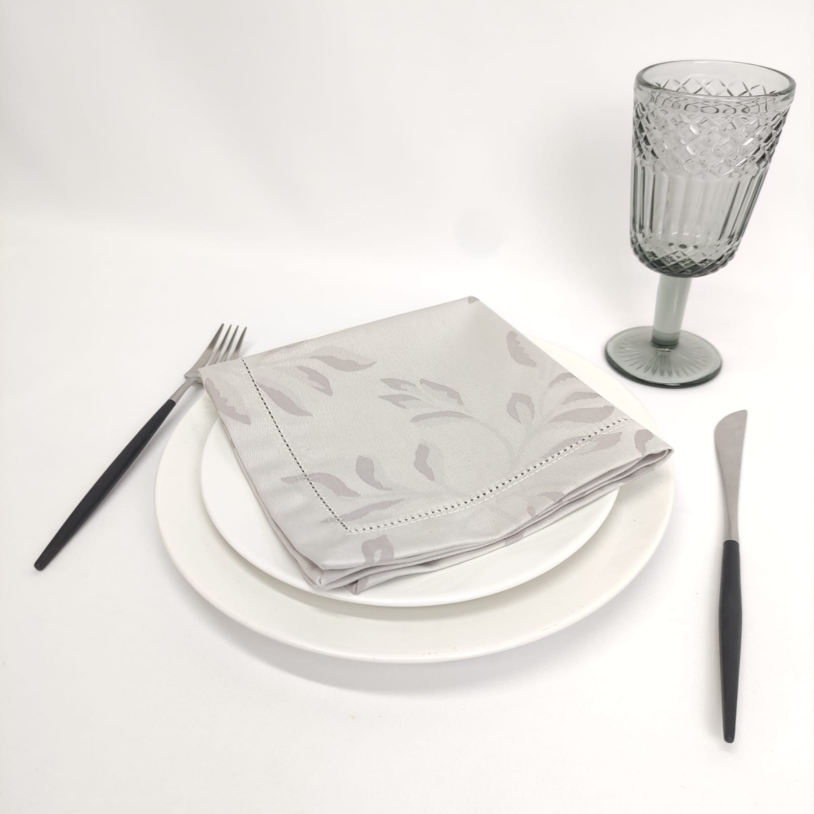 Guardanapo em algodão acetinado Cinza, com padrão de folhas. Disponivel com acabamento de bainha inglesa, e ponto aberto.