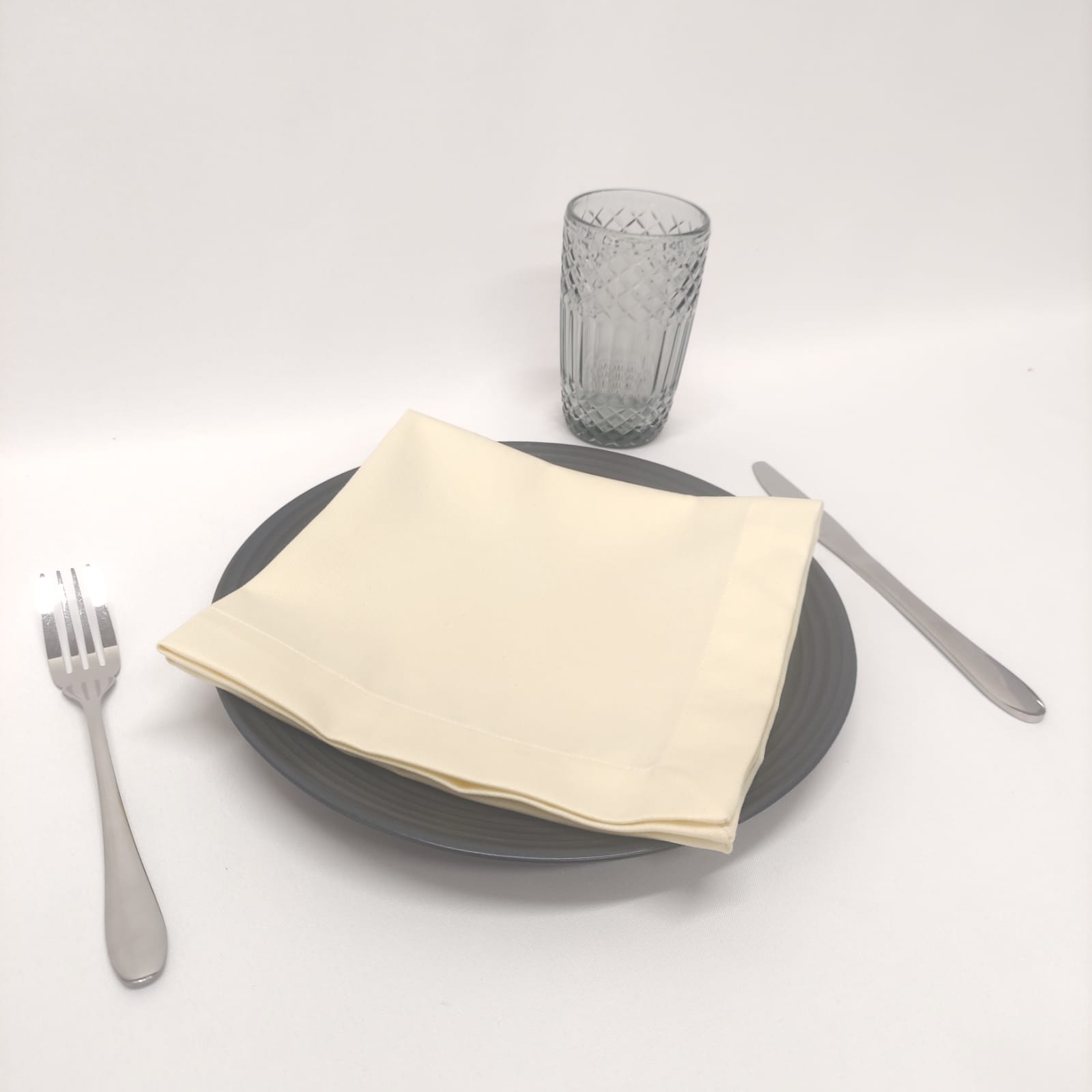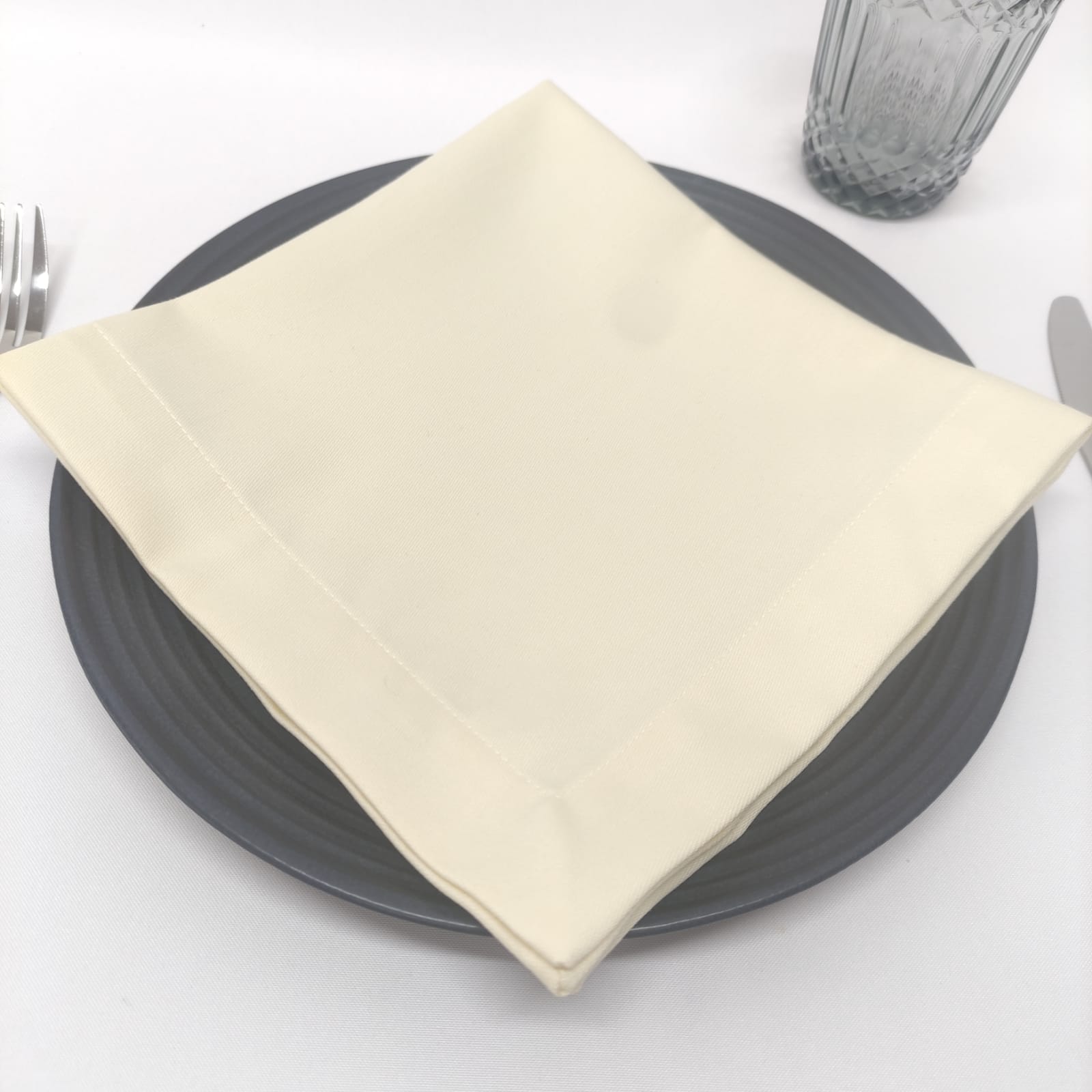 Guardanapo algodão bege liso, com acabamento de bainha inglesa de 3cm.