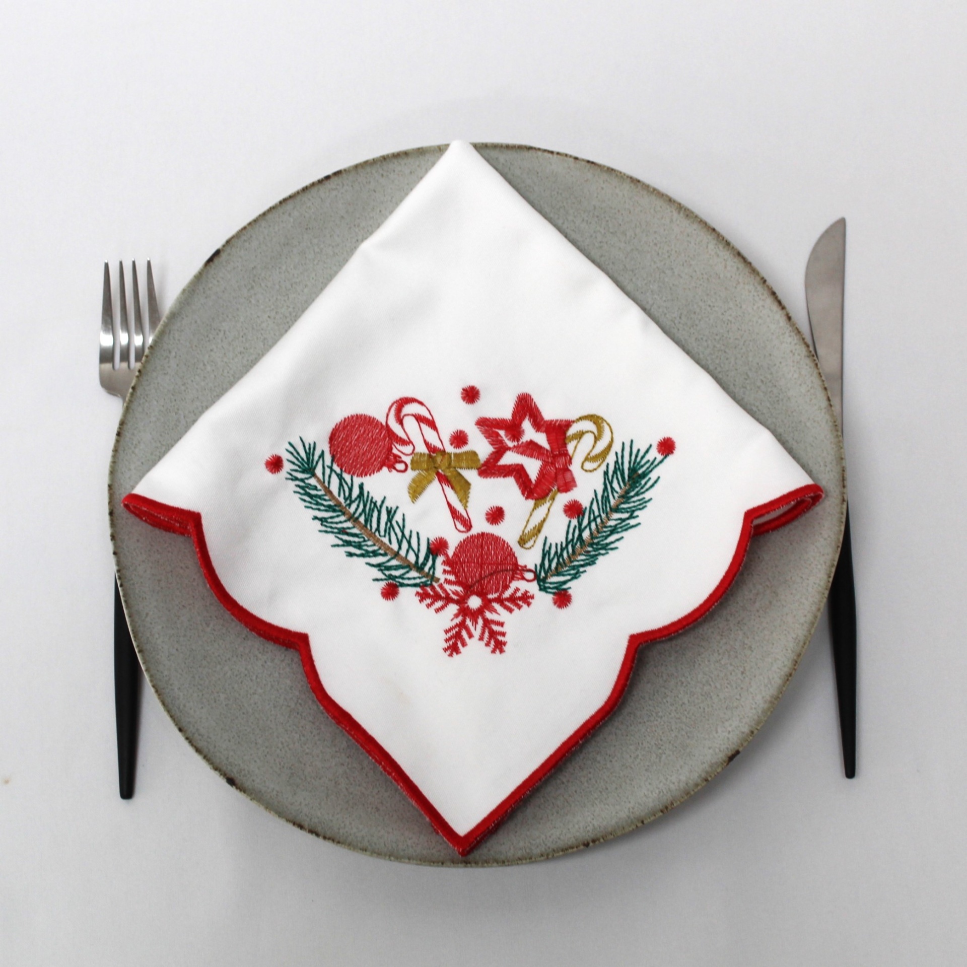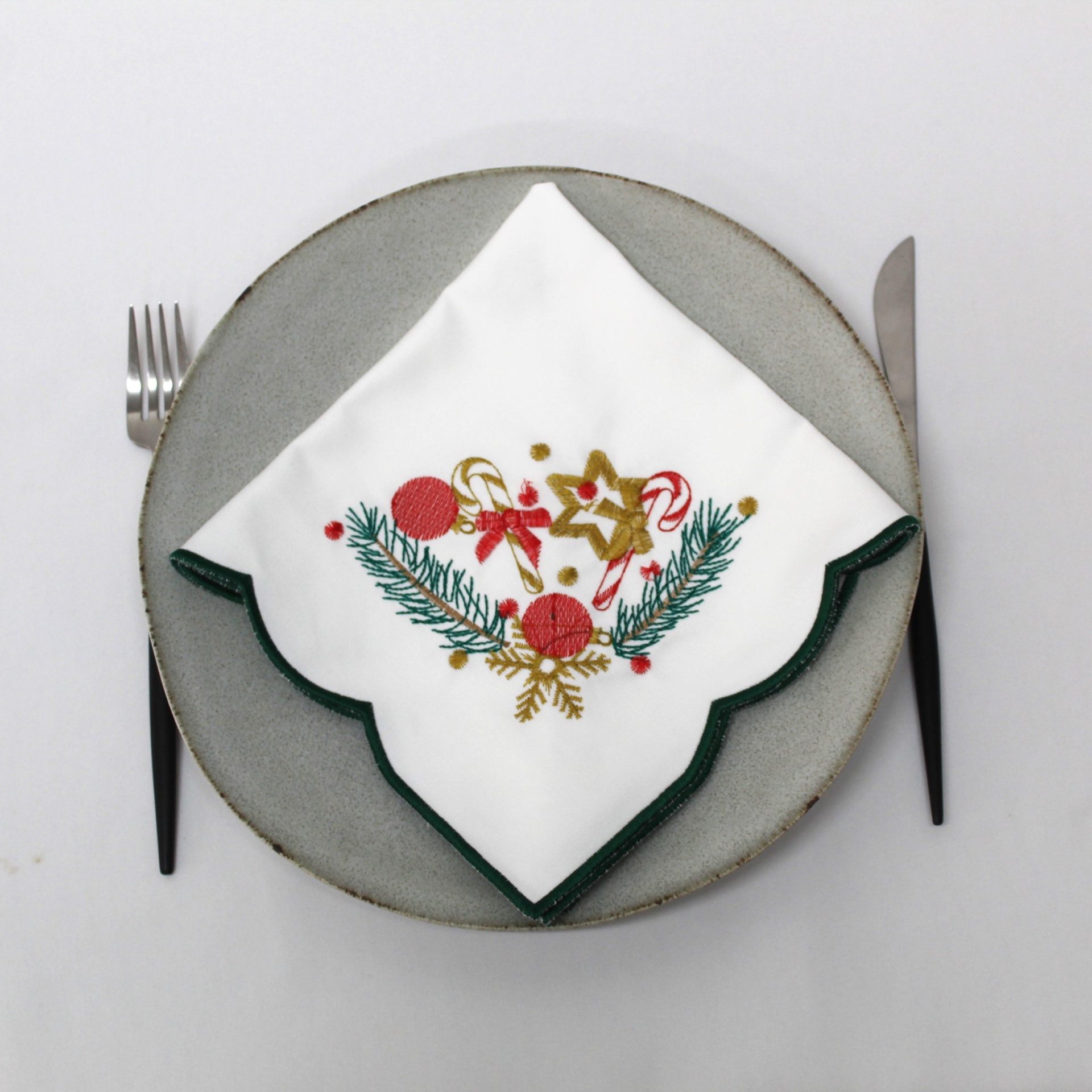 Guardanapo em tecido branco com relevo e acabamento em rolinho.