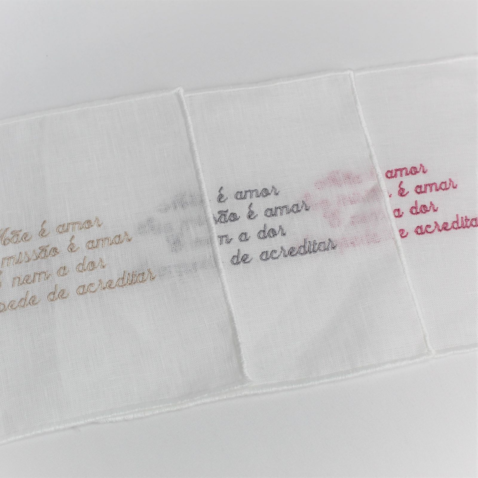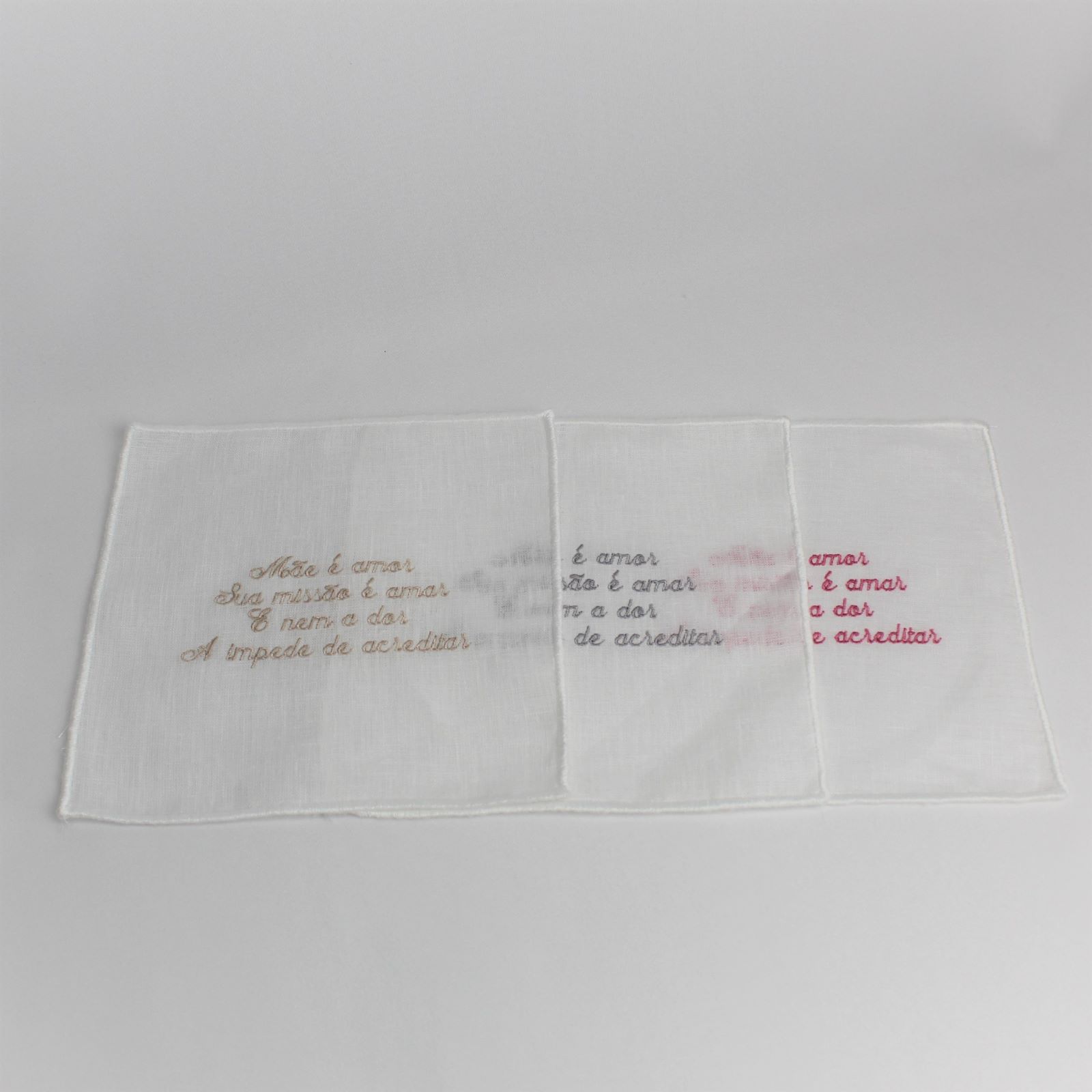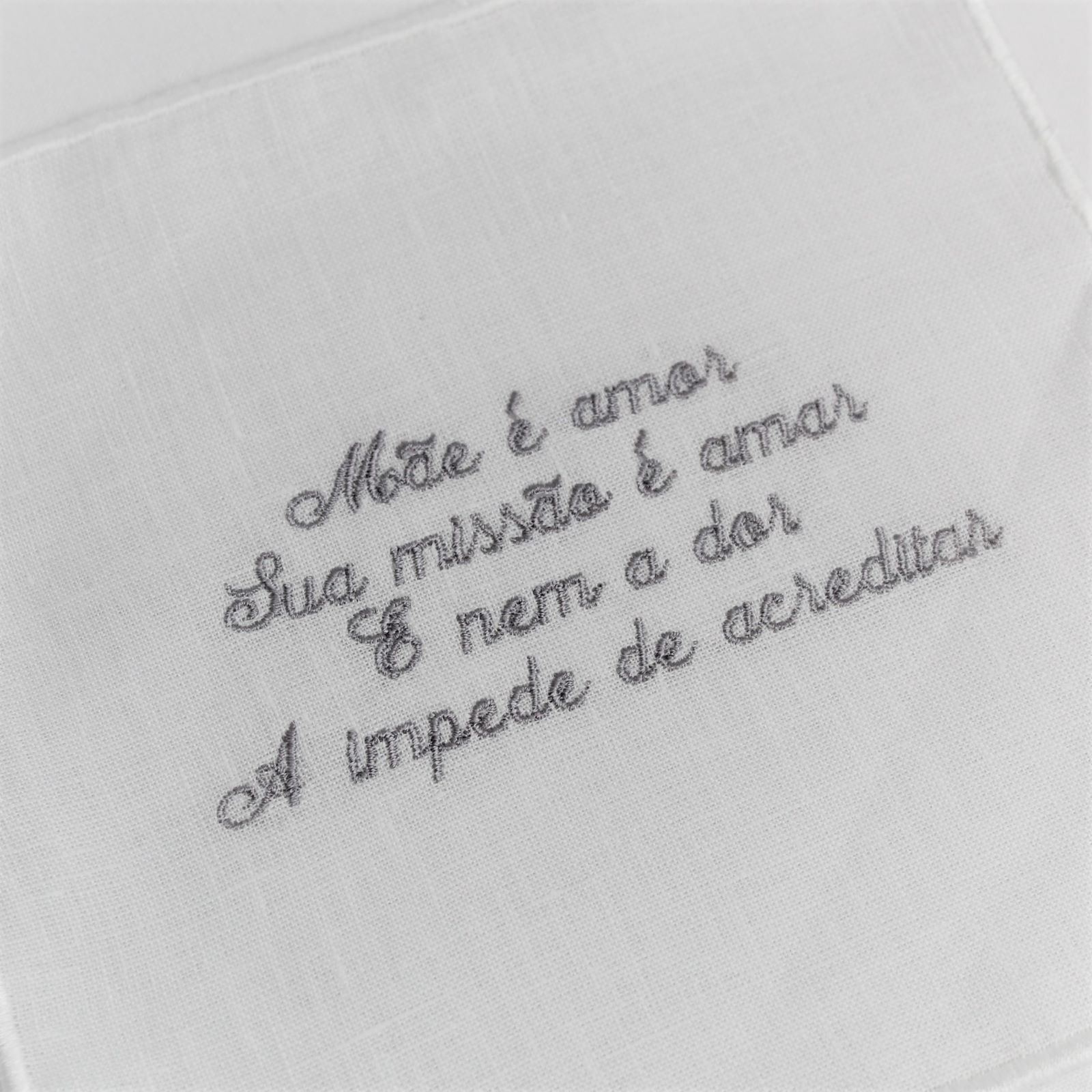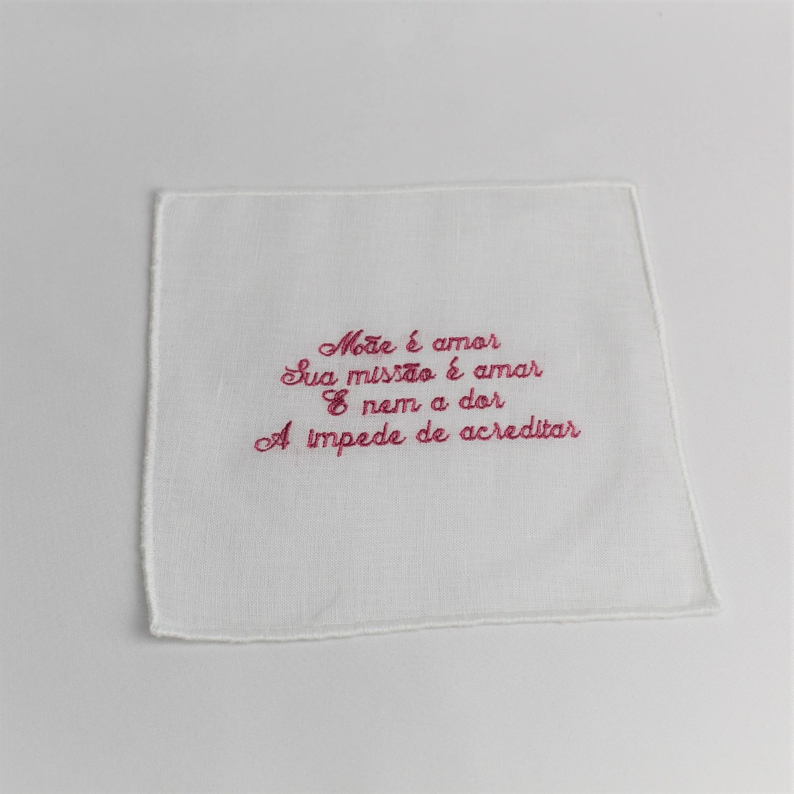 Guardanapo de Cocktail em linho, com acabamento de rolinho branco e aplicação de frase Bordada.