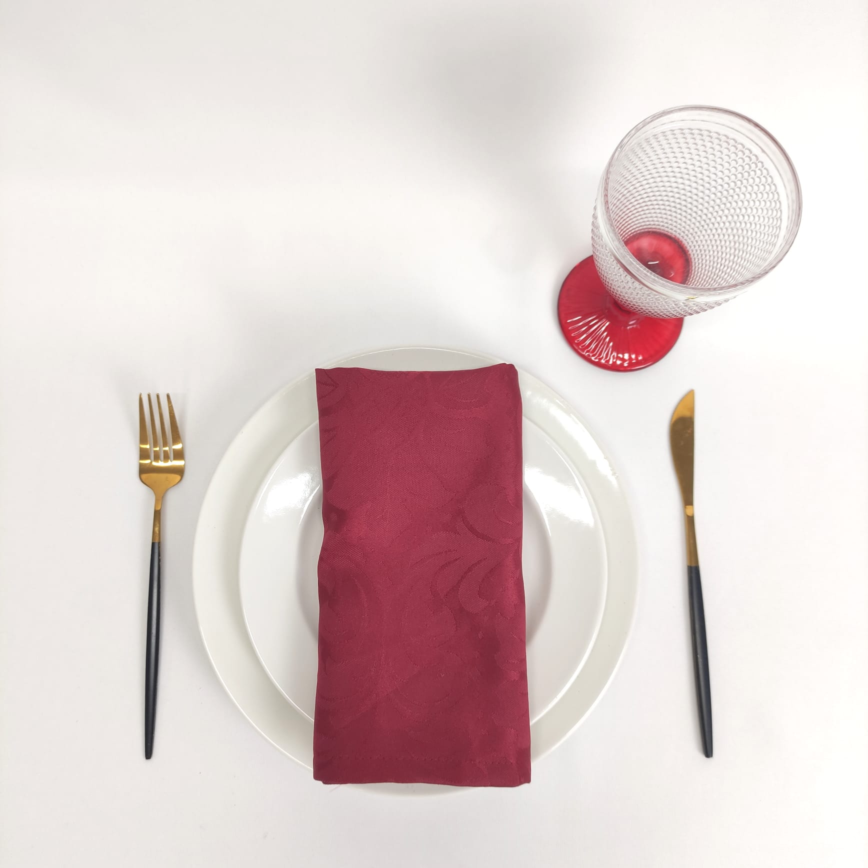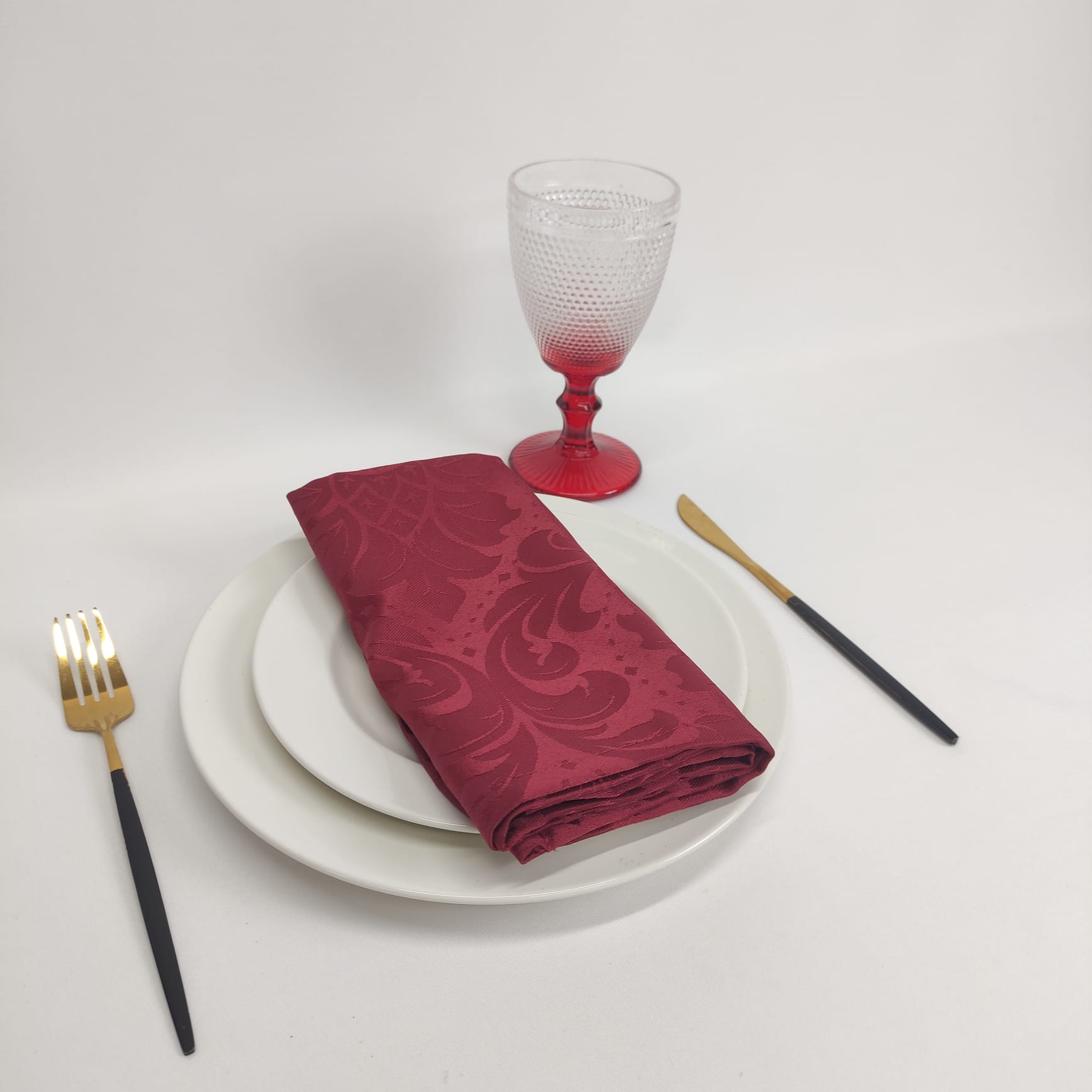 Guardanapo em tecido algodão bordô jacquard acetinado, muito macio e de fácil lavagem e secagem. Acabamento bainha inglesa 1cm.