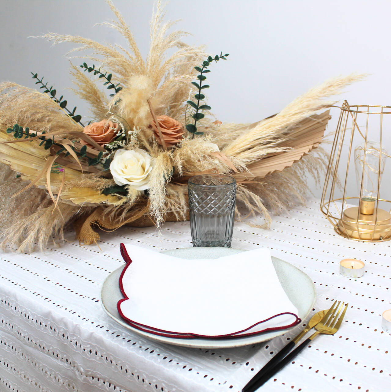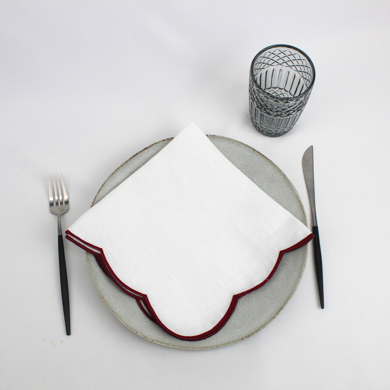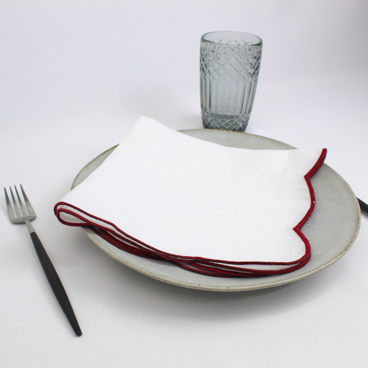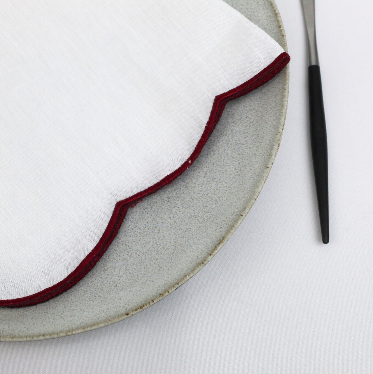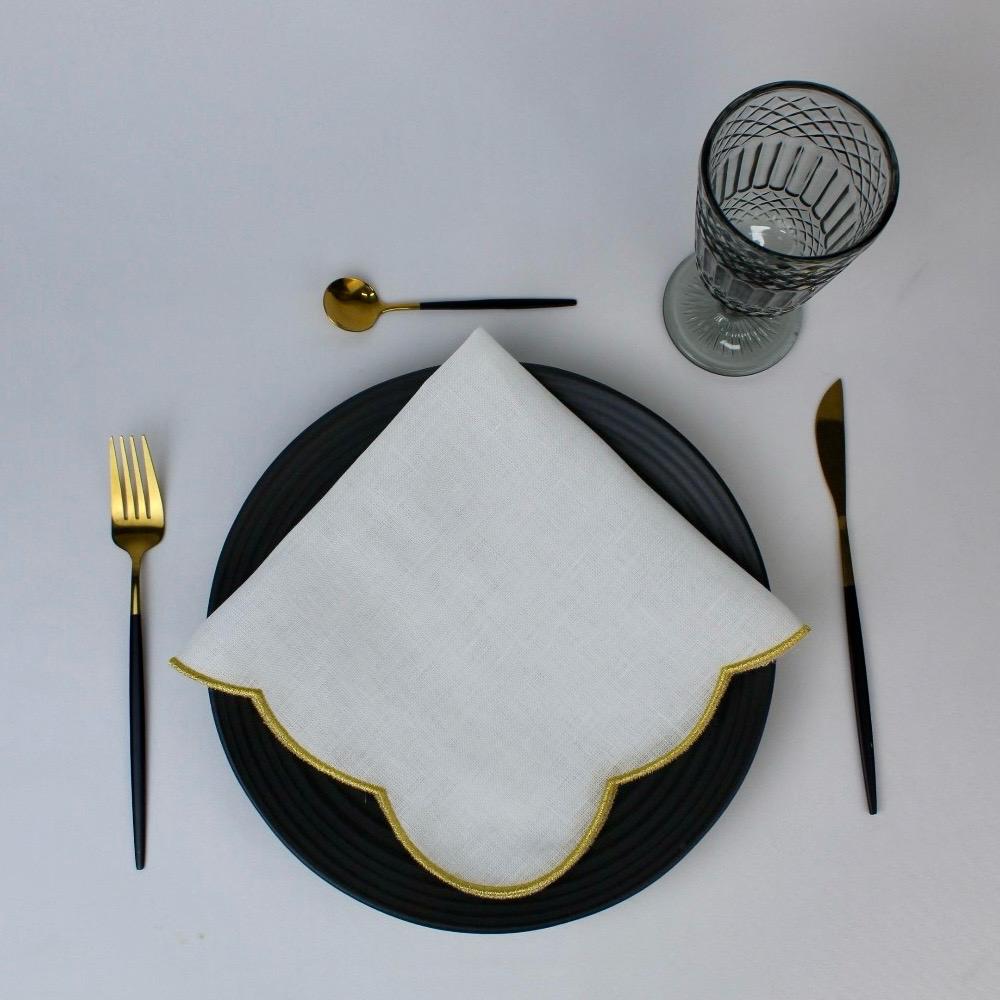 Guardanapo em linho branco com detalhe de rolinho em cor.