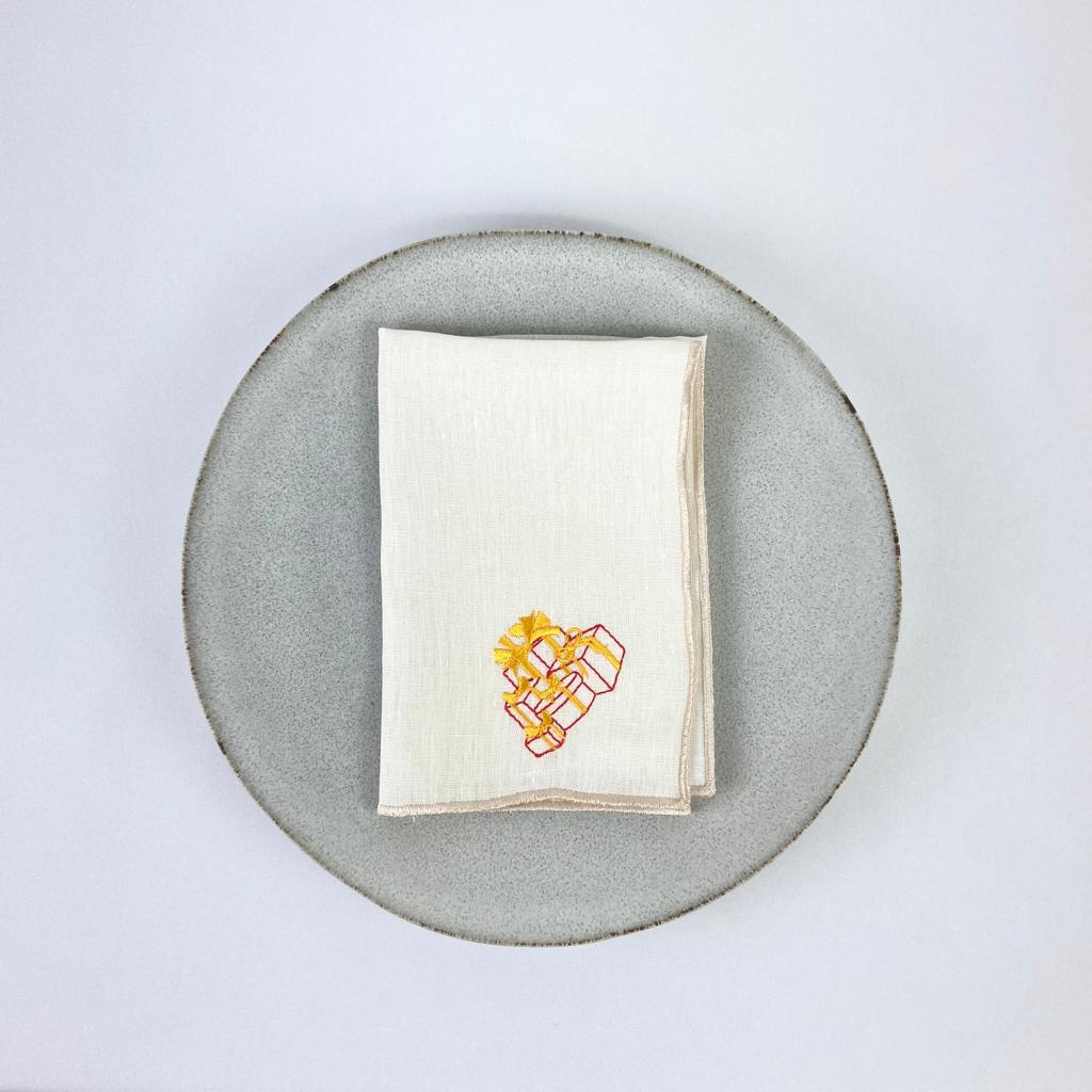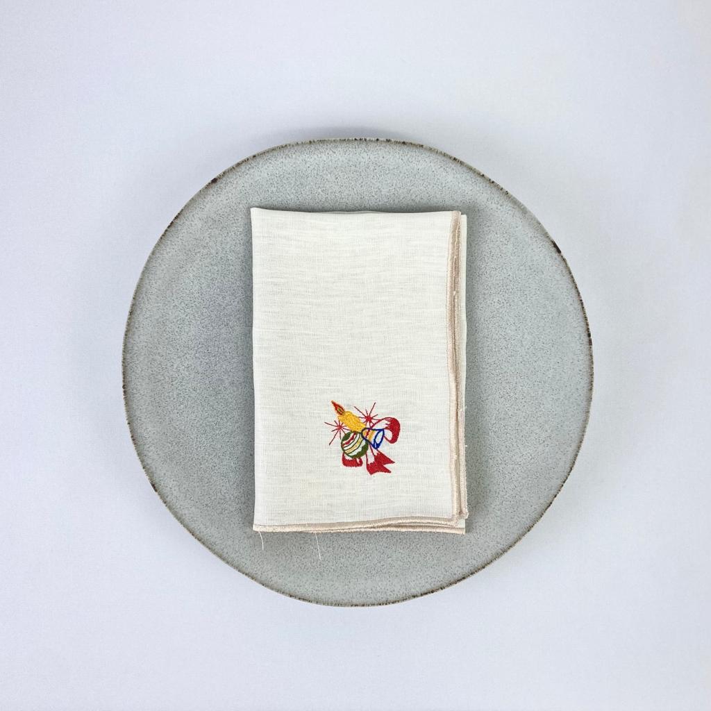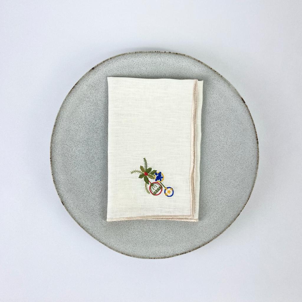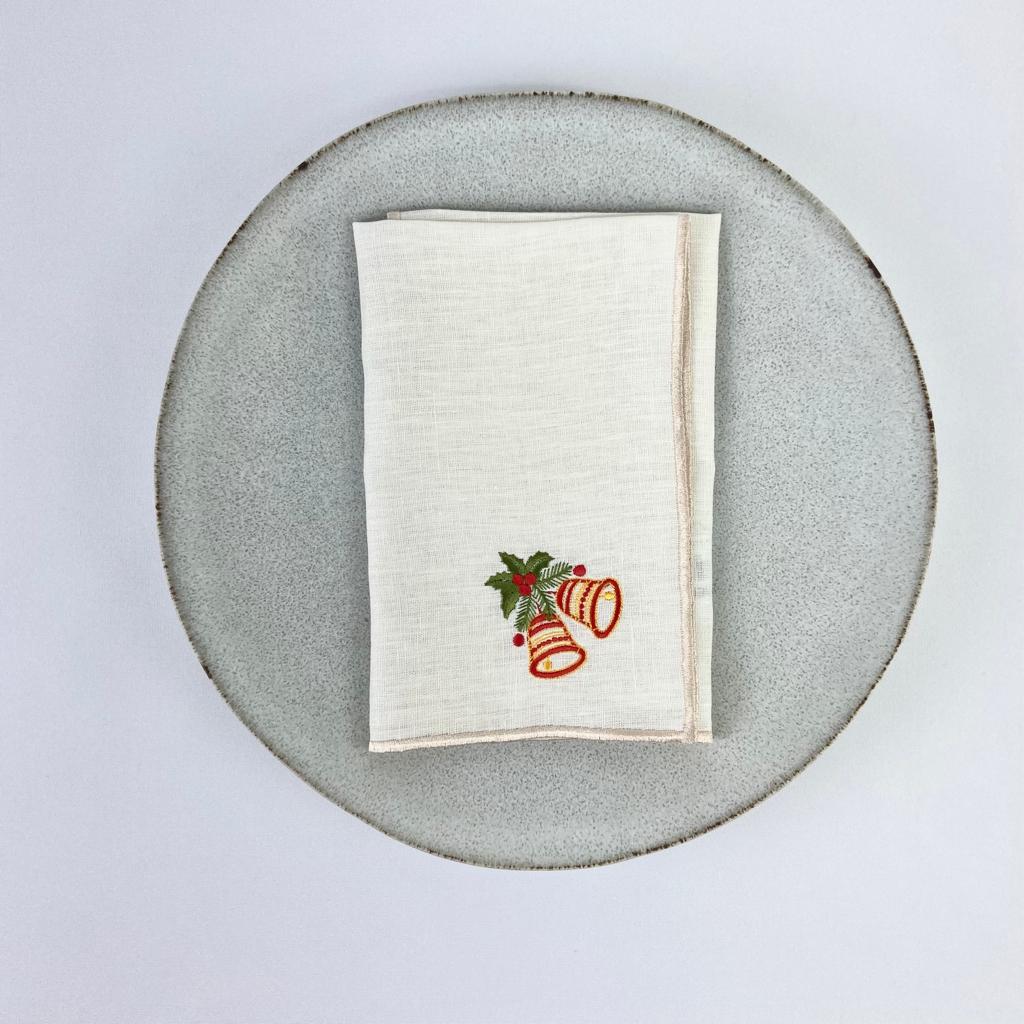 Guardanapo em linho bege, com acabamento em rolinho e bordado natalicio.