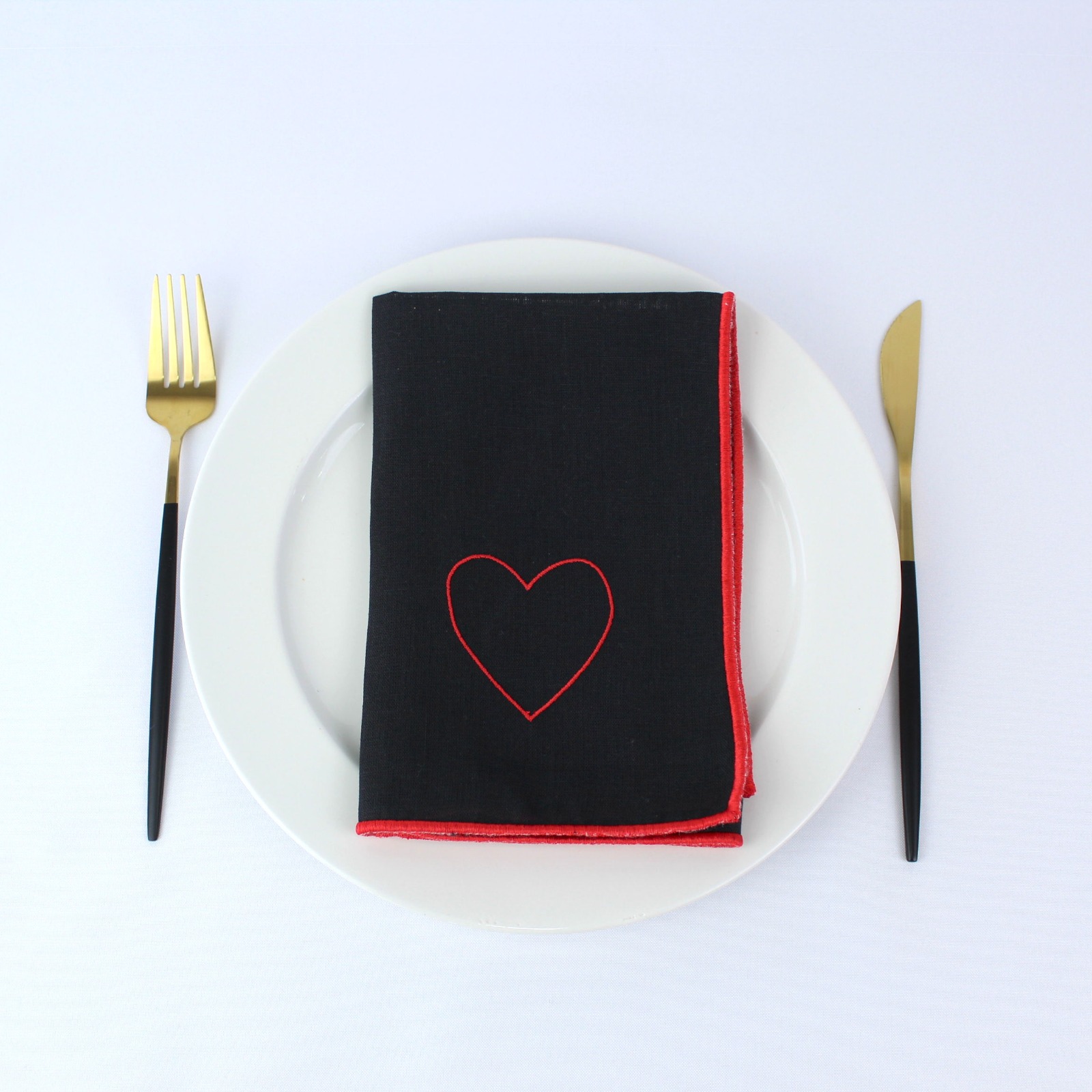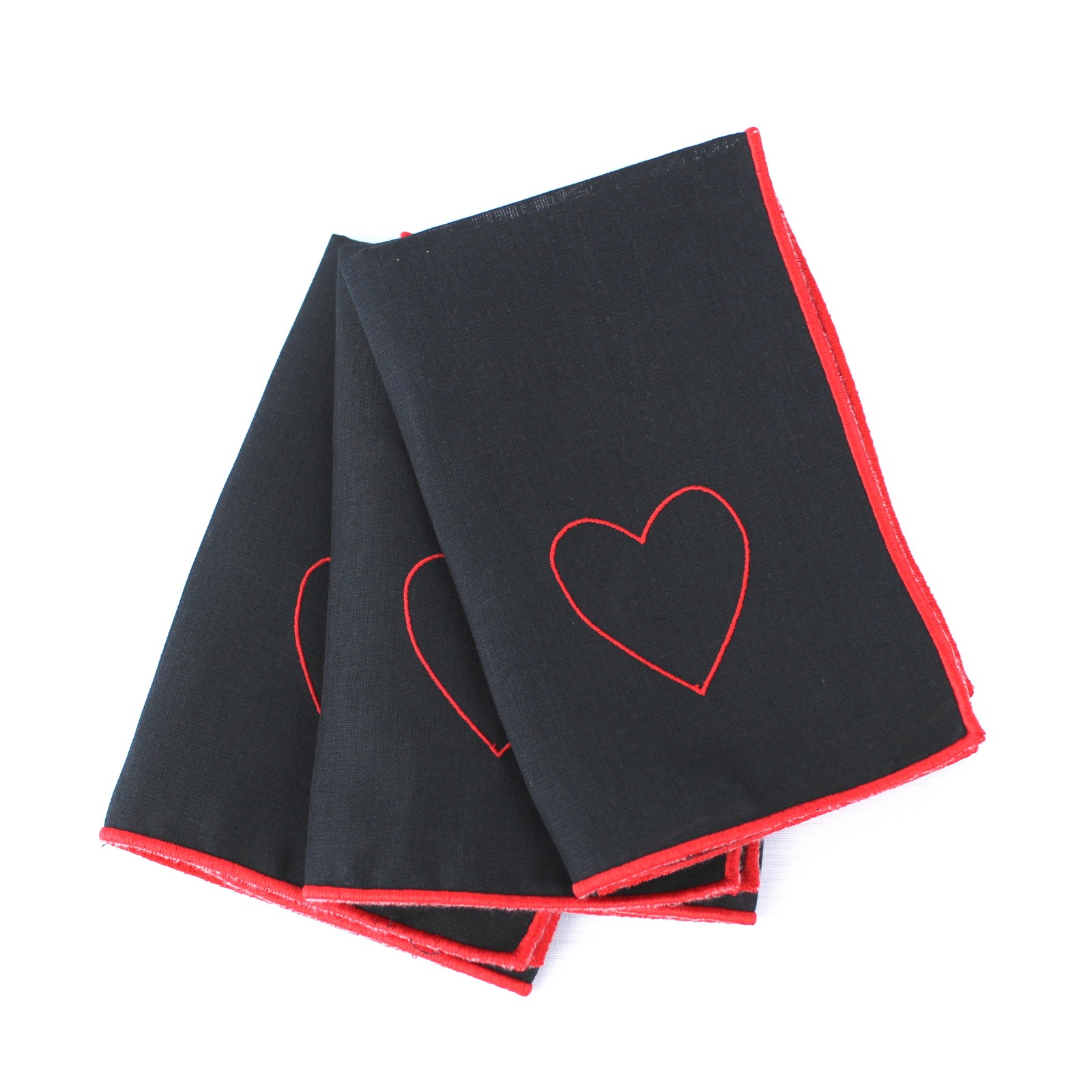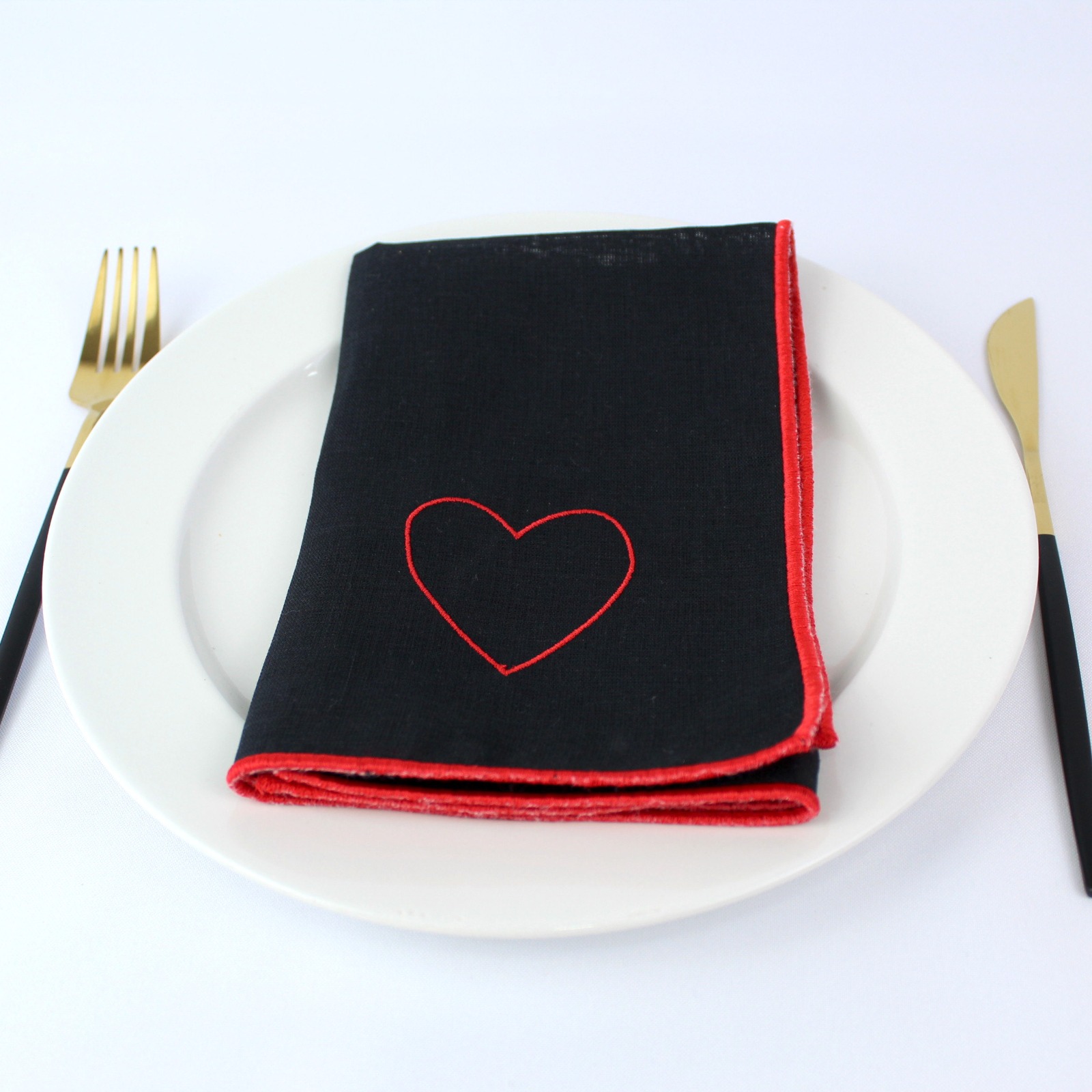 Guardanapo em Linho preto, com coração bordado a vermelho.