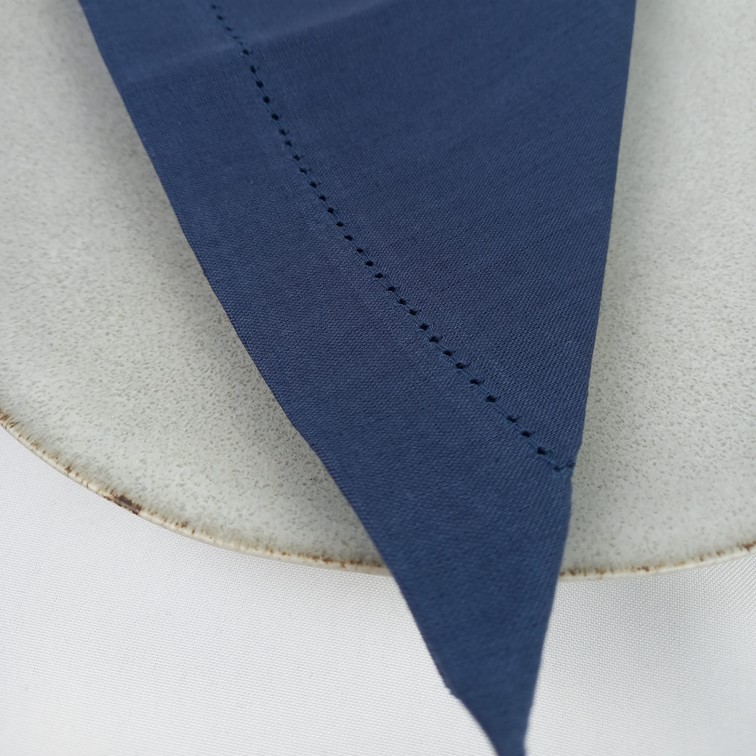 Guardanapo Costura Criativa Azul Marinho, em linho liso azul com acabamento de ponto aberto.