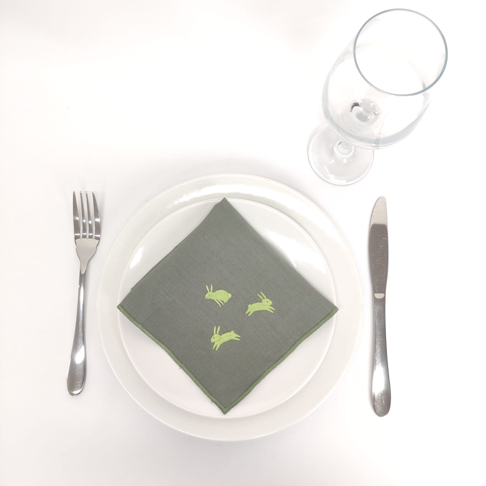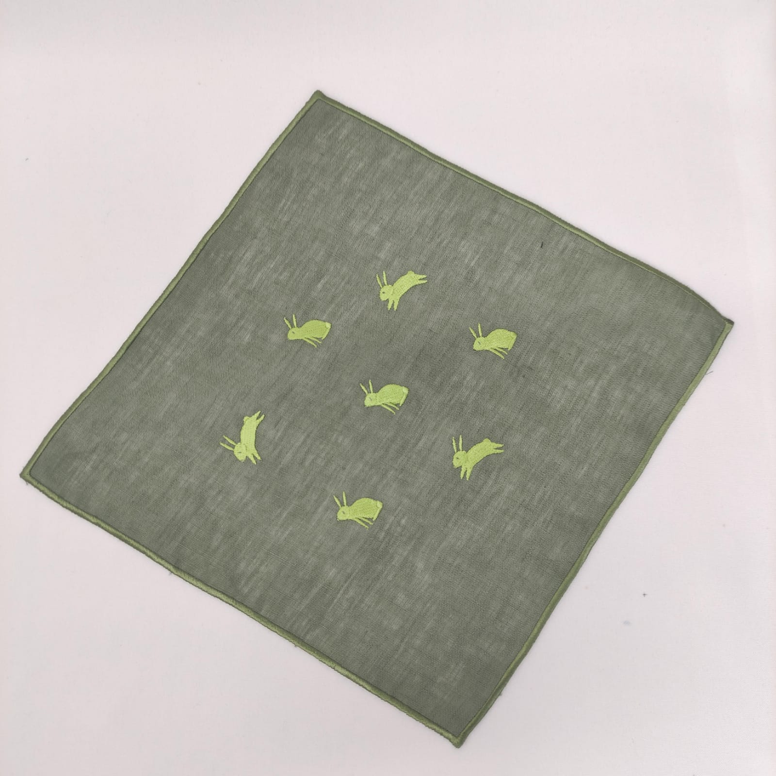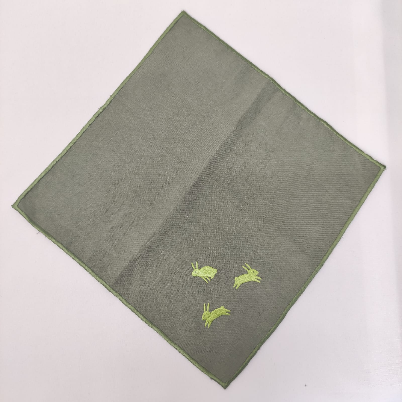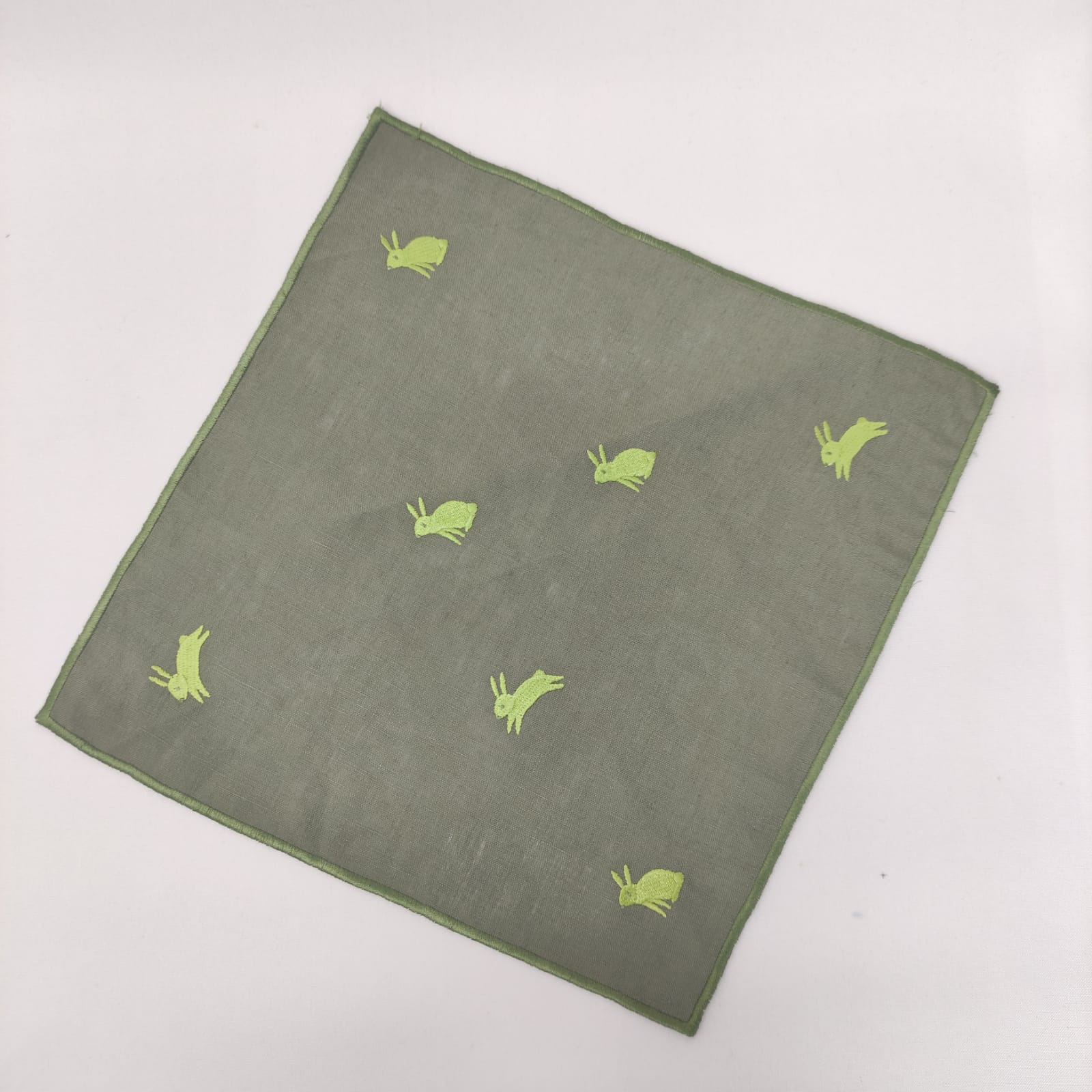 Guardanapo de Cocktail, em linho verde escuro, com acabamento de rolinho verde escuro, e aplicação de Bordado de Coelhinhos.