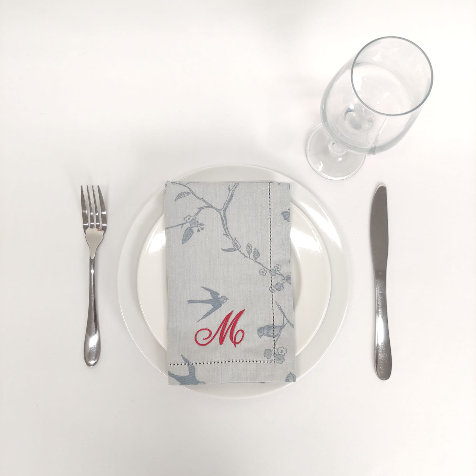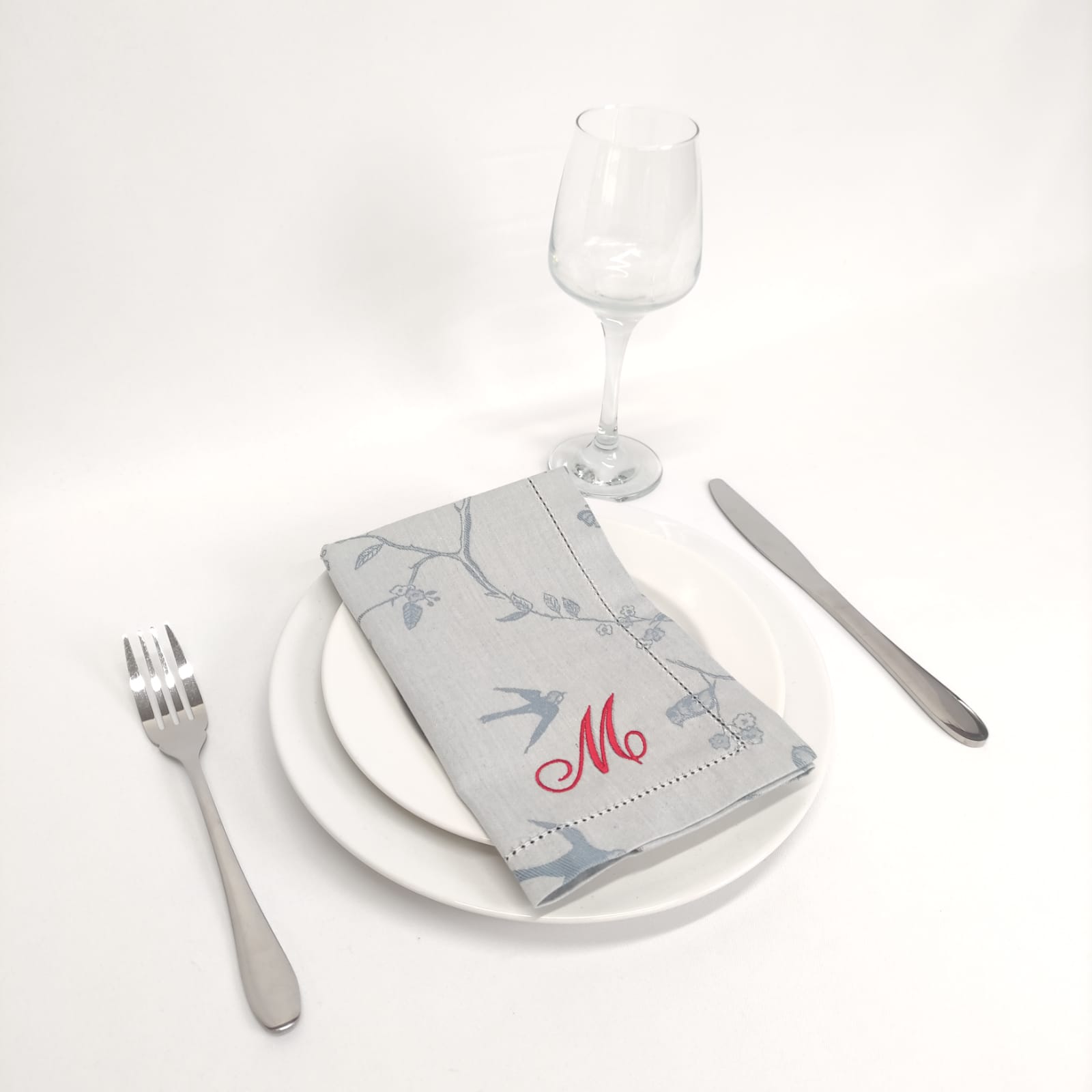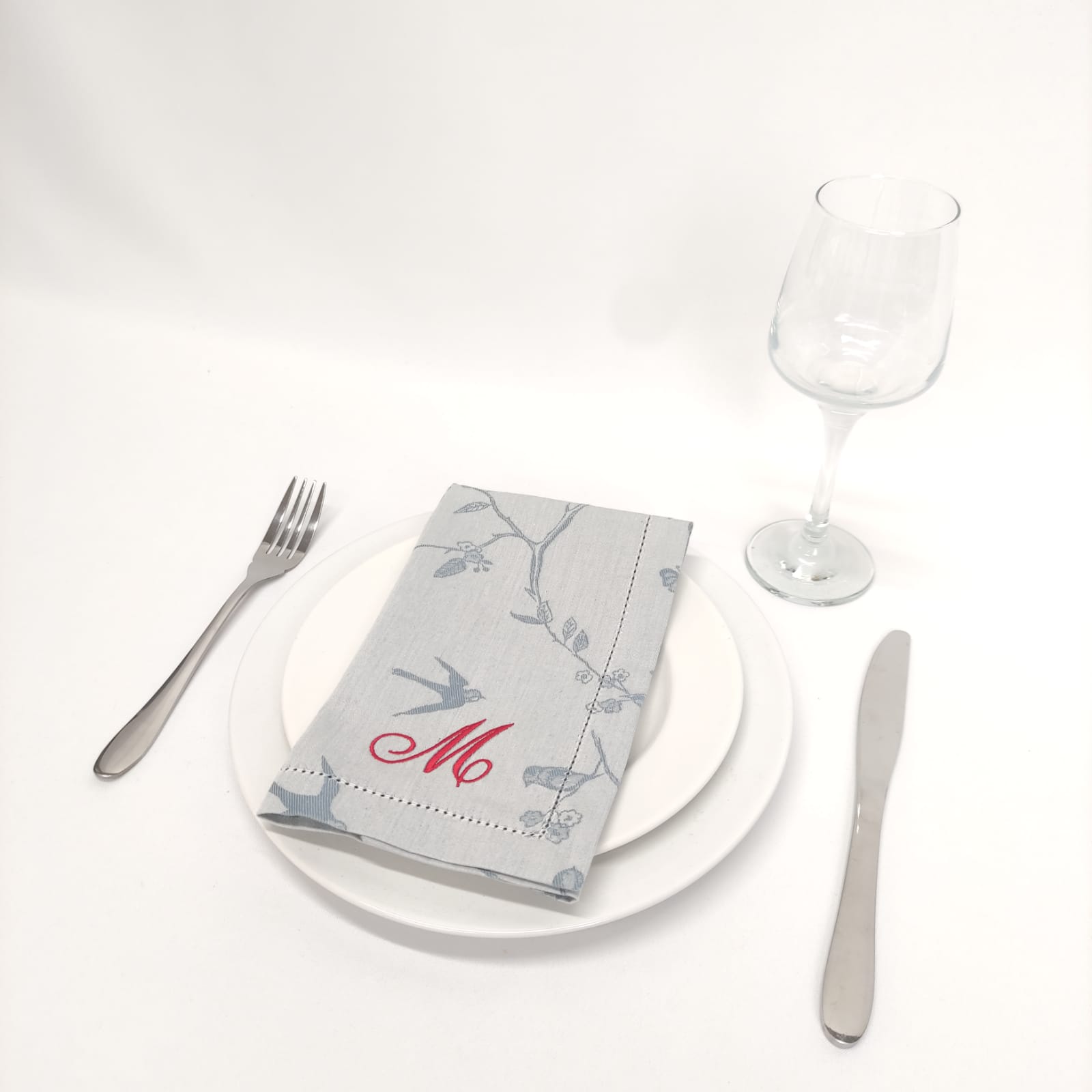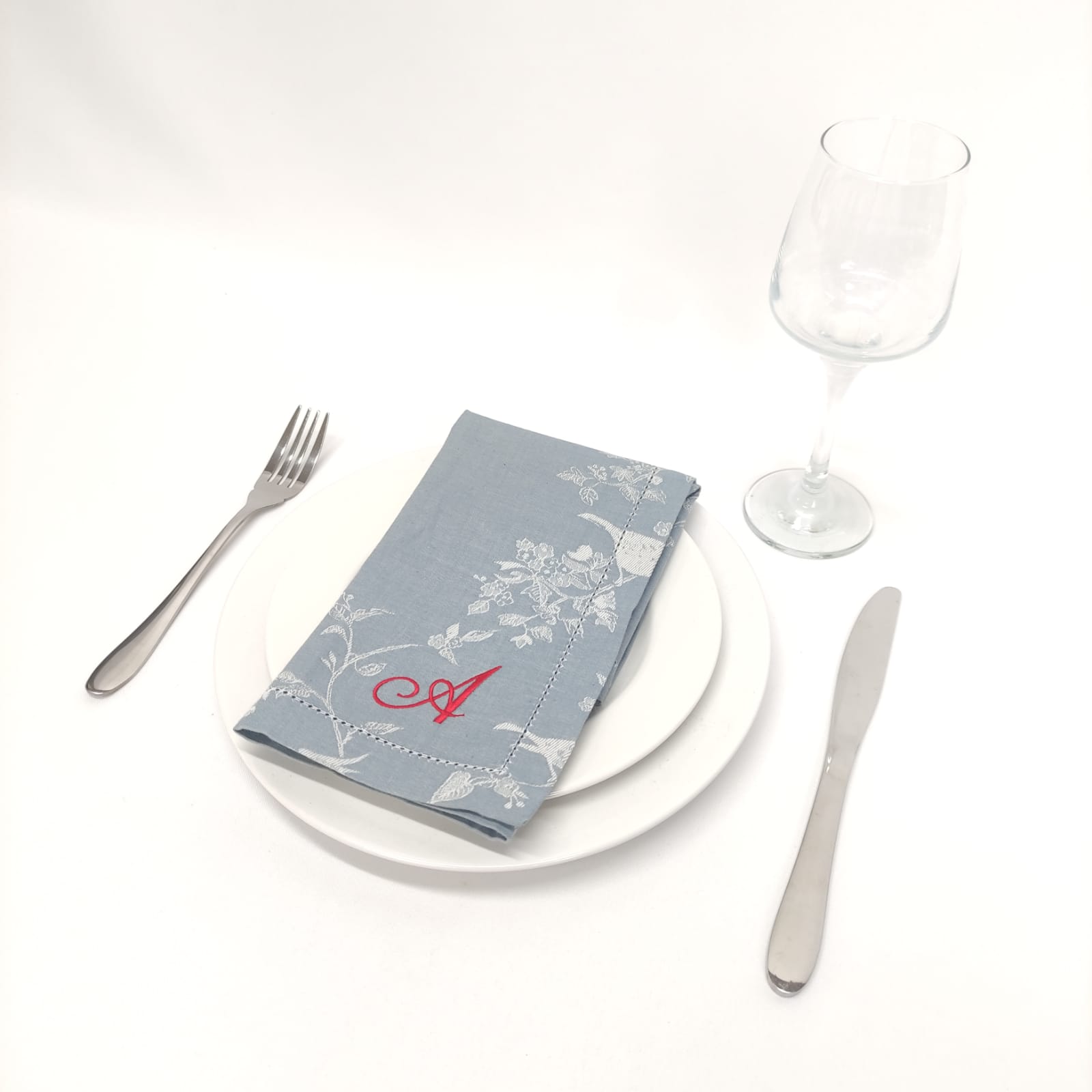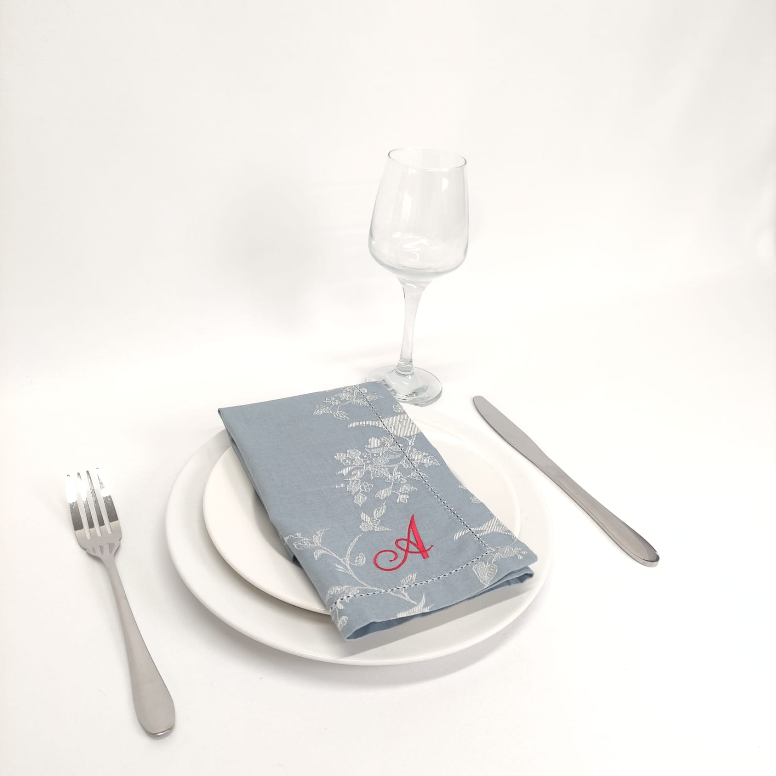 Guardanapo em algodão, com pormenores elegantes em tons azul. Disponível em Azul Claro e Azul Escuro.