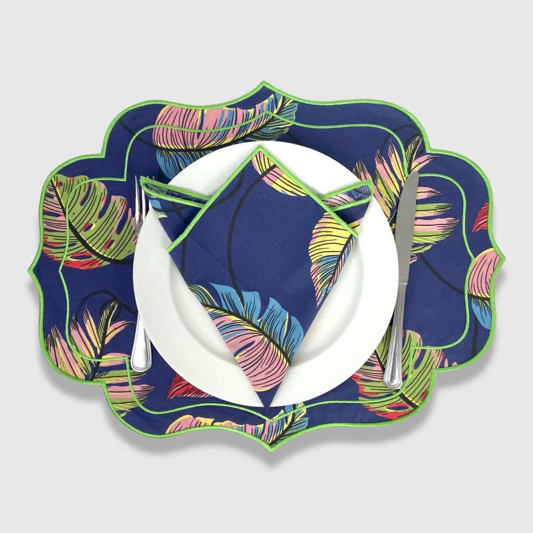 Guardanapo e Individual  modelo africa, tecido estampado com padrão africano cores quentes,  acabamento de rolinho verde.