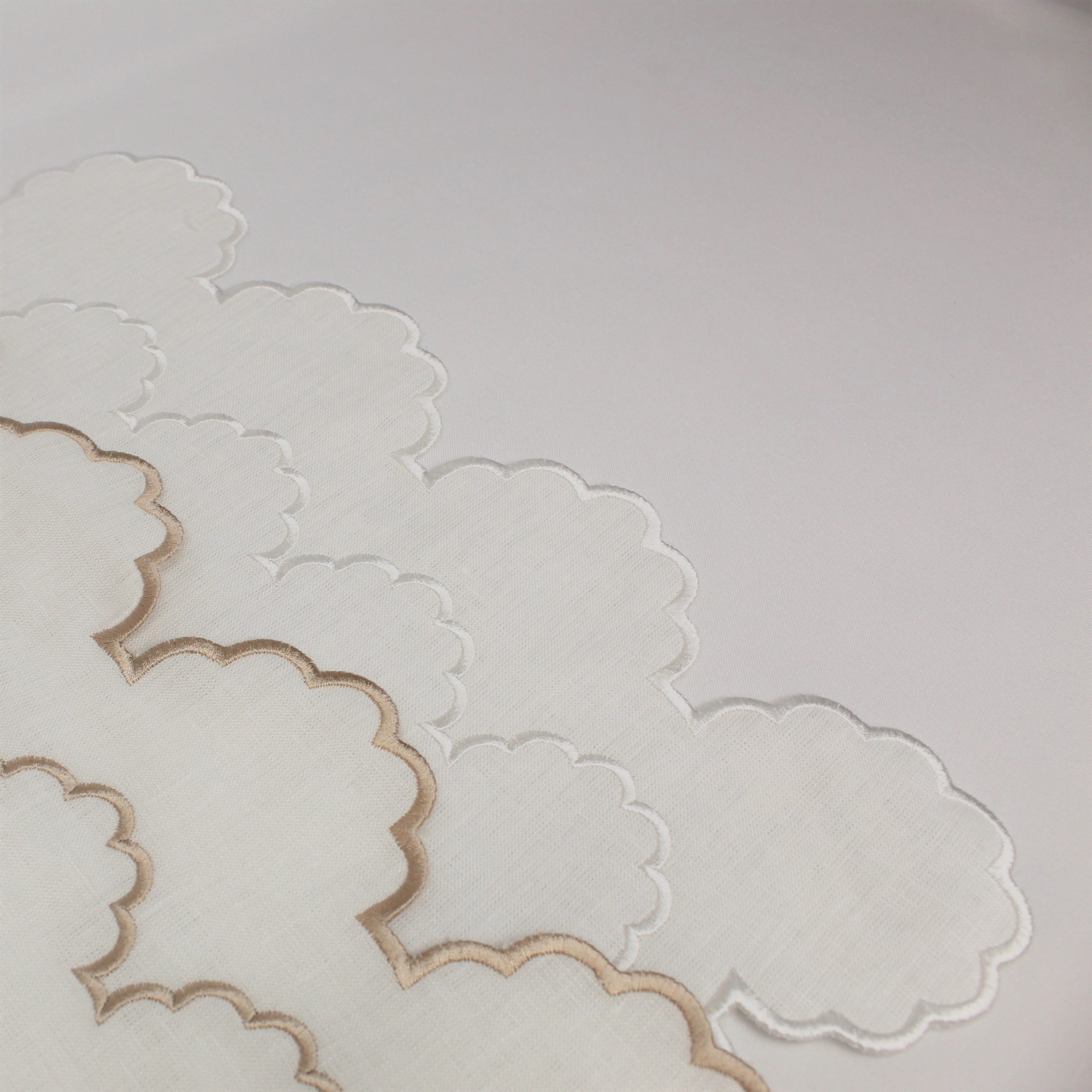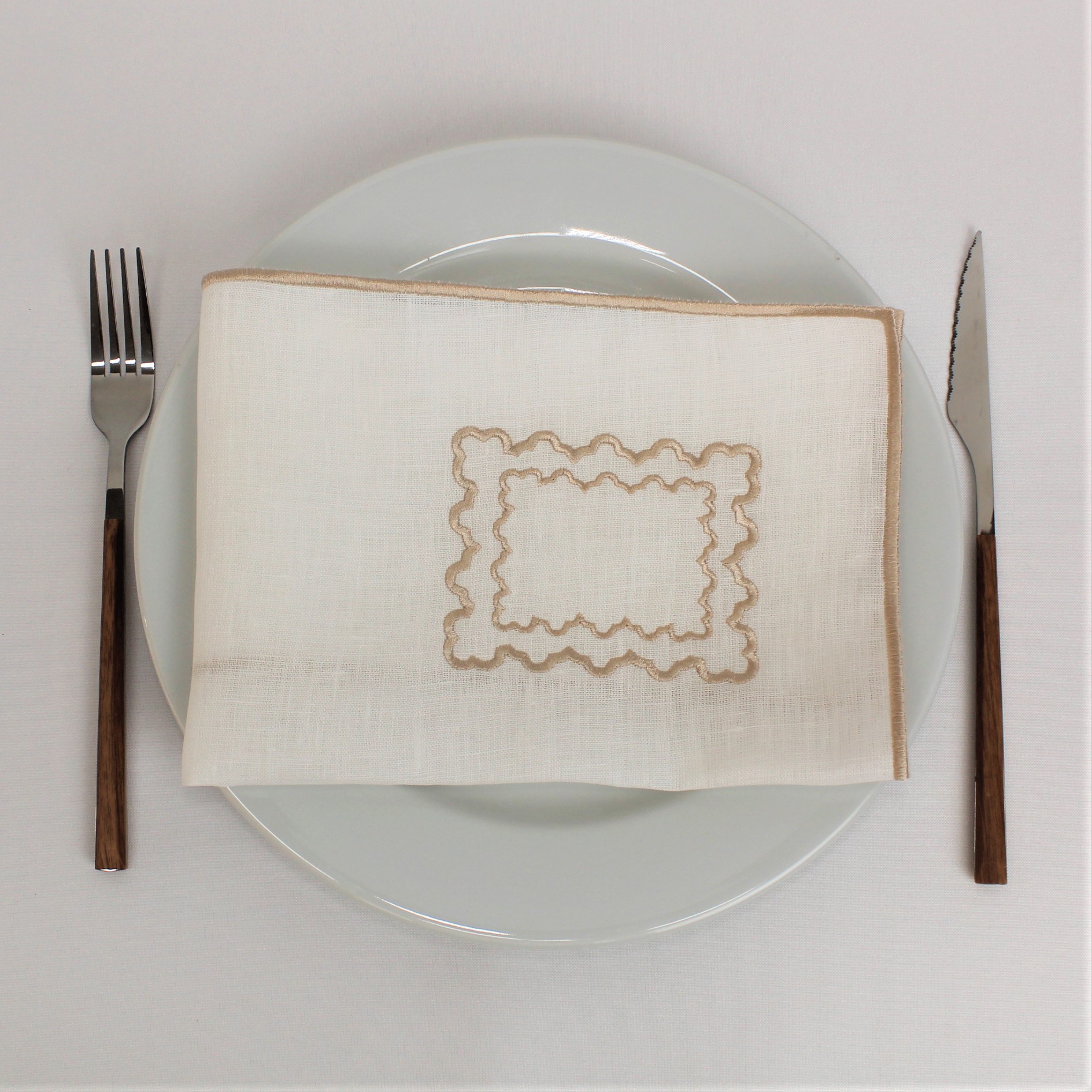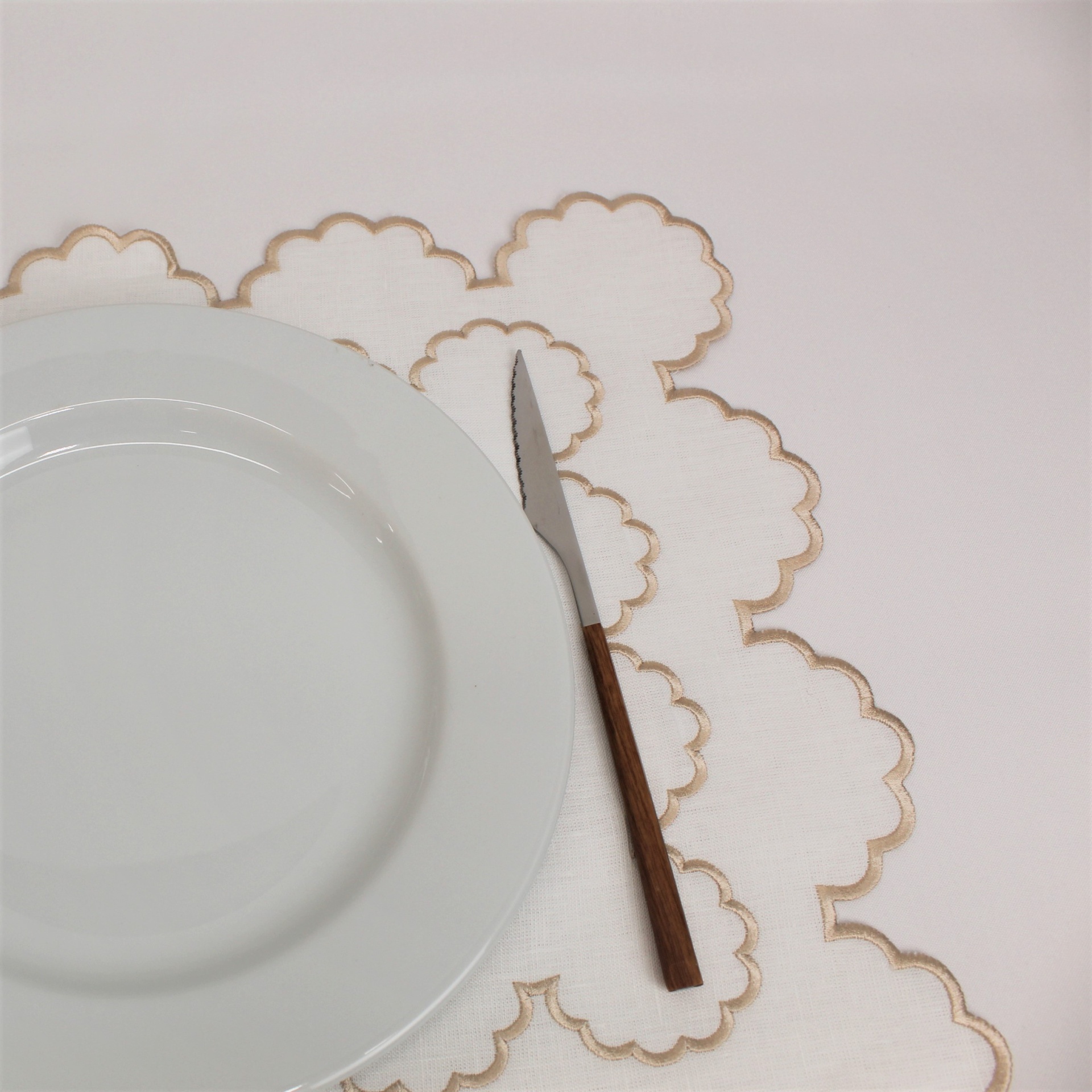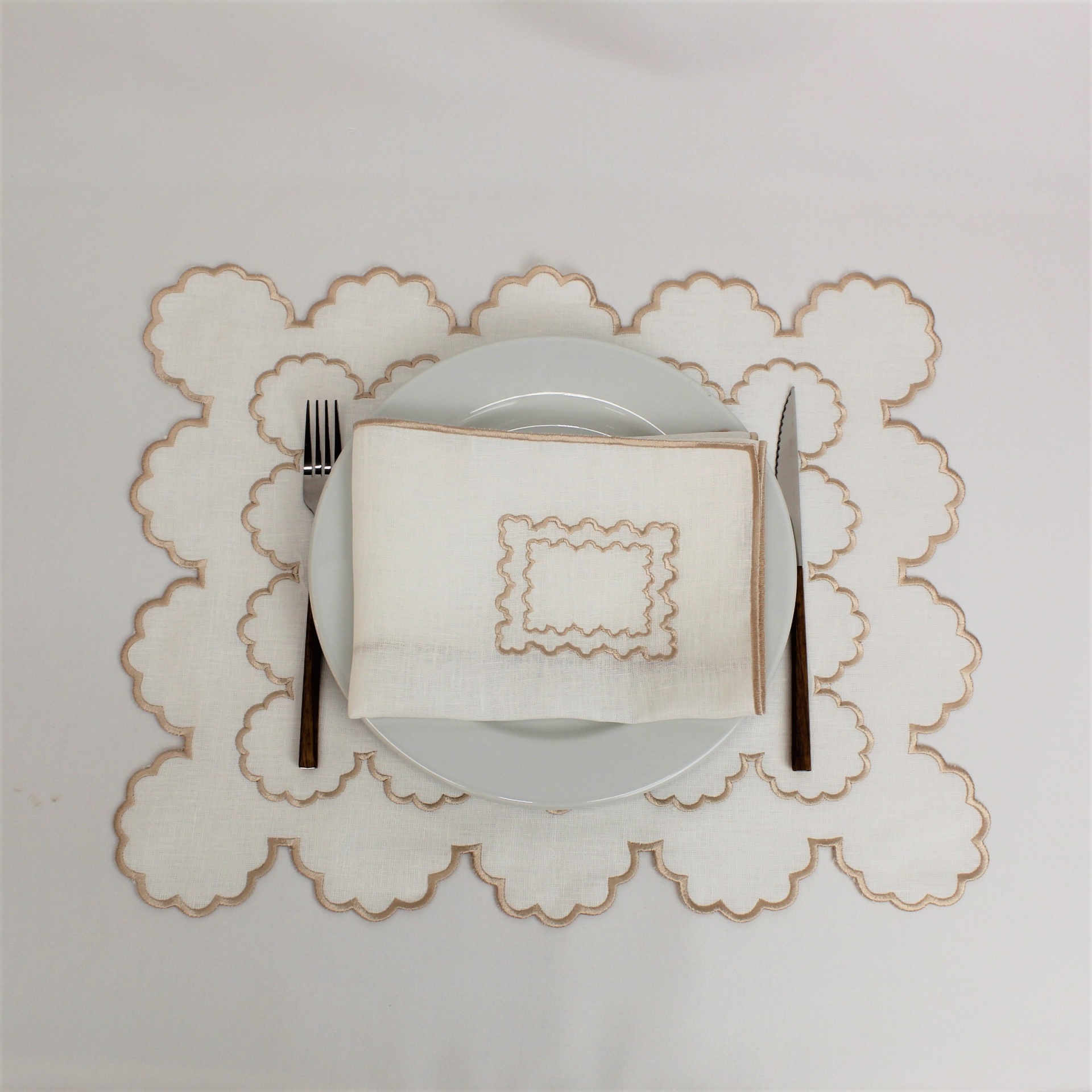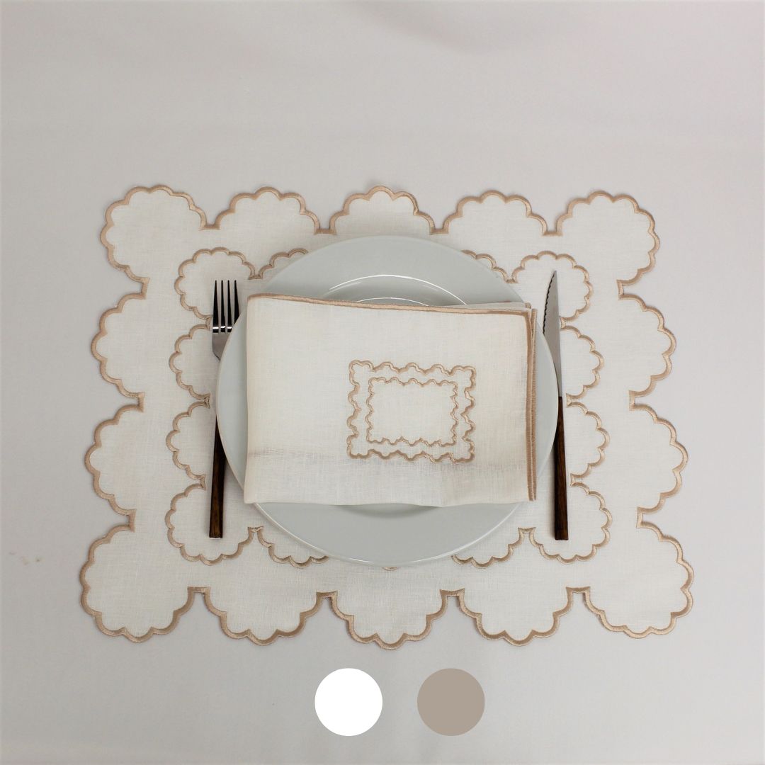 Individual e Guardanapo Duplo, em linho, com acabamento e design de rolinho. Disponivel em branco e bege.