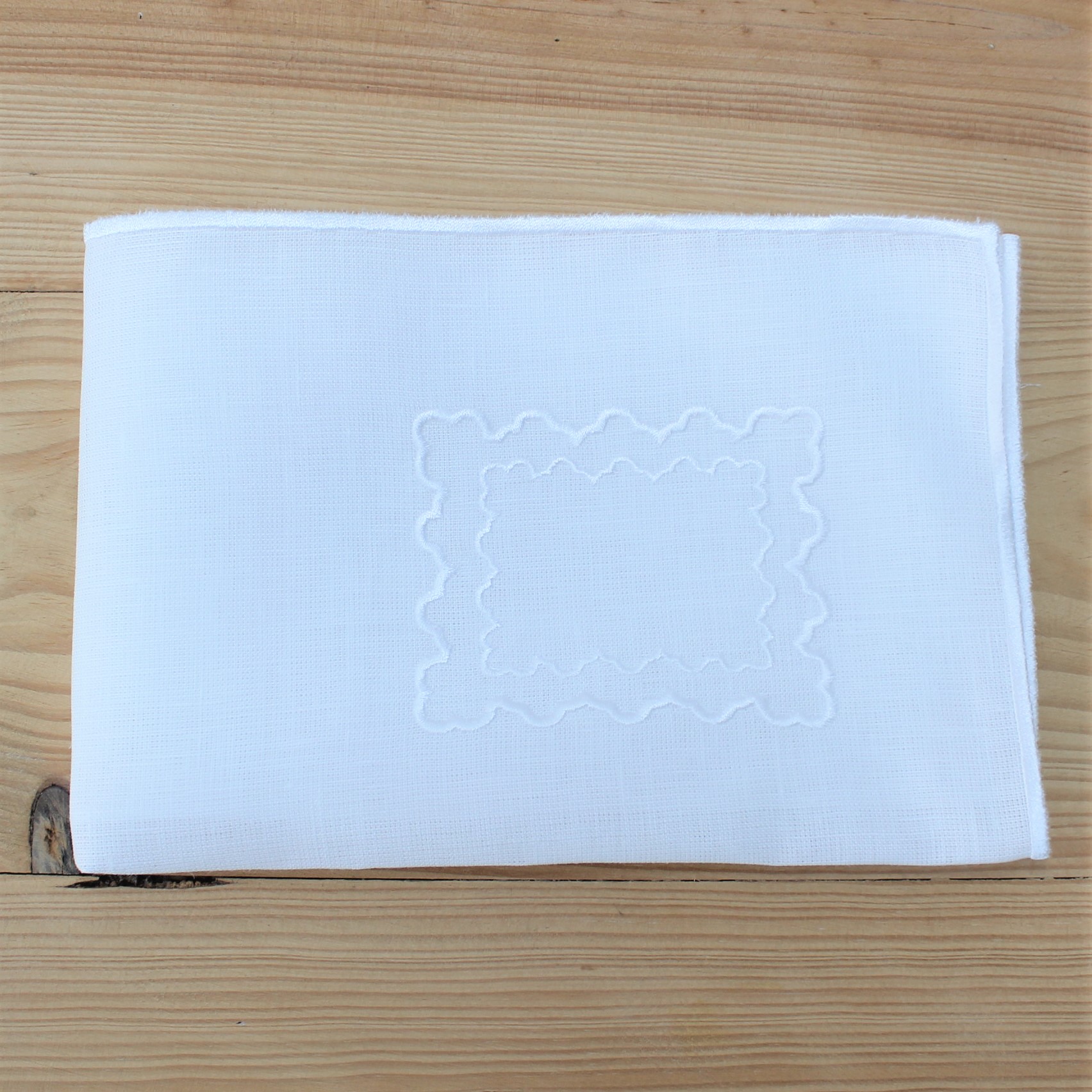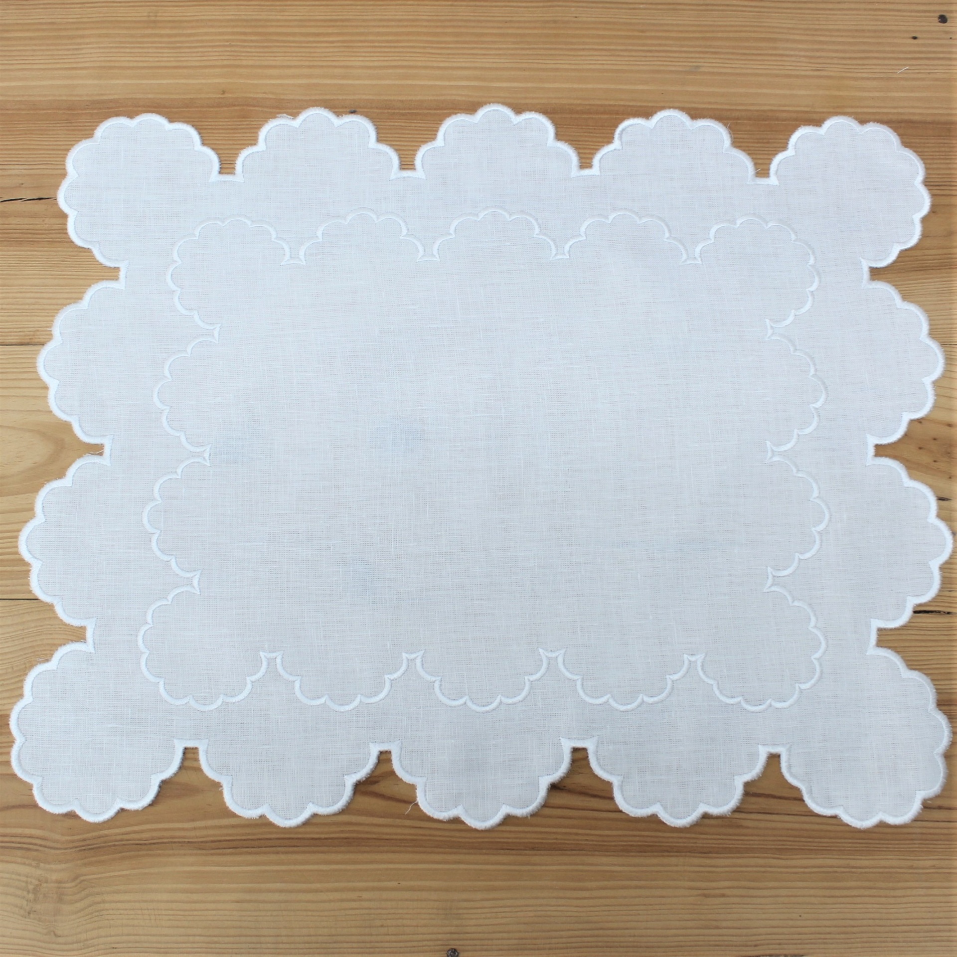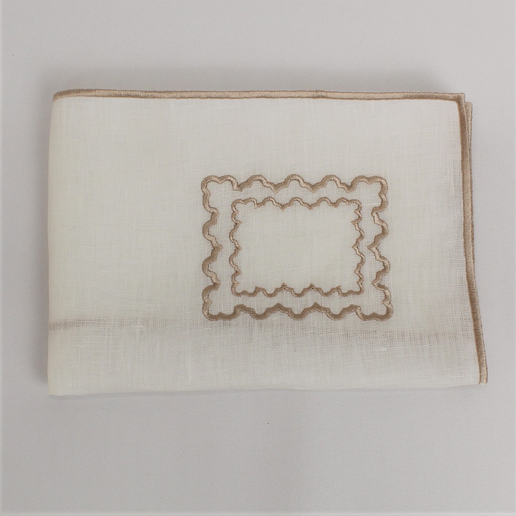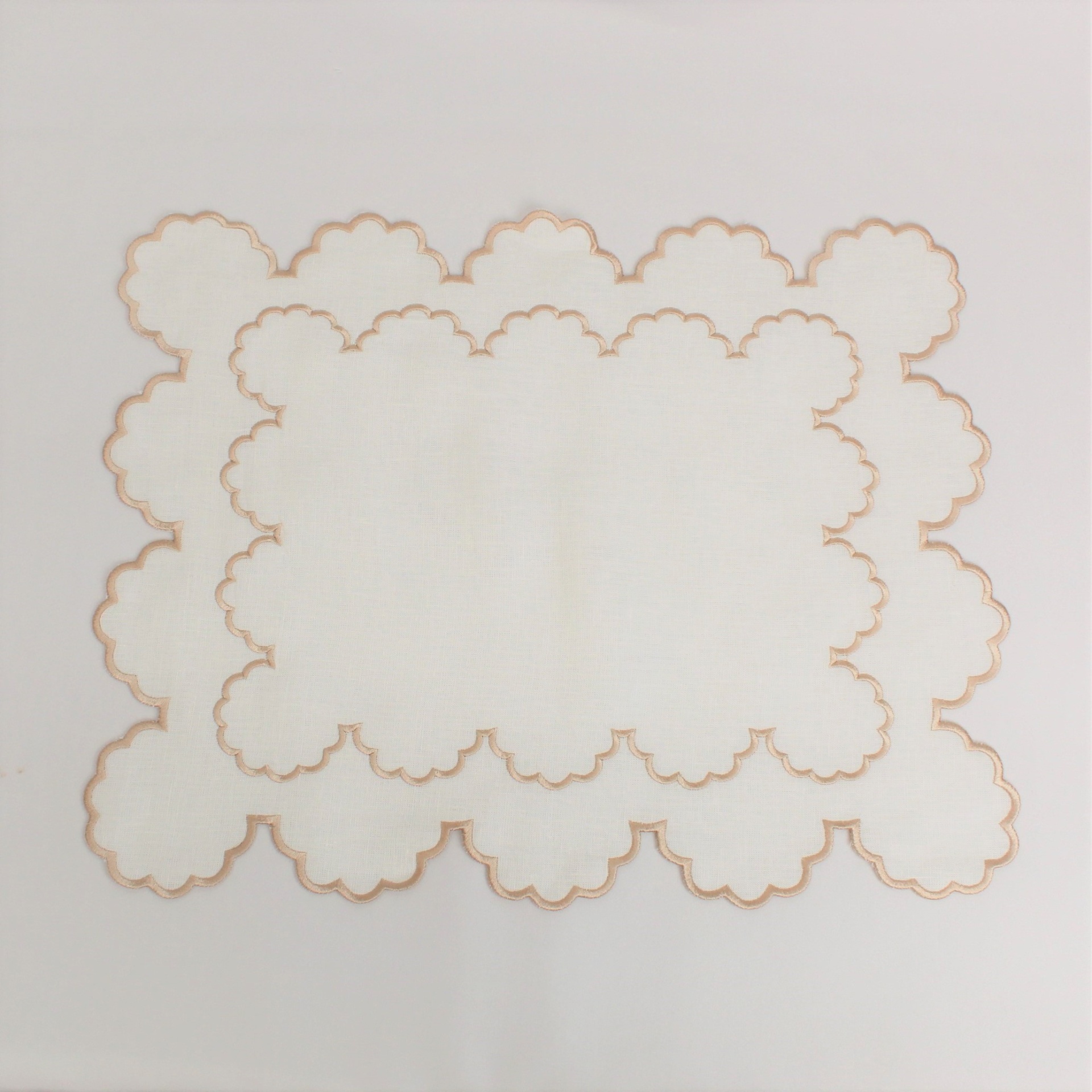 Individual e Guardanapo Duplo, em linho, com acabamento e design de rolinho. Disponivel em branco e bege.