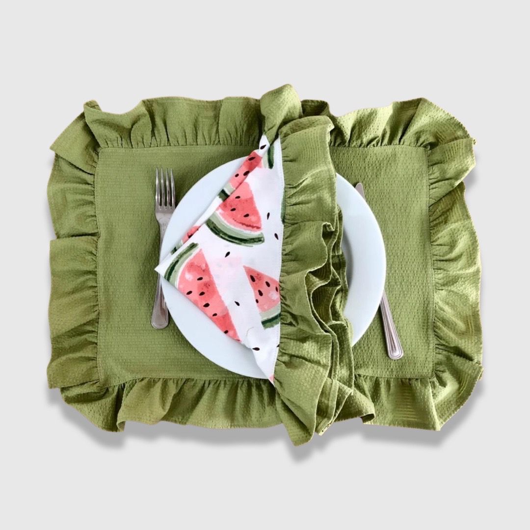 Guardanapo e Individual  modelo melancia , tecido em algodão e acabamento folho verde.