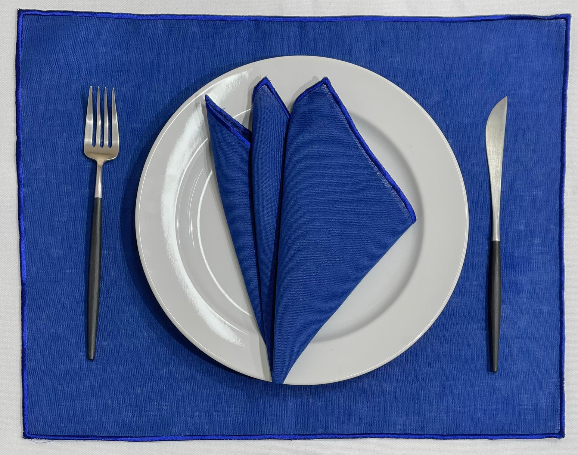 Guardanapo e individual de mesa em linho com acabamento de bainha em rolinho azul.