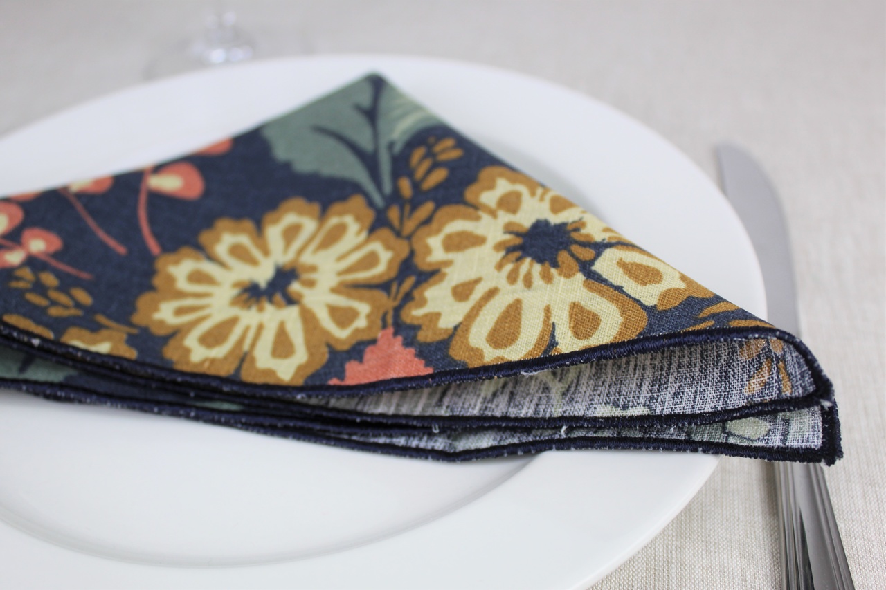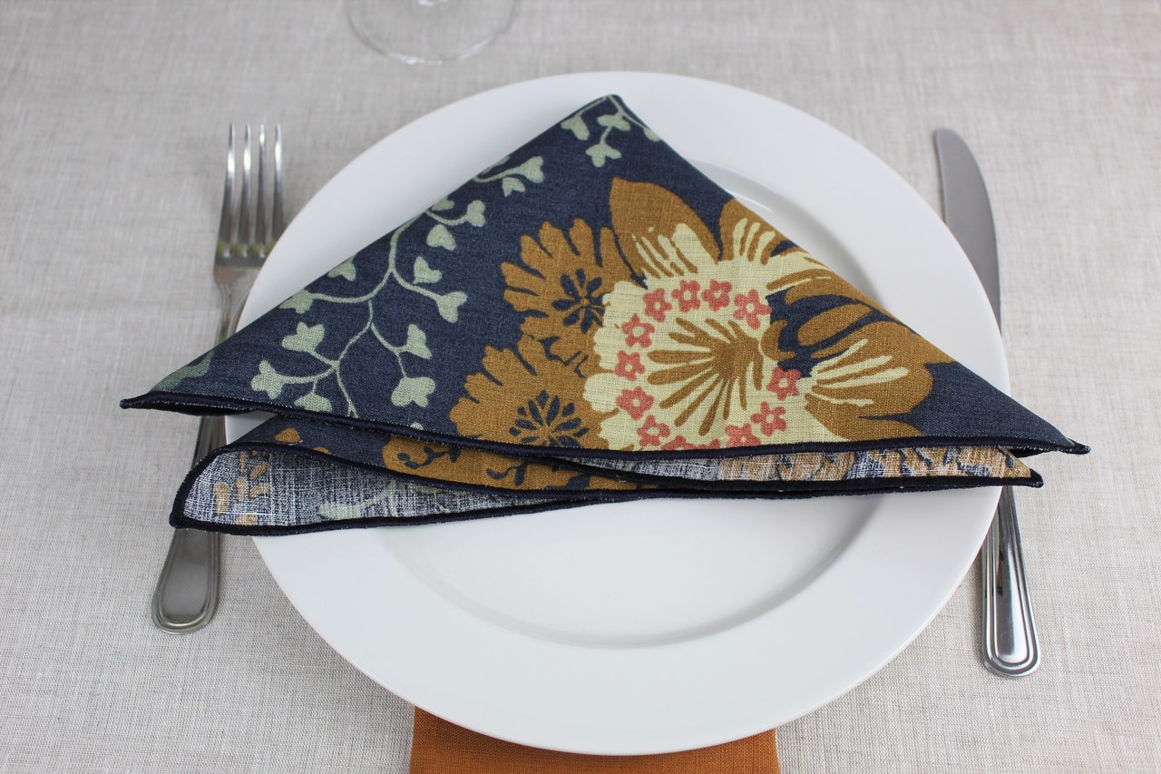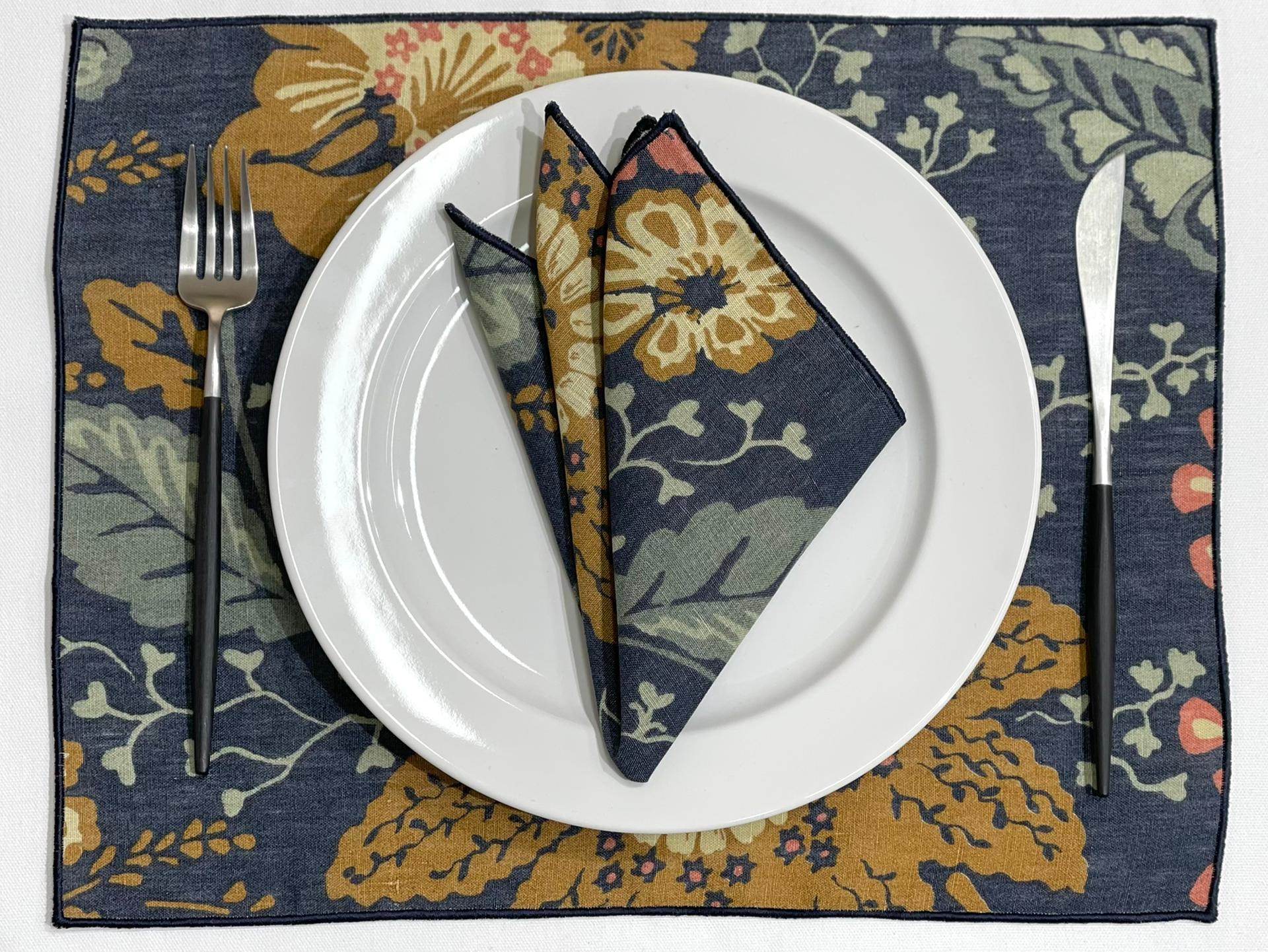 Guardanapo e individual de mesa em linho com acabamento de bainha em rolinho, padrão florido azul.