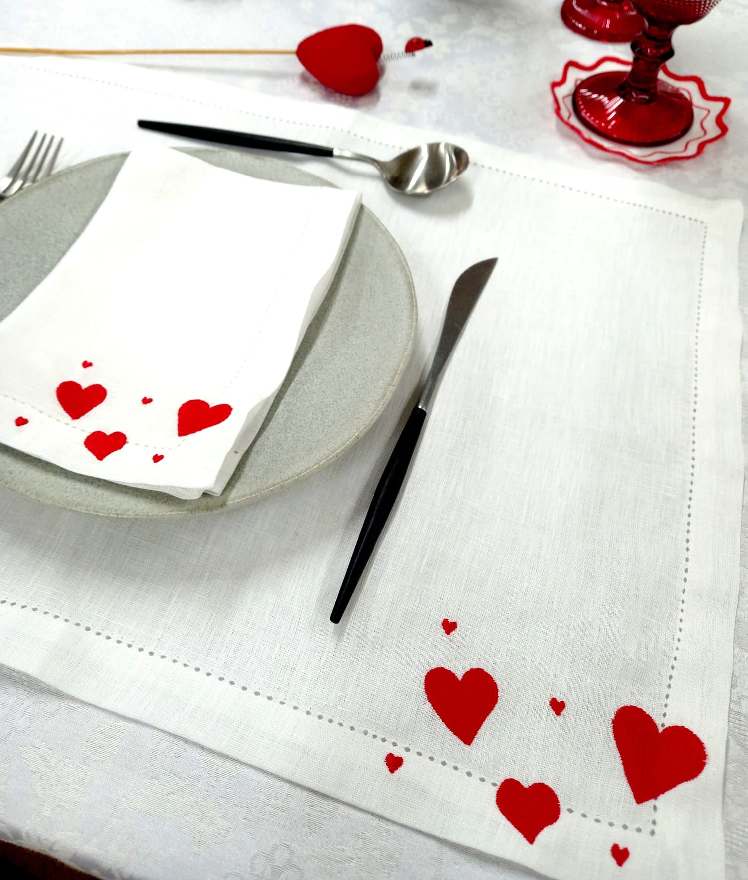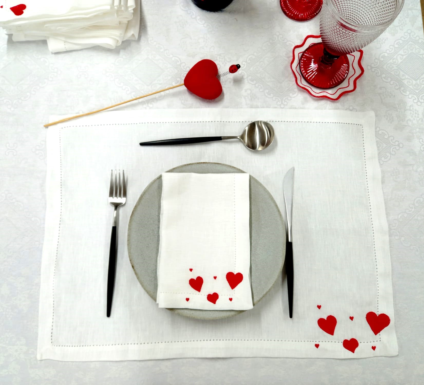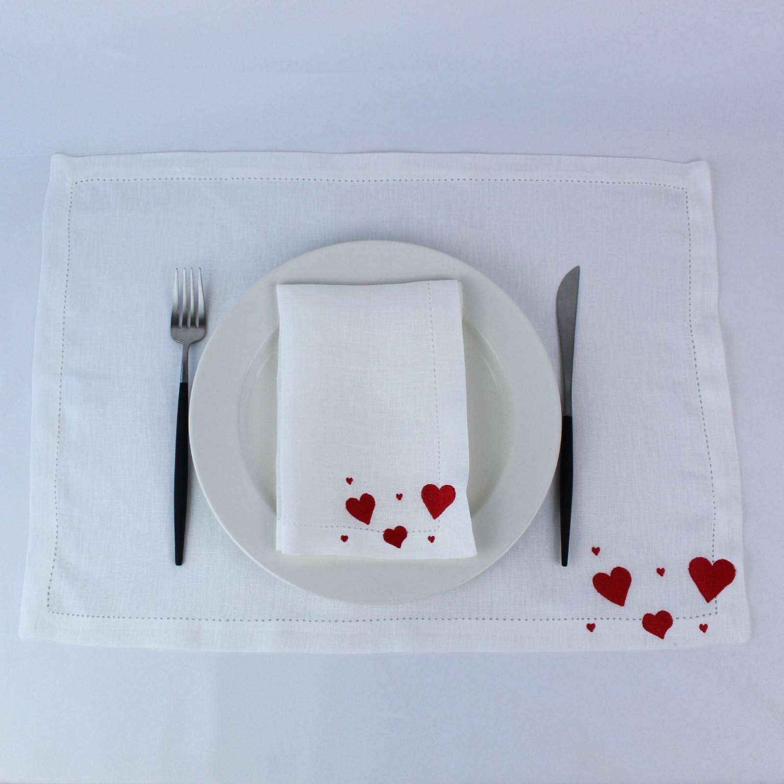 Guardanapo e Individual em linho branco, com bordado de corações e acabamento de ponto aberto.