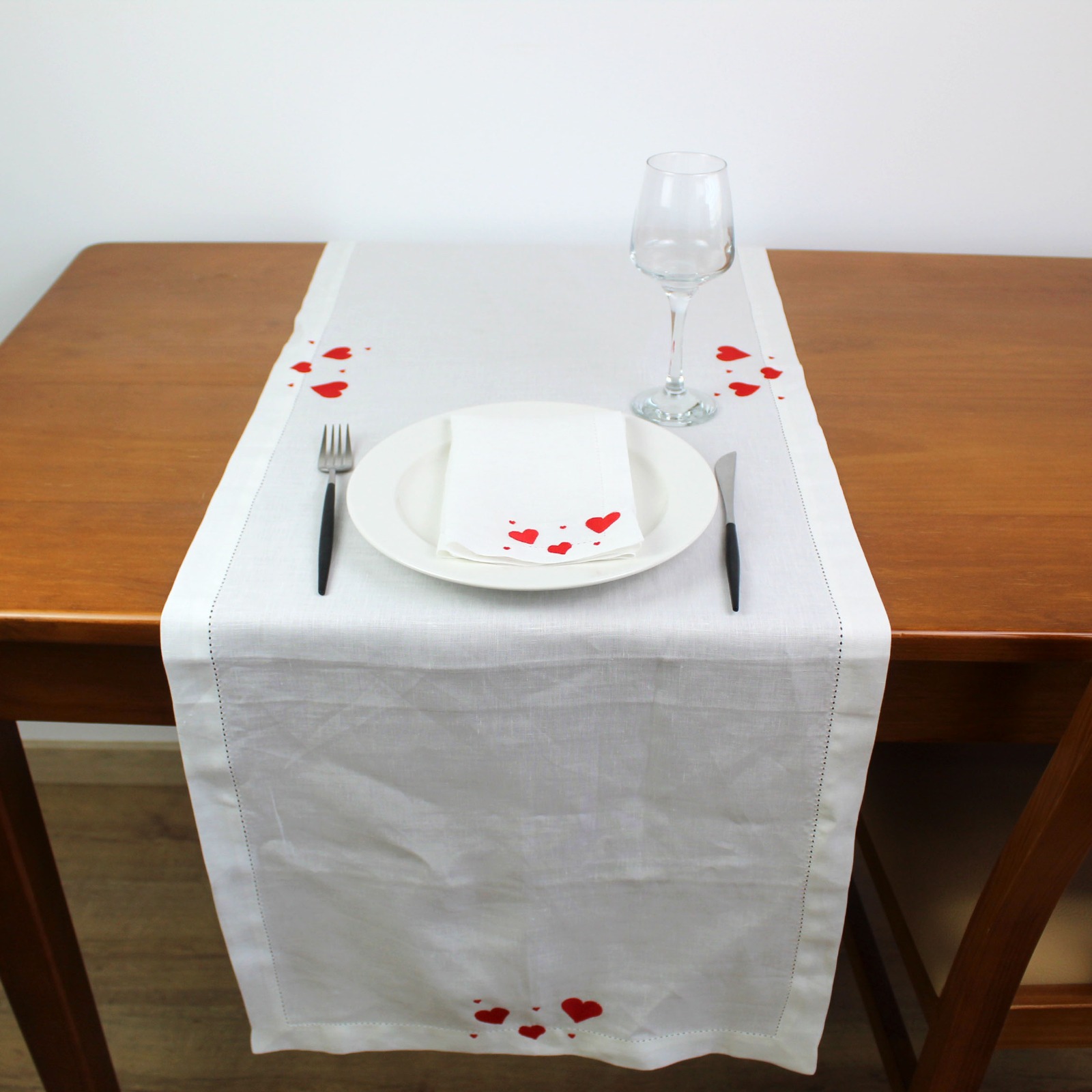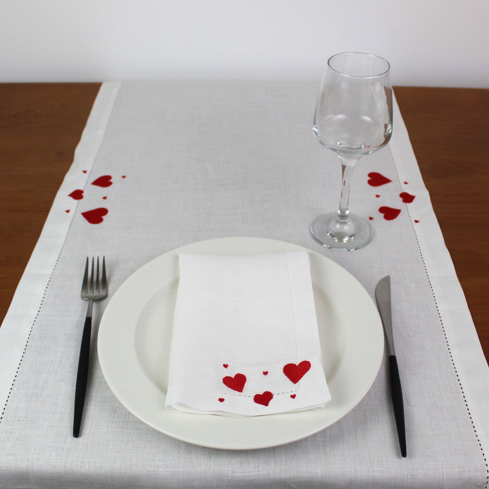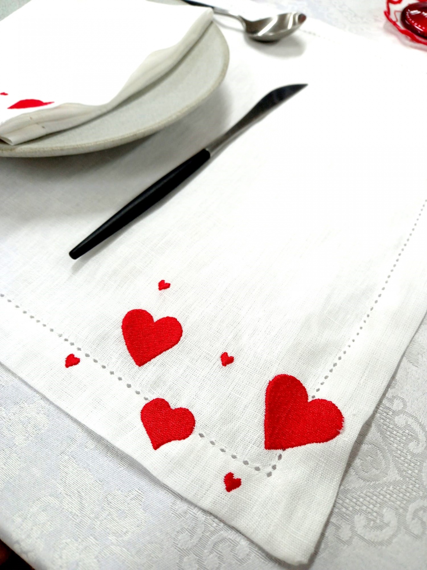 Guardanapo e Individual em linho branco, com bordado de corações e acabamento de ponto aberto.