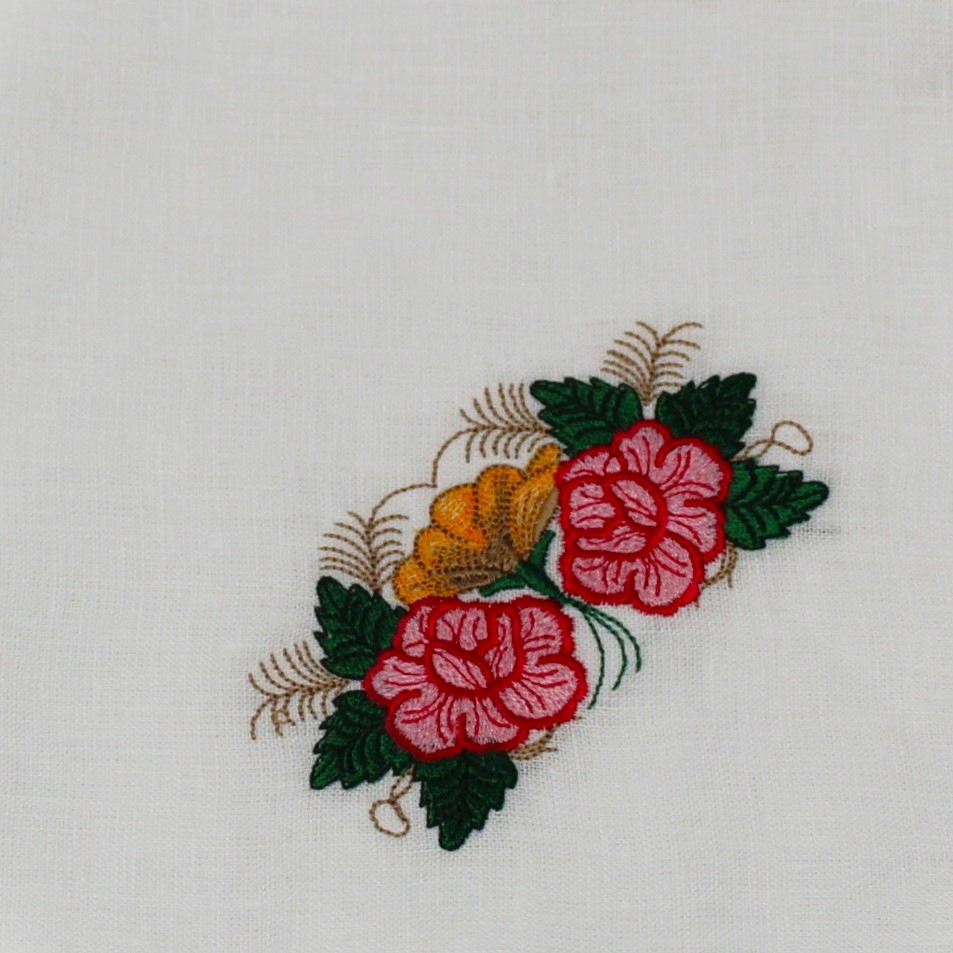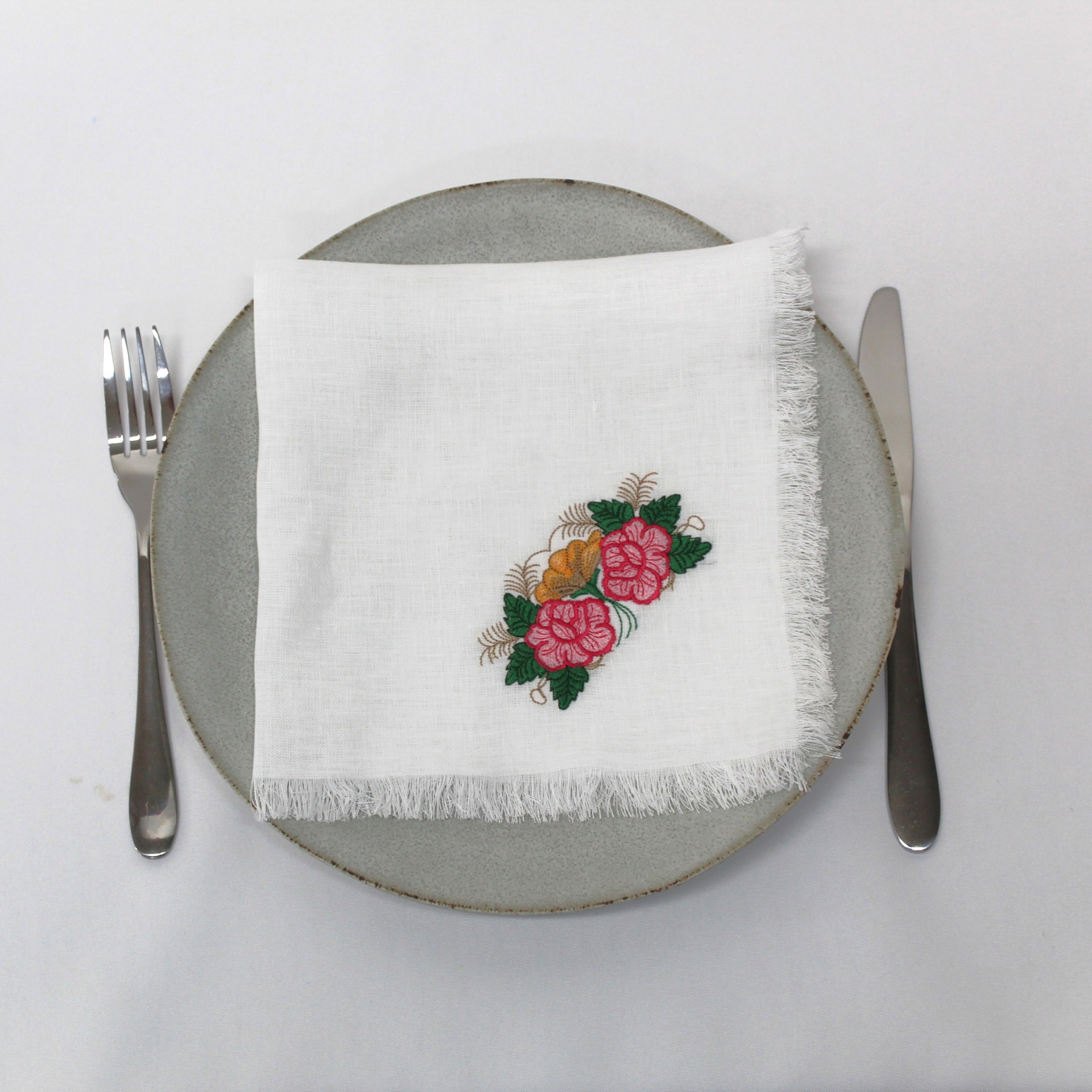 Guardanapo em linho branco, com flores bordados e acabamento desfiado.
