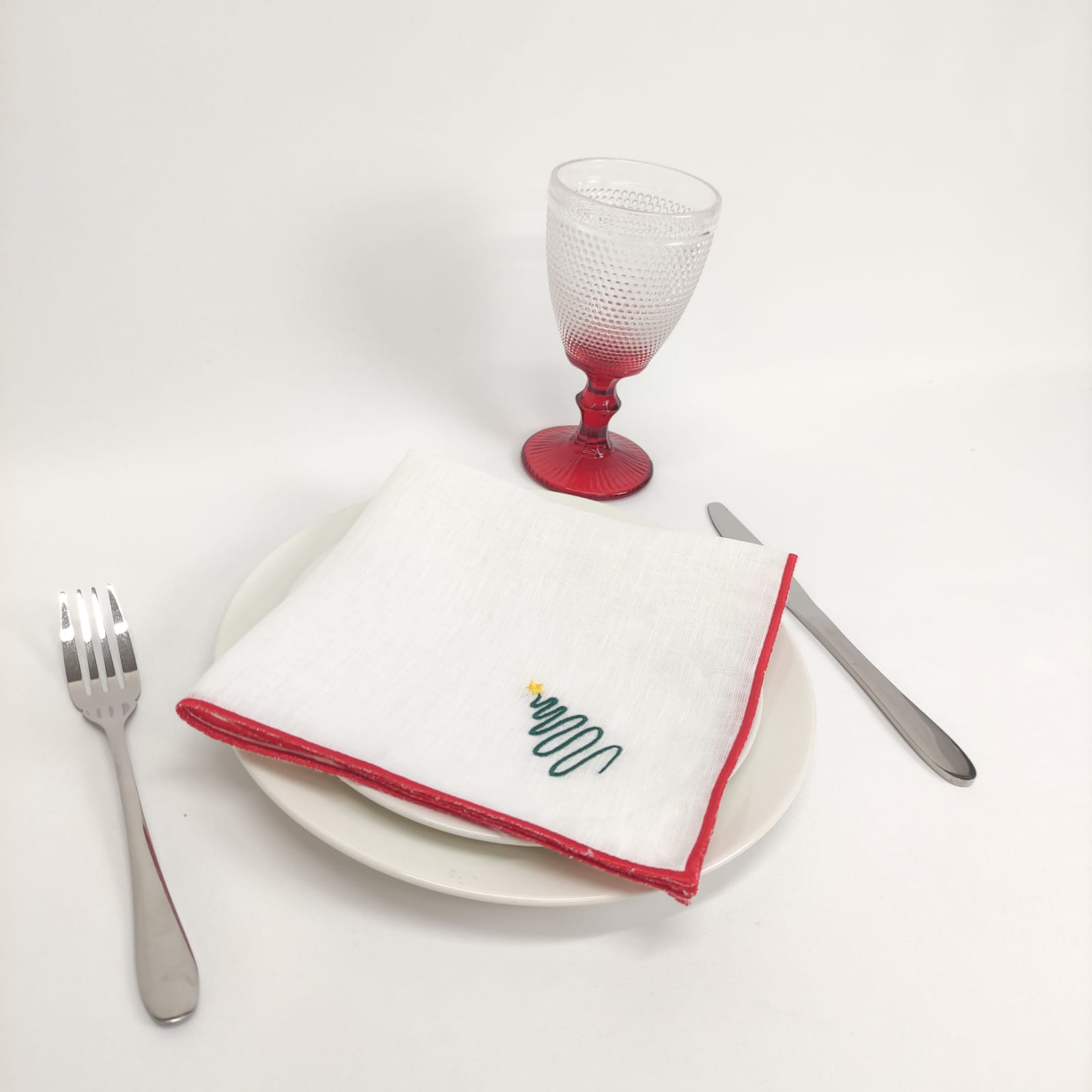 Guardanapo em linho com bordado de Natal e acabamento em rolinho vermelho. Perfeito para a ceia de Natal.