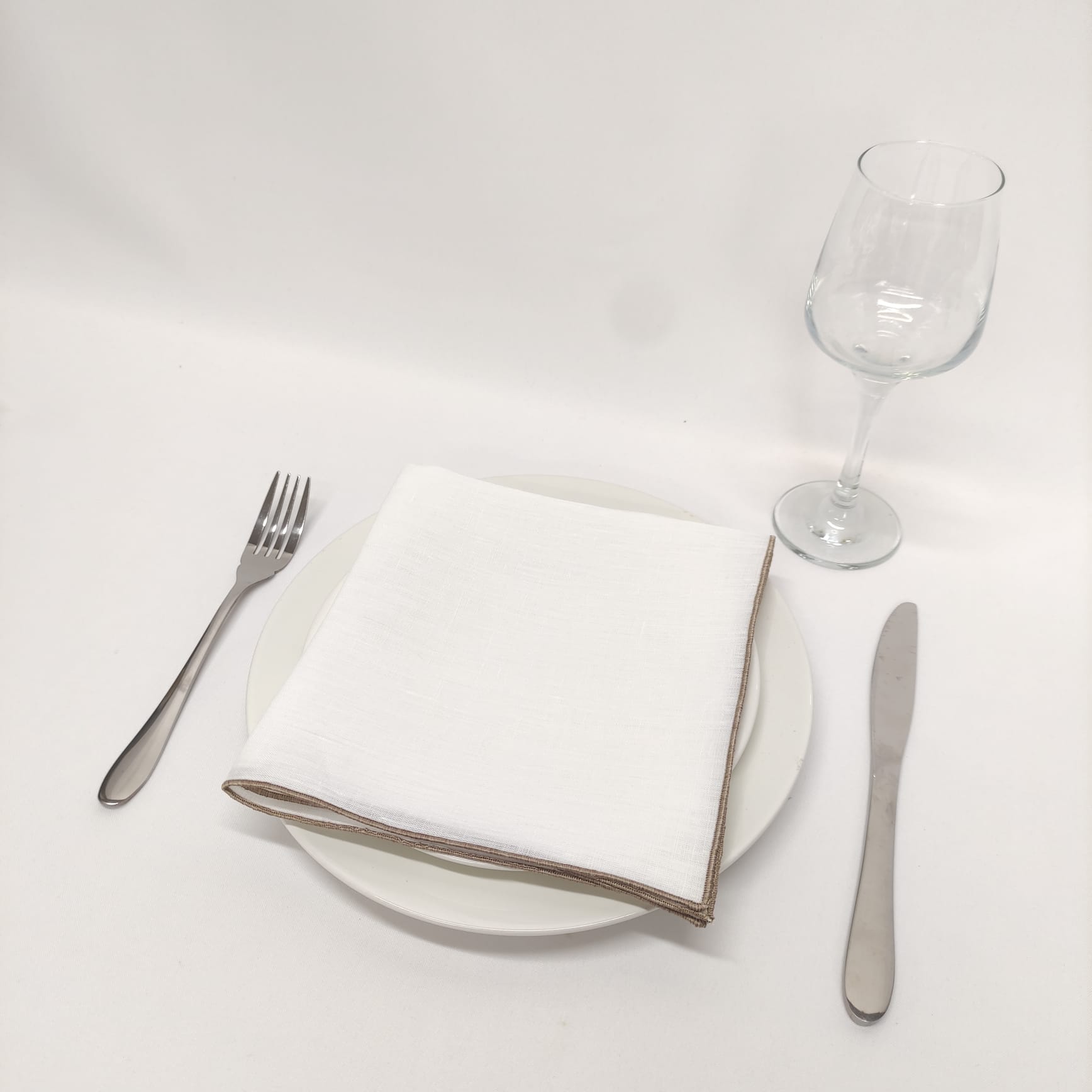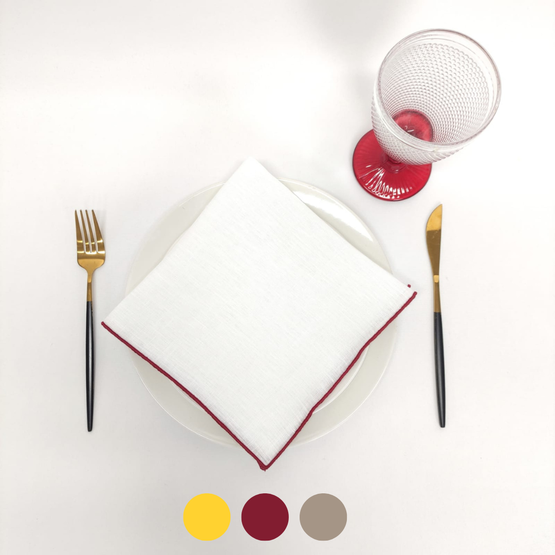 Guardanapo em linho branco com acabamento em rolinho amarelo, bordô e taupe.