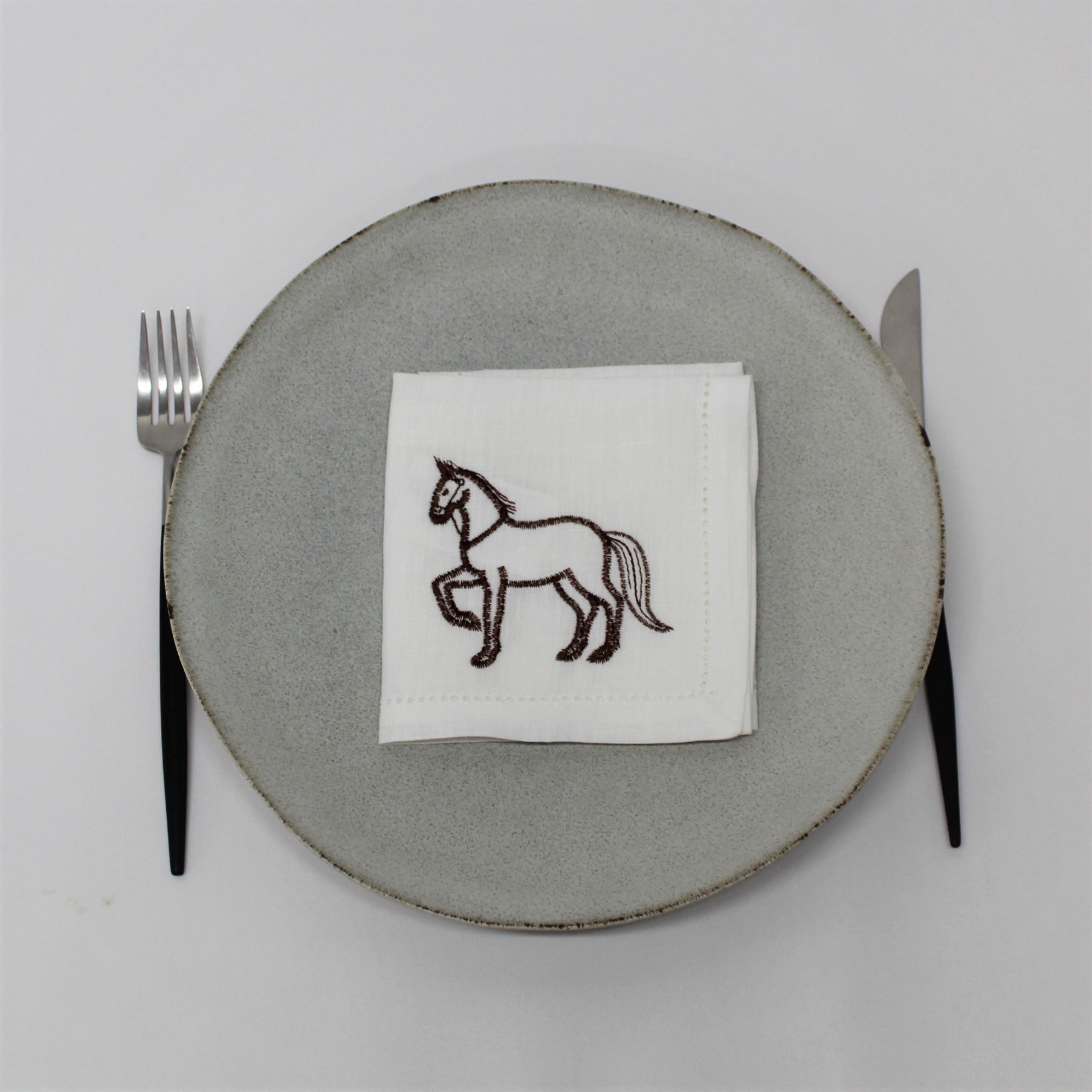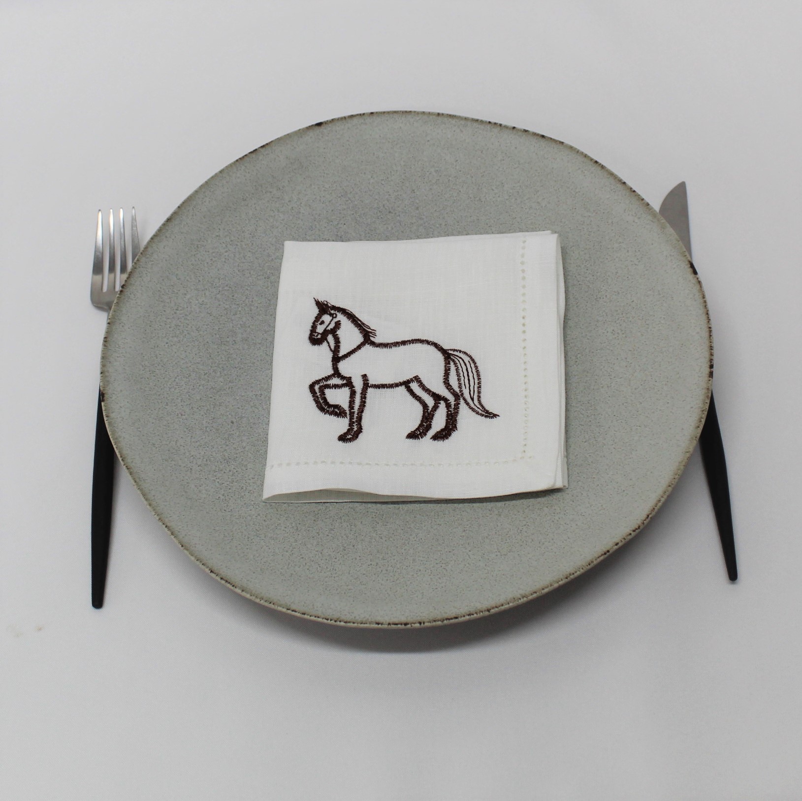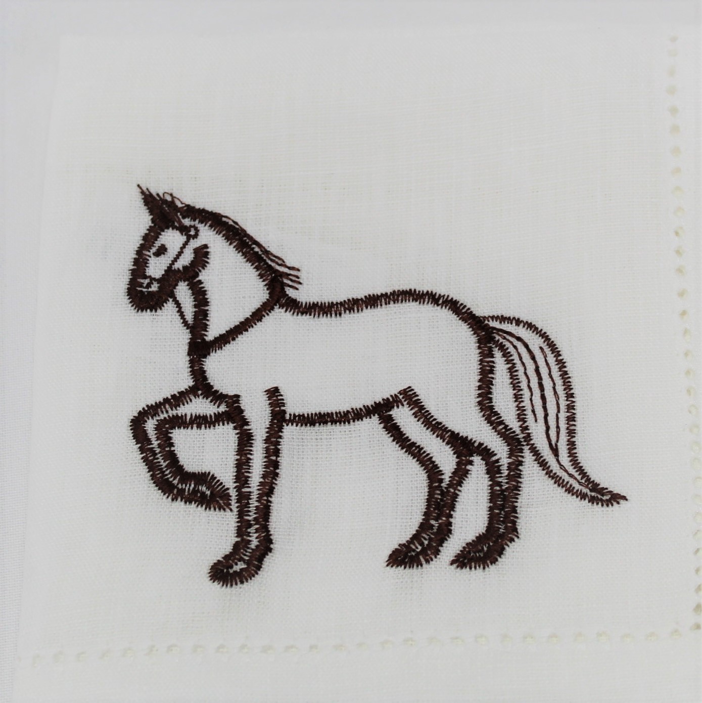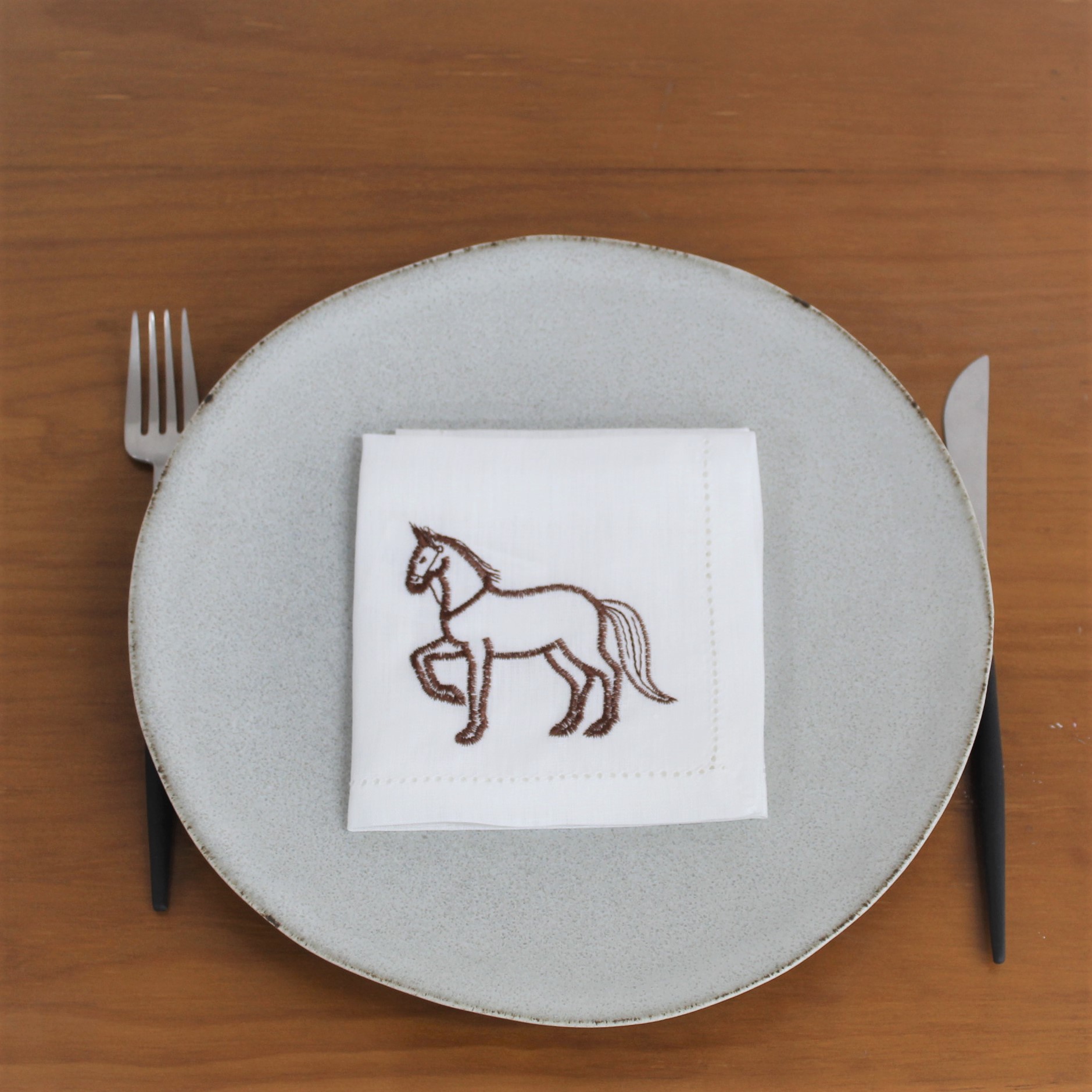 Guardanapo em linho branco com cavalo bordado e acabamento em ponto aberto.