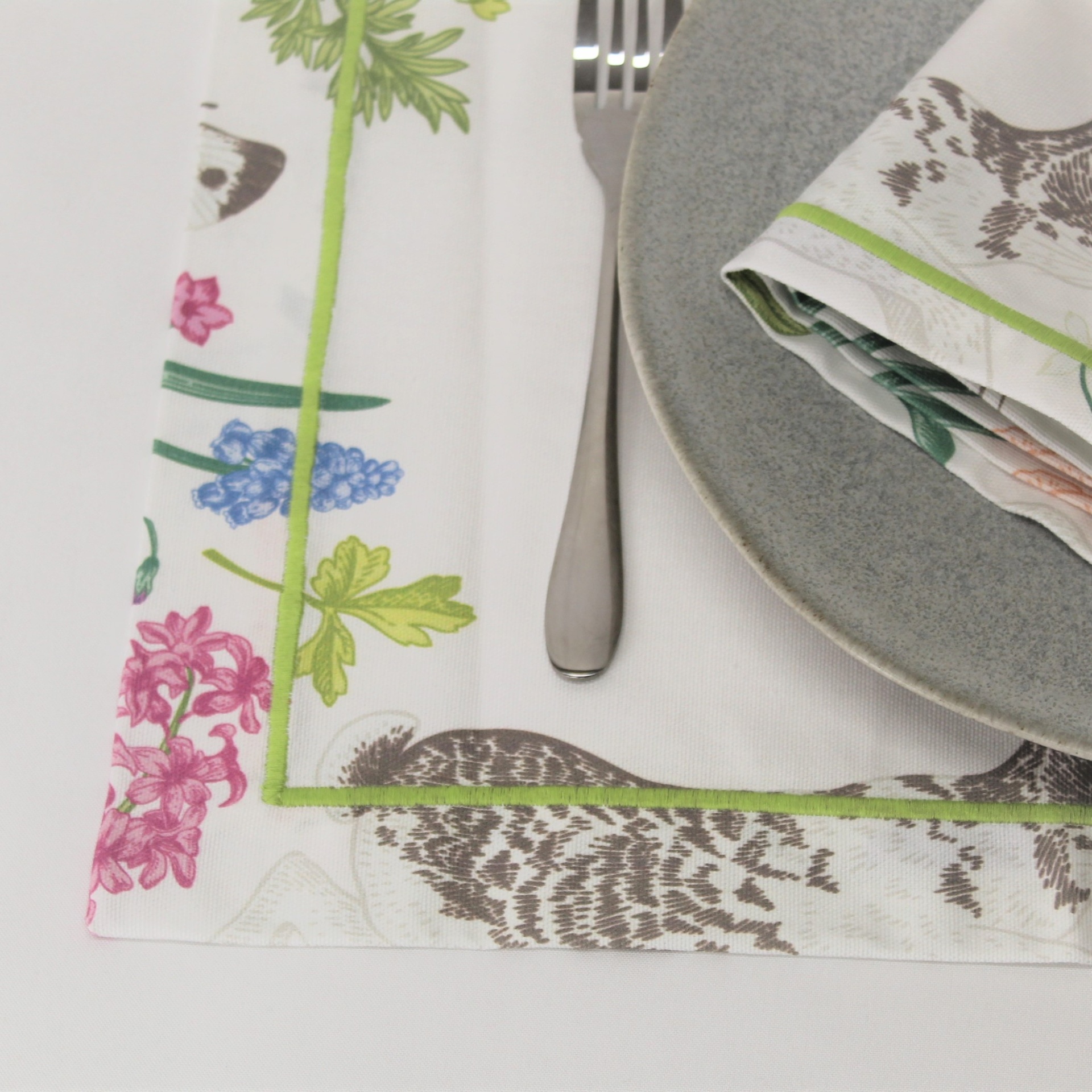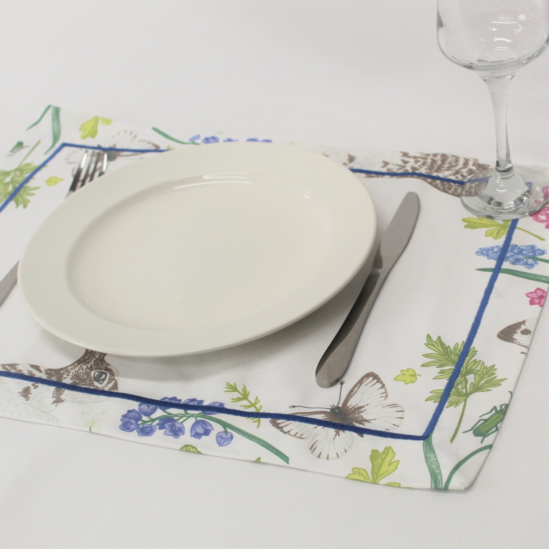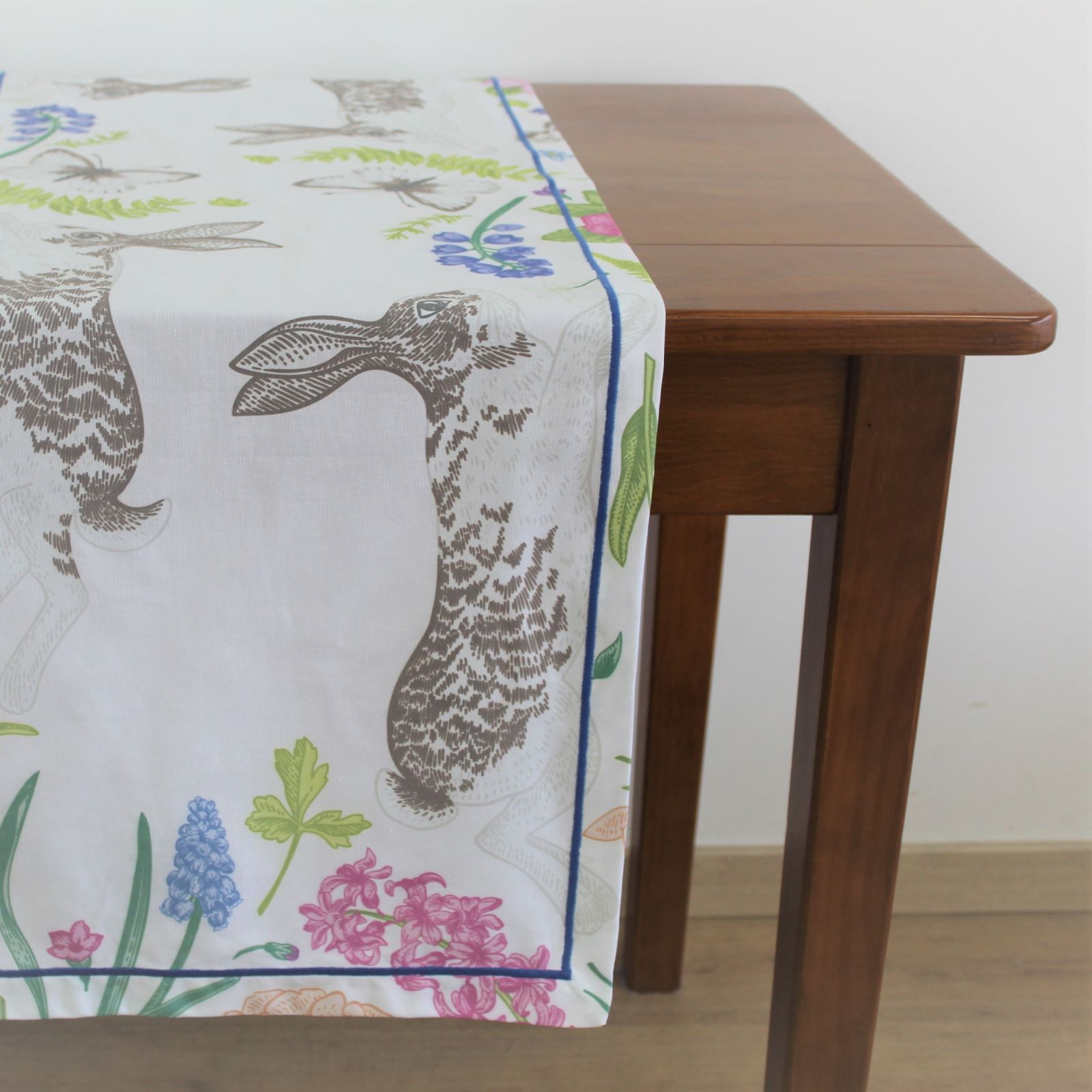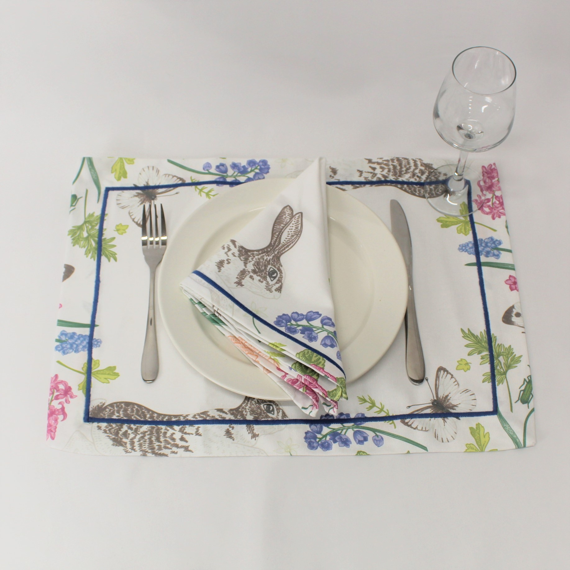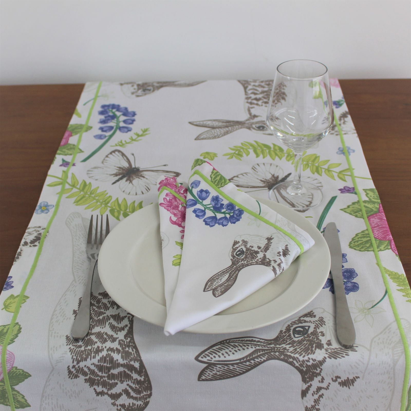 Individual de mesa e caminho de mesa em algodão com estampado Digital do Coelho da Páscoa. Acabamento de bainha inglesa ou com aplicação de rolinho.