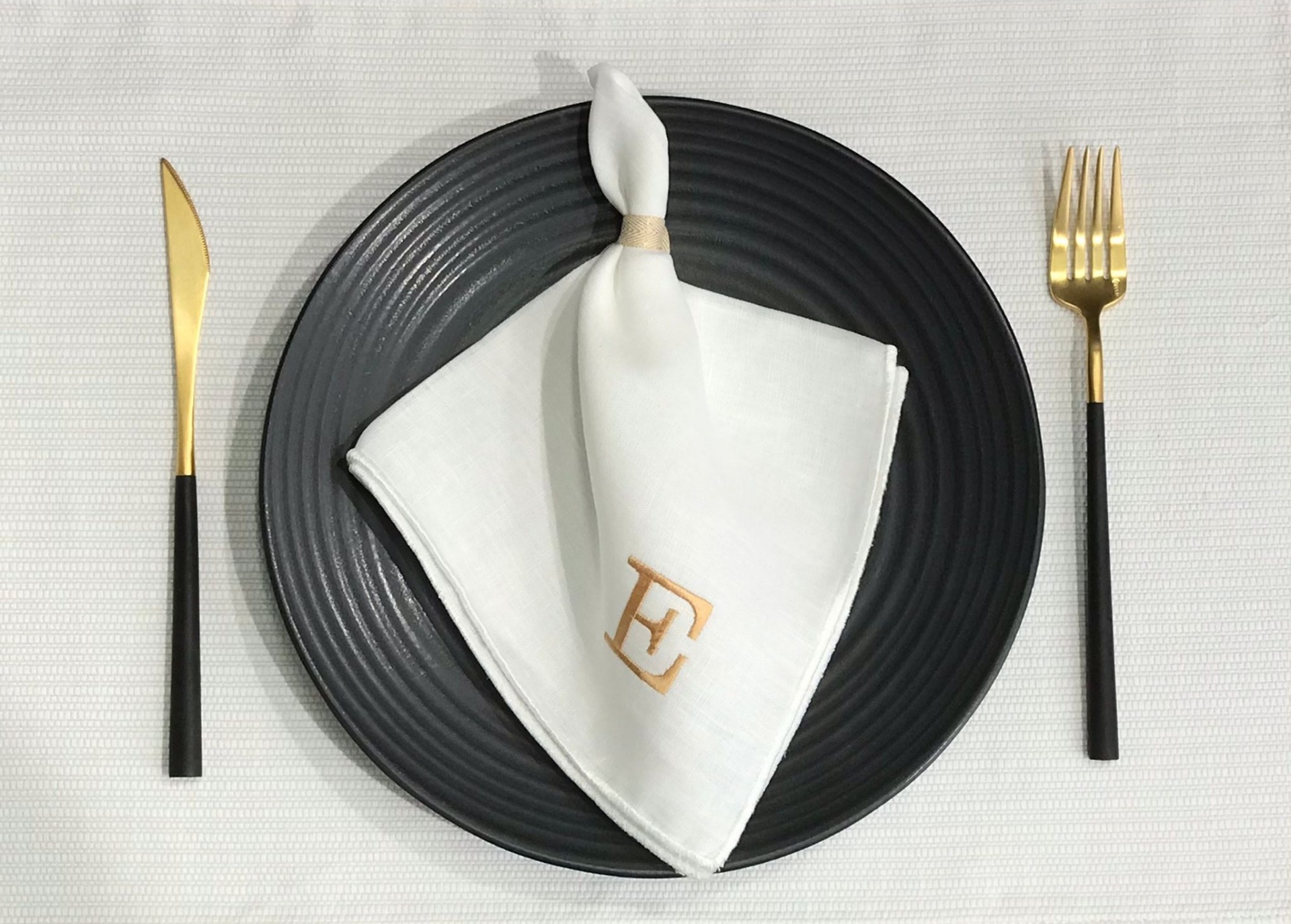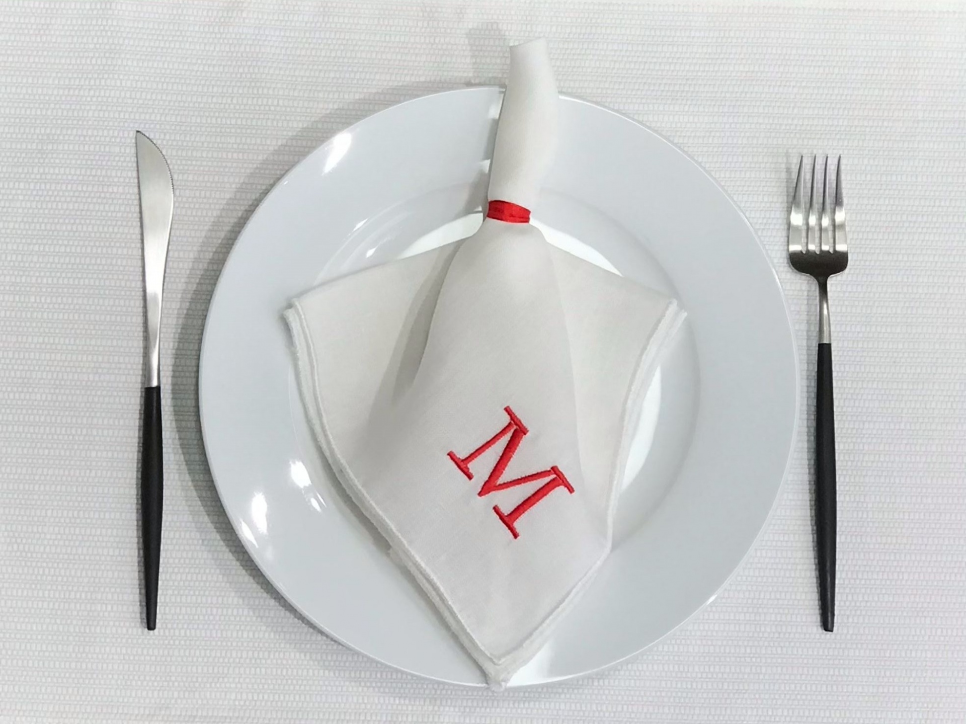 Guardanapo em linho branco/pérola com acabamento de bainha em rolinho. Pormenor de letra bordada.