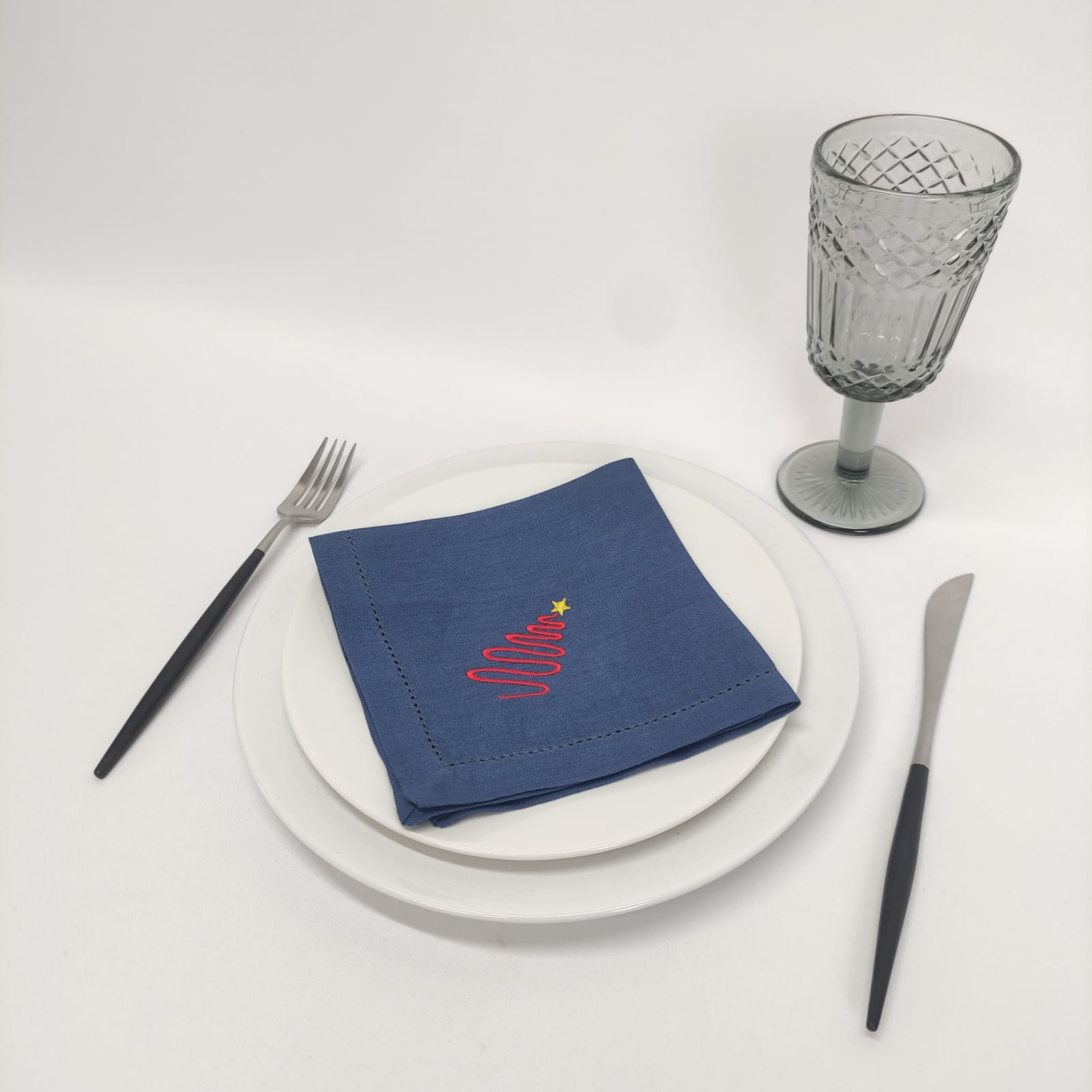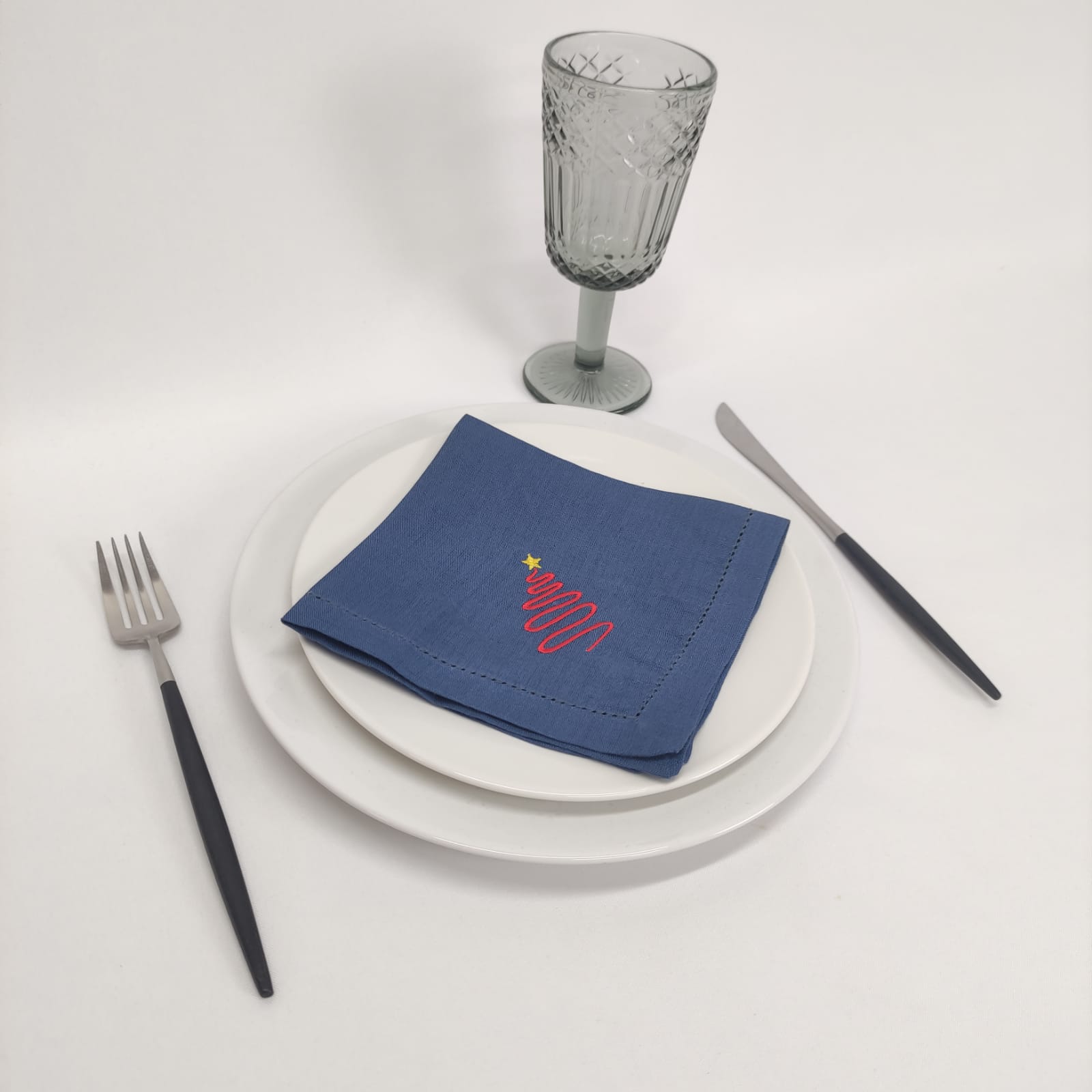 Guardanapo em linho azul com bordado. Acabamento em bainha de 2cm e ponto aberto.