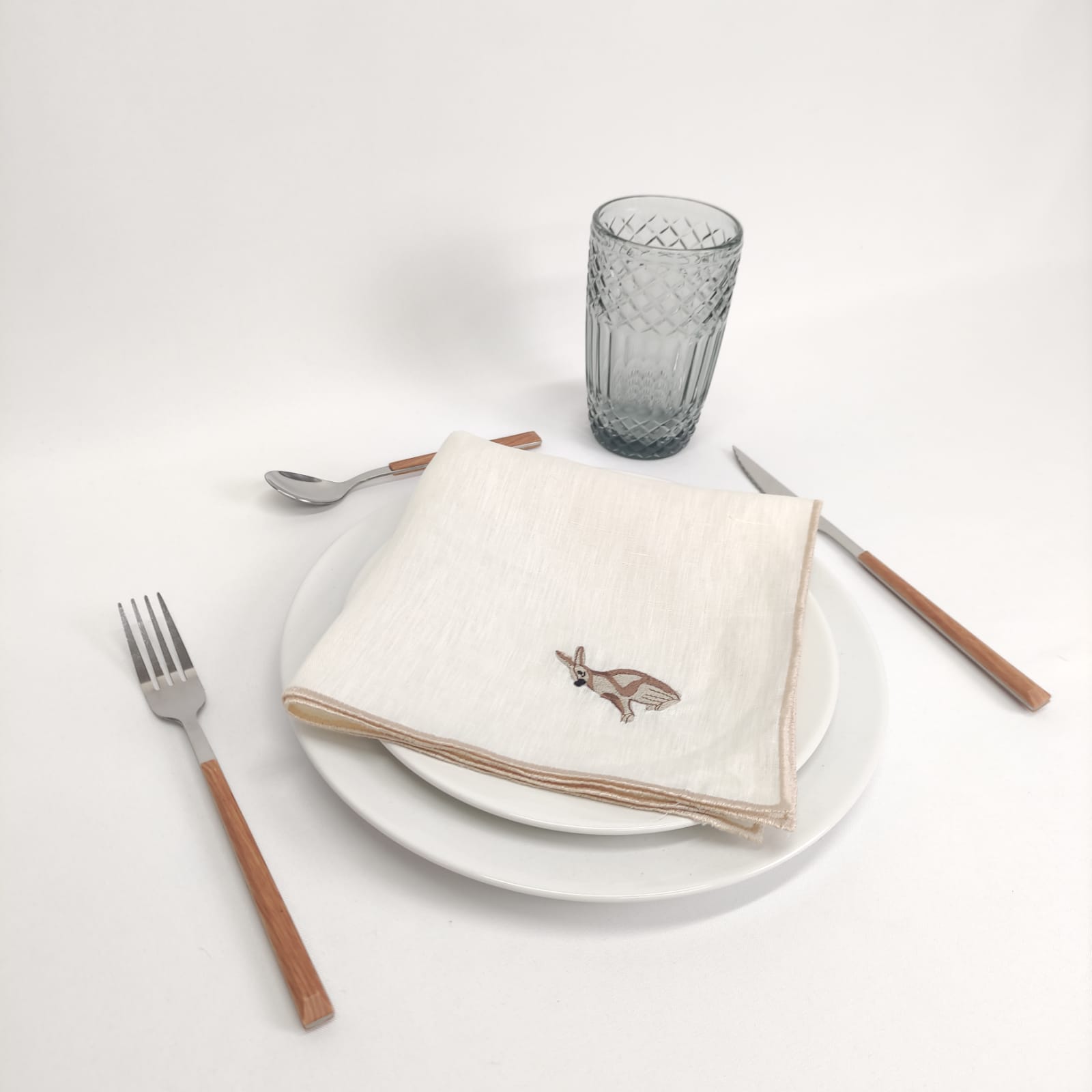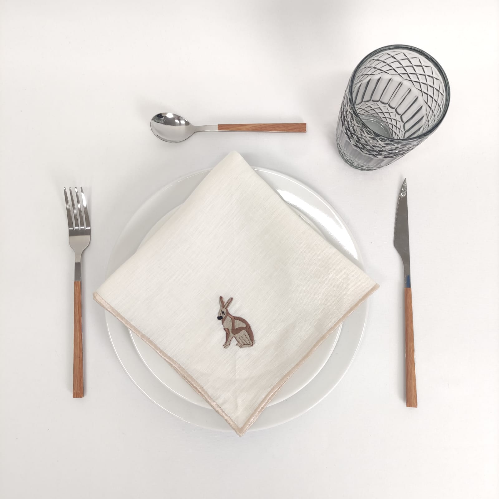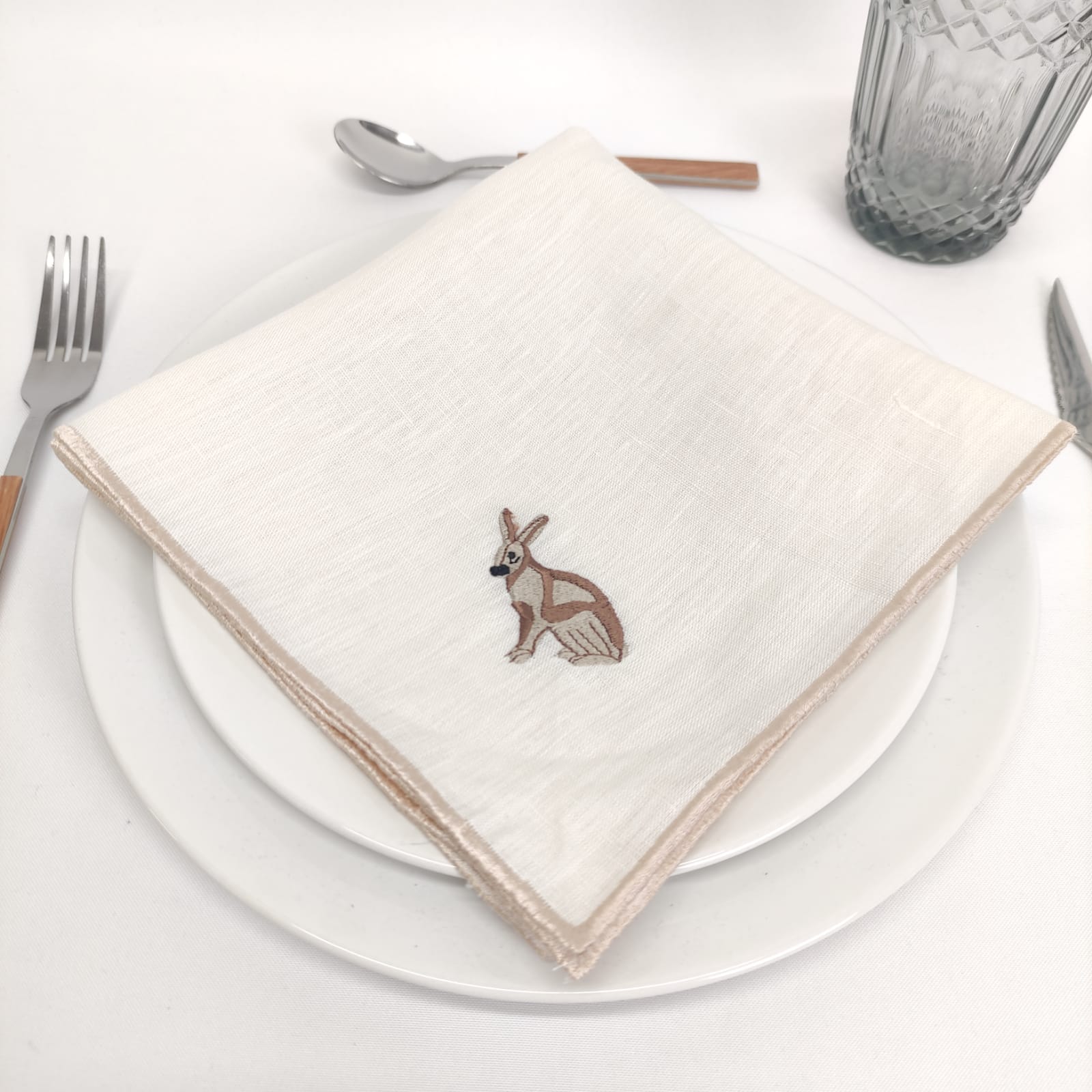 Guardanapo em linho pérola com bordado coelho.