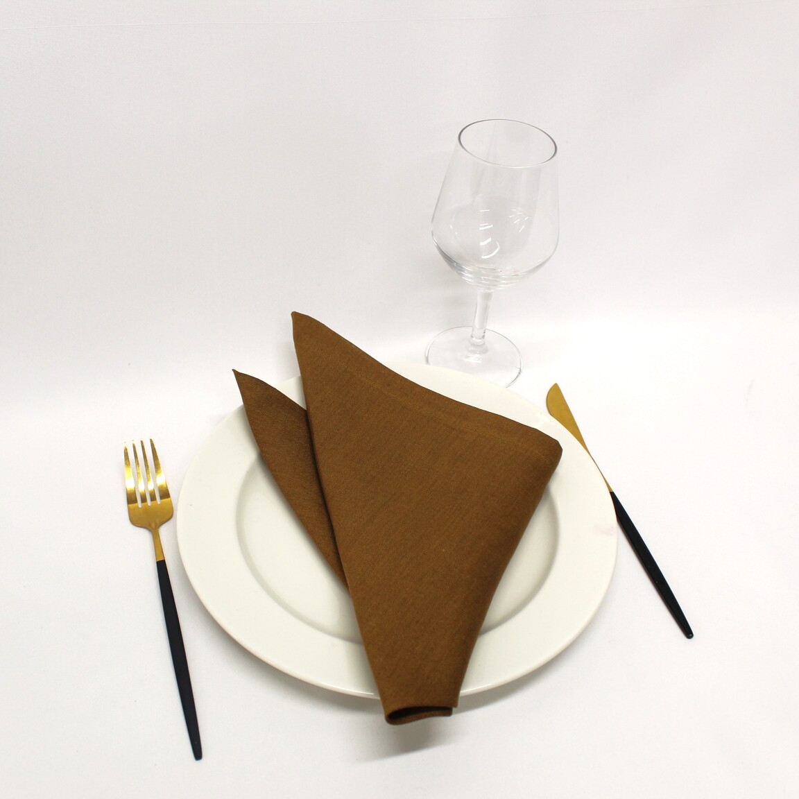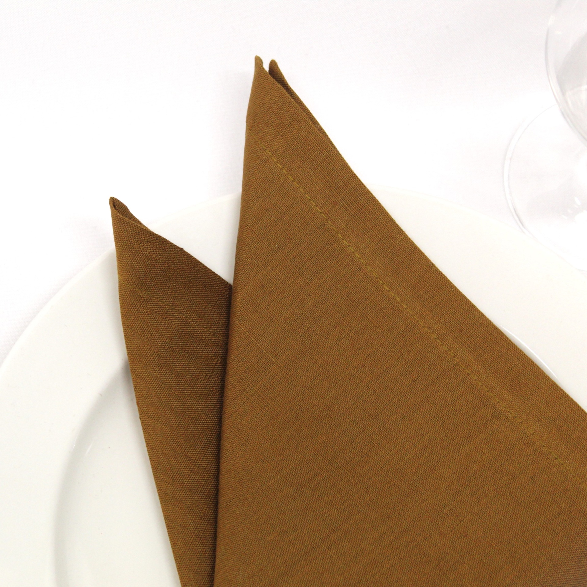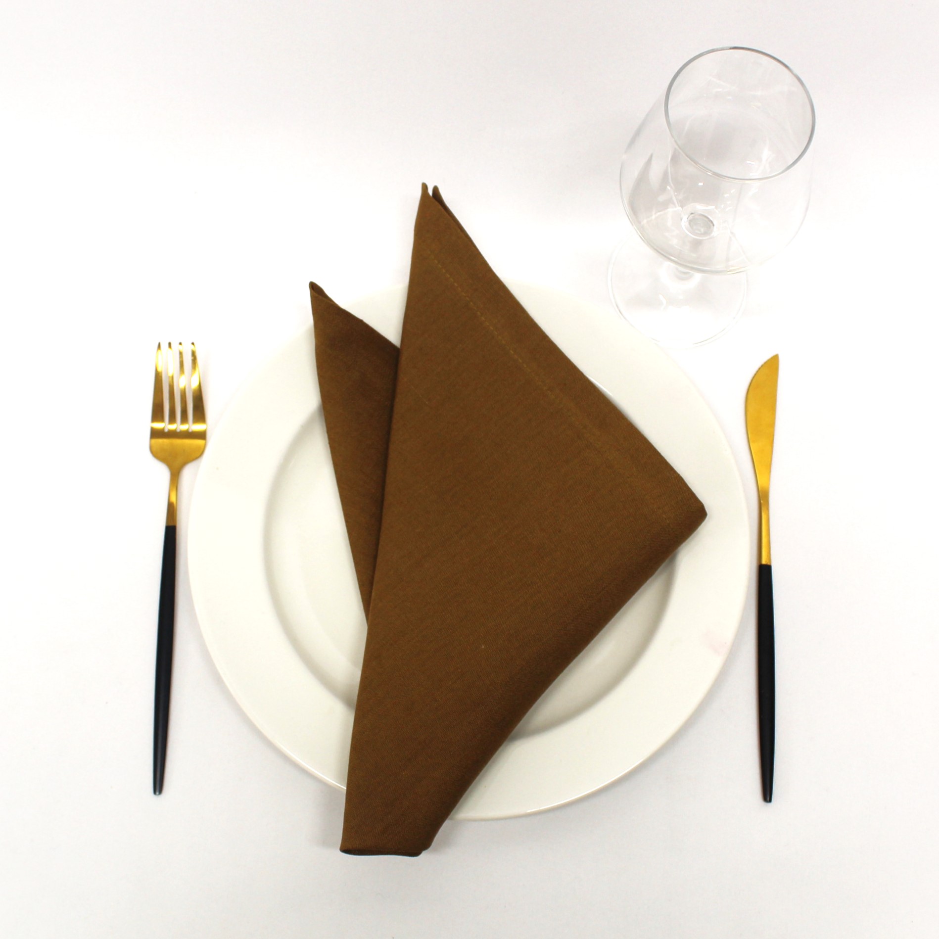 Guardanapo em Linho em tom de castanho bronze . Disponivel em bainha inglesa, ponto aberto e rolinho á cor do linho .