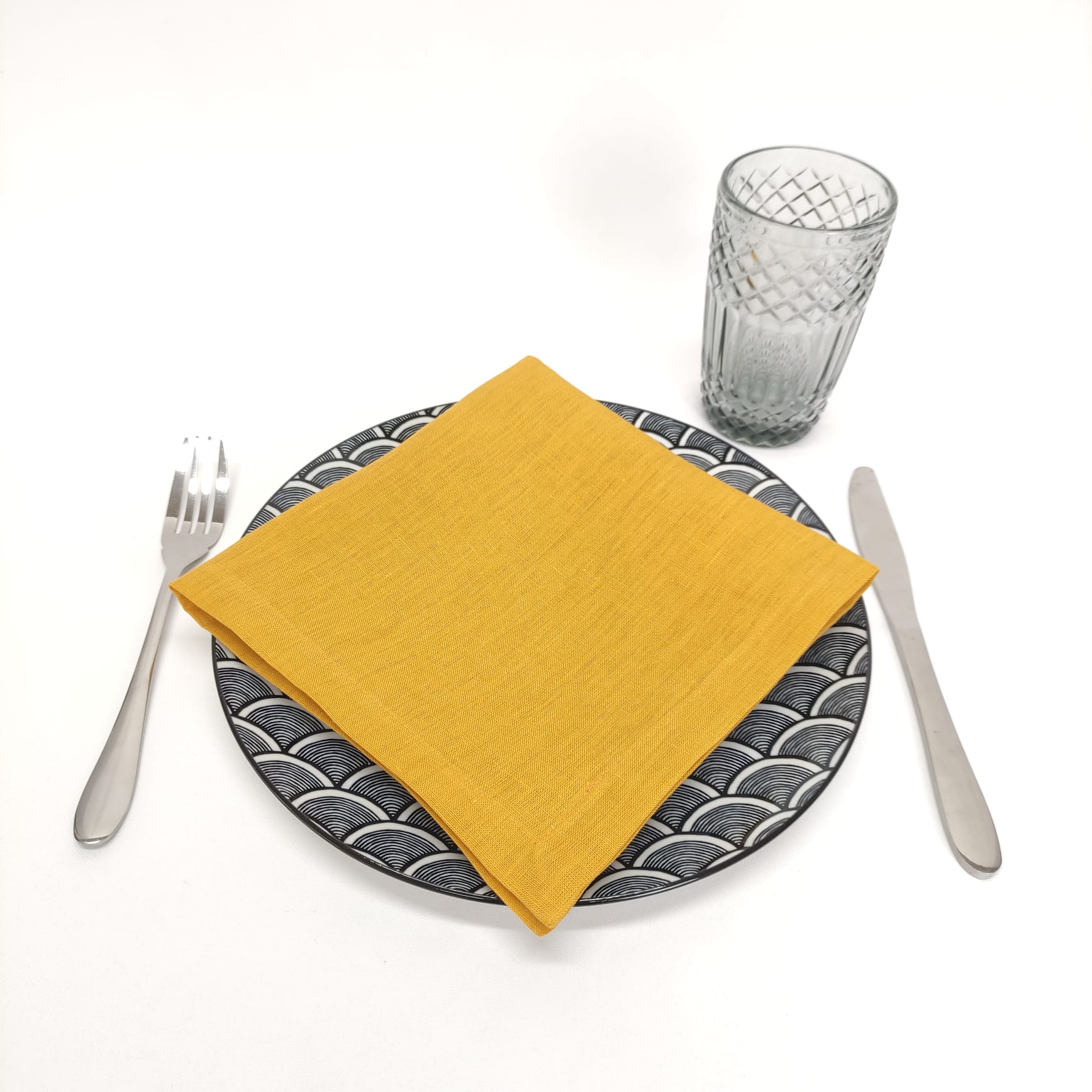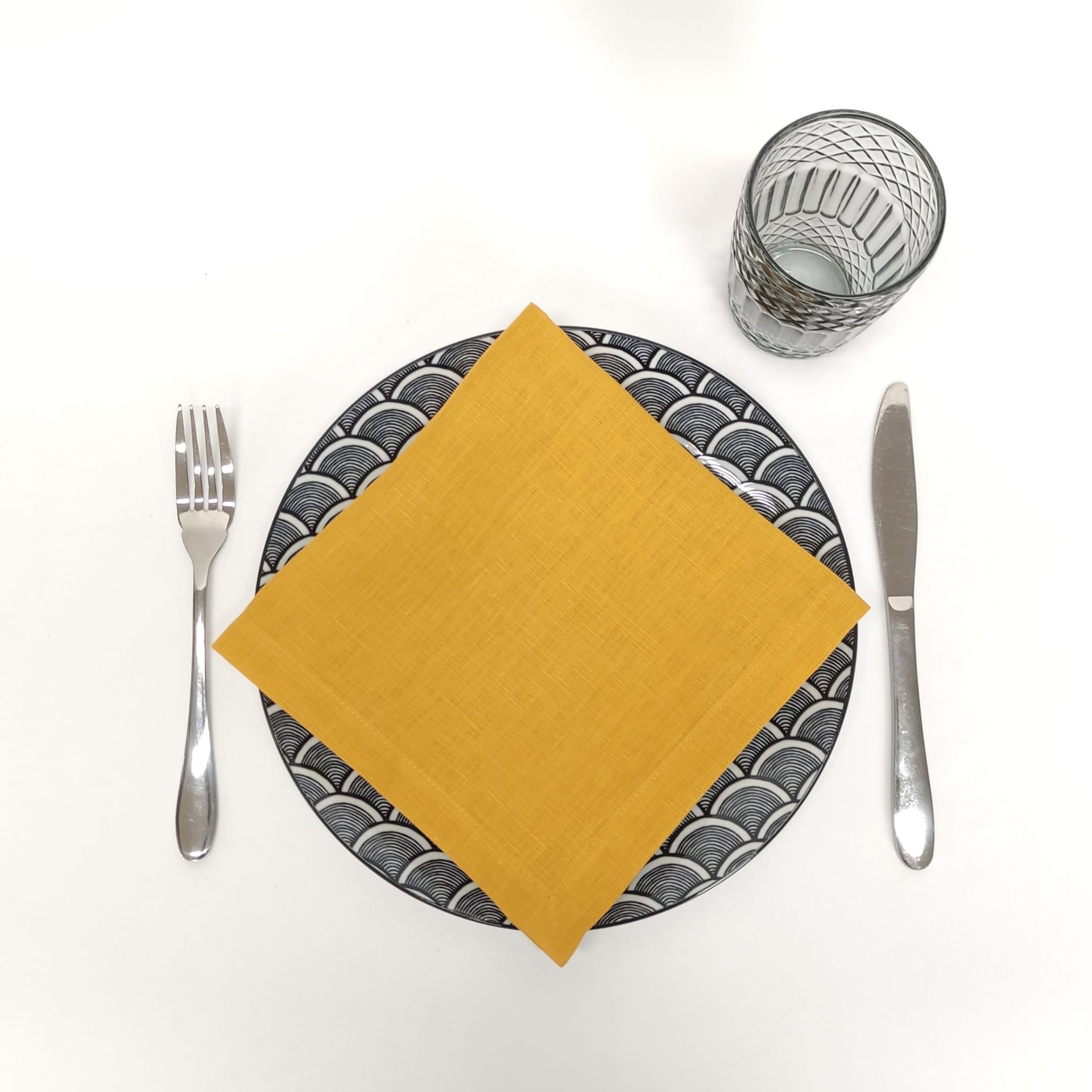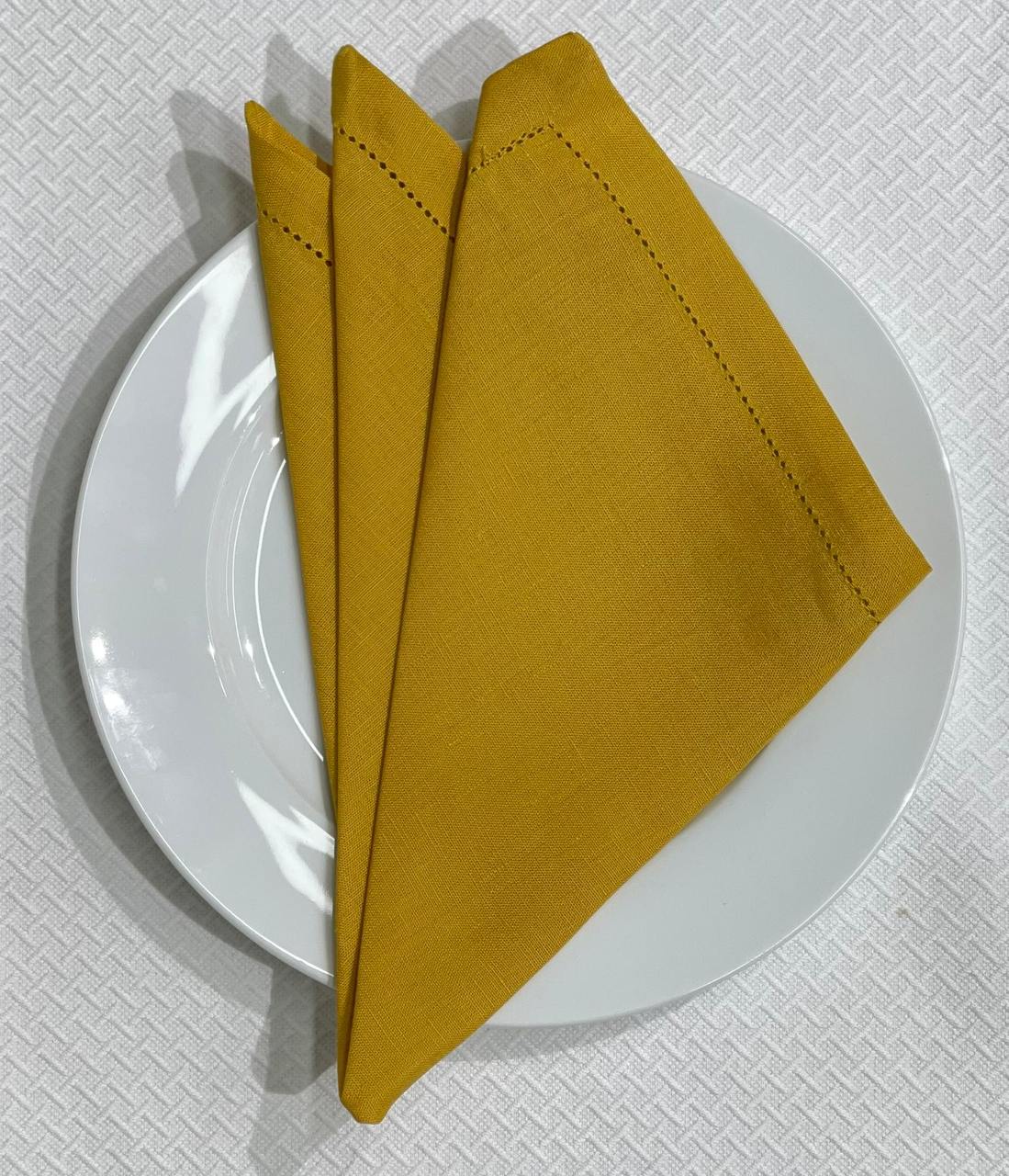 Guardanapo em linho cor mostarda com acabamento em bainha inglesa ou ponto aberto.