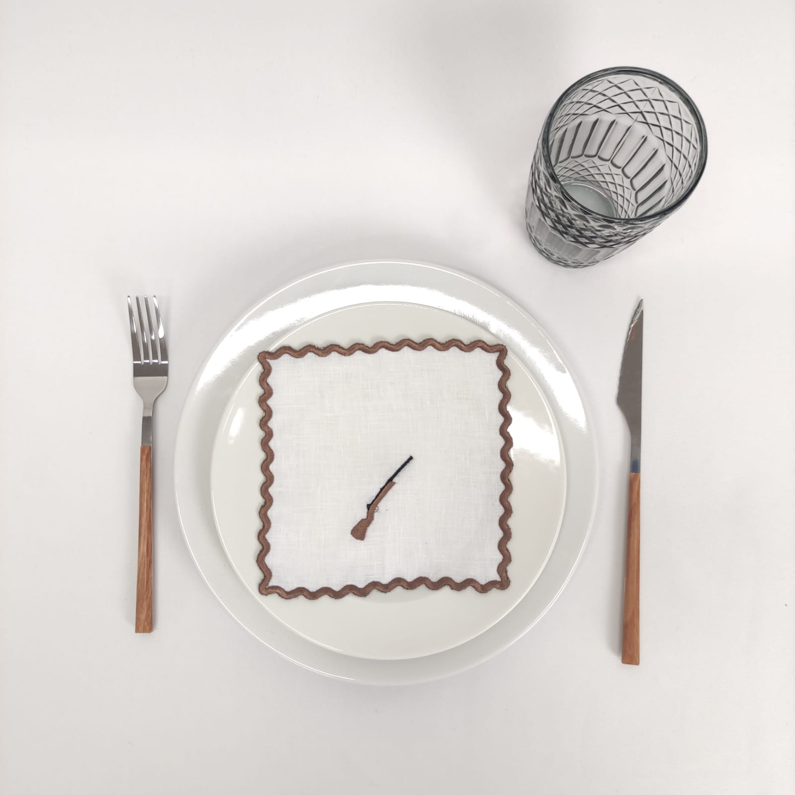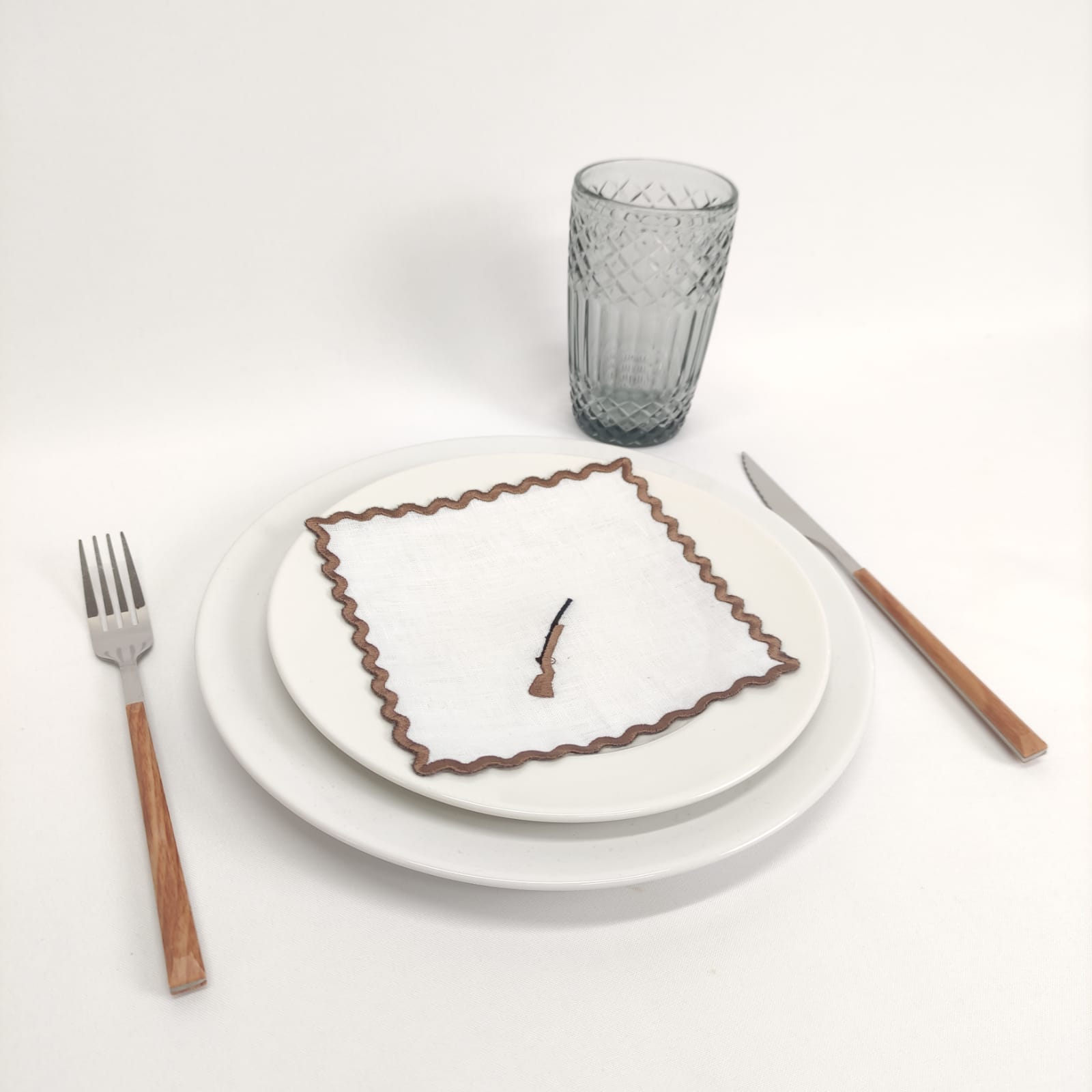Guardanapo cocktail em linho branco com bordado e acabamento em rolinho às ondas.