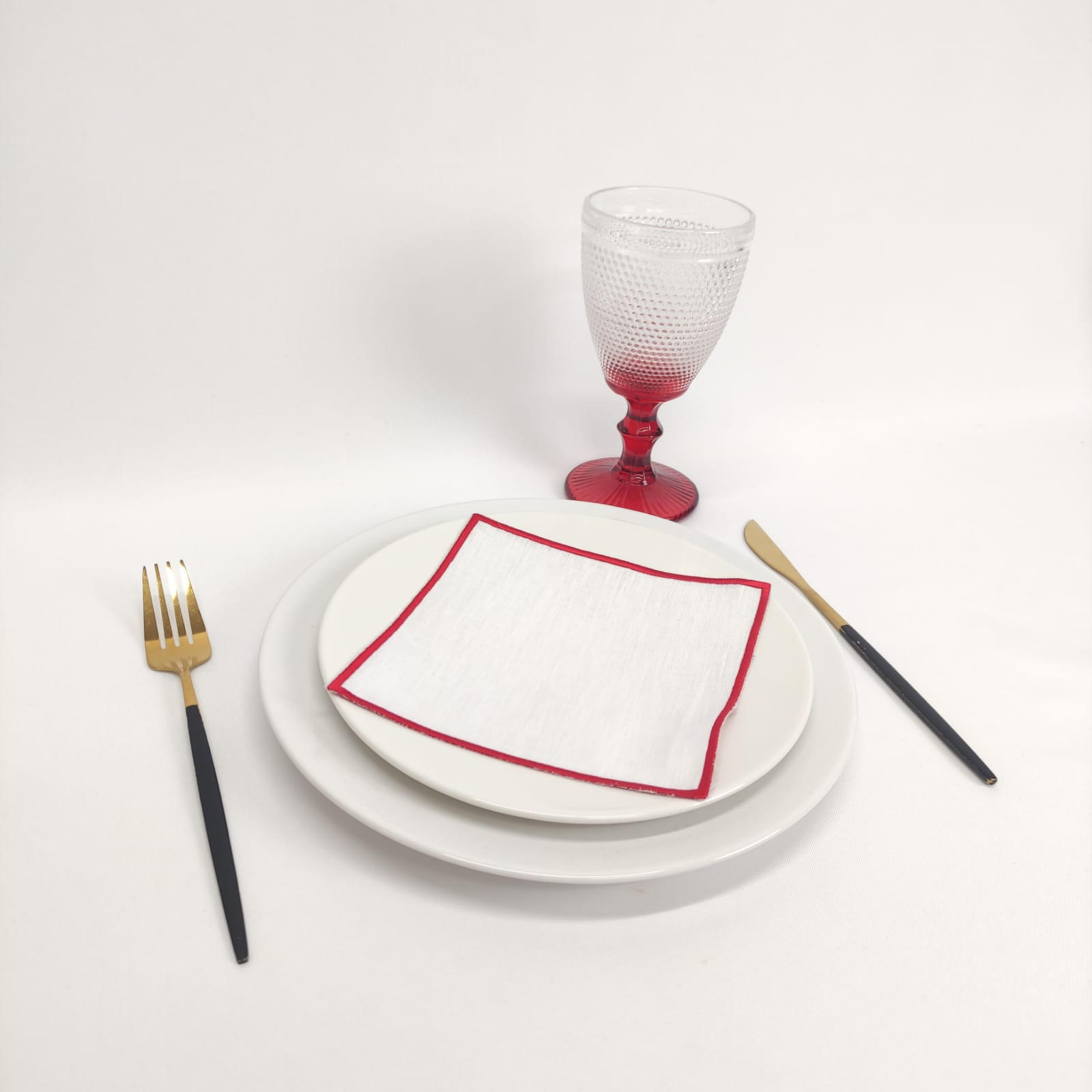 Guardanapo cocktail em linho branco com bordado e acabamento em rolinho .