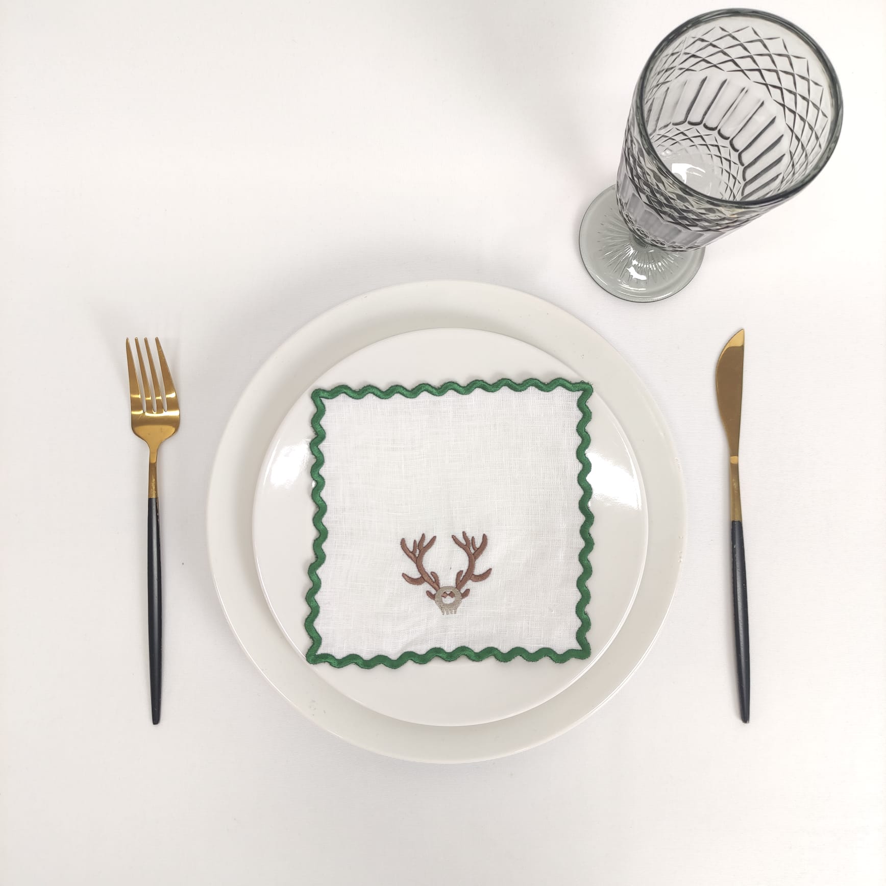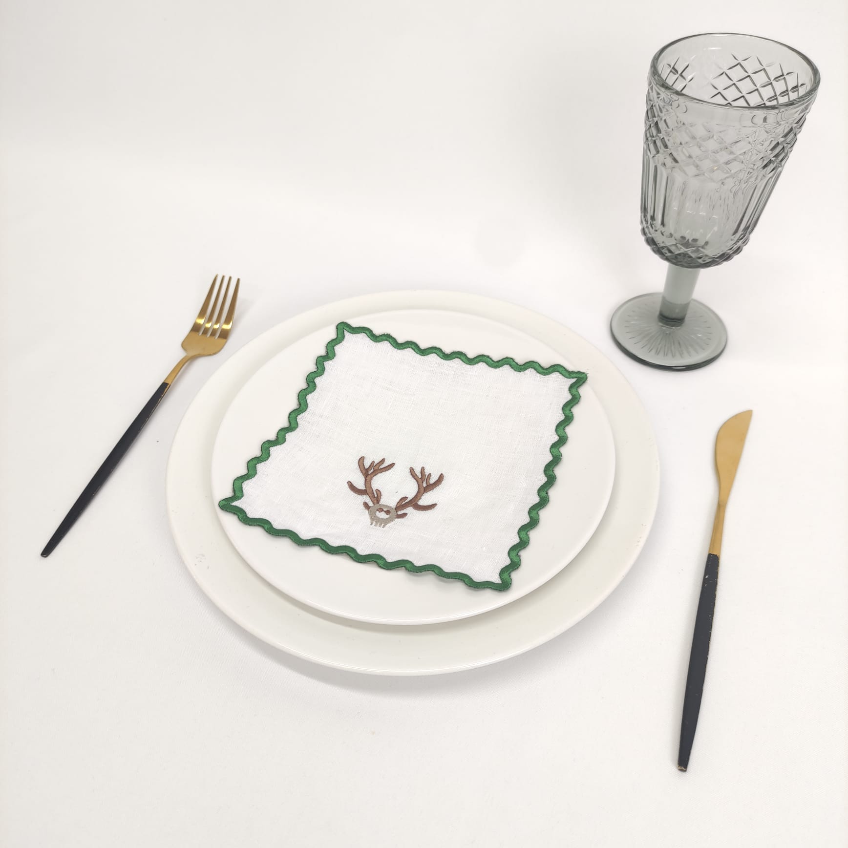 Guardanapo cocktail em linho branco com bordado e acabamento em rolinho às ondas.