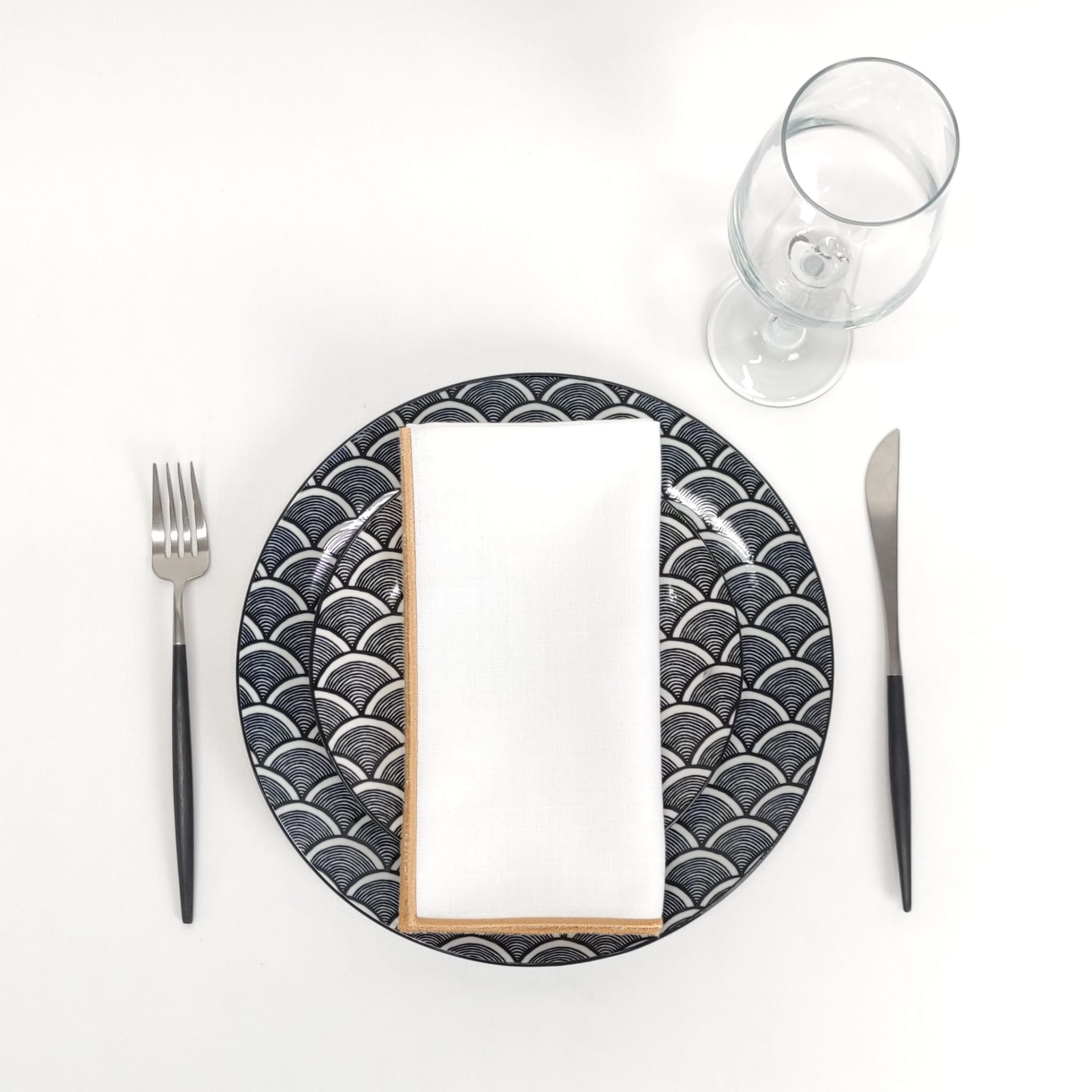 Guardanapo em linho branco com acabamento em rolinho.