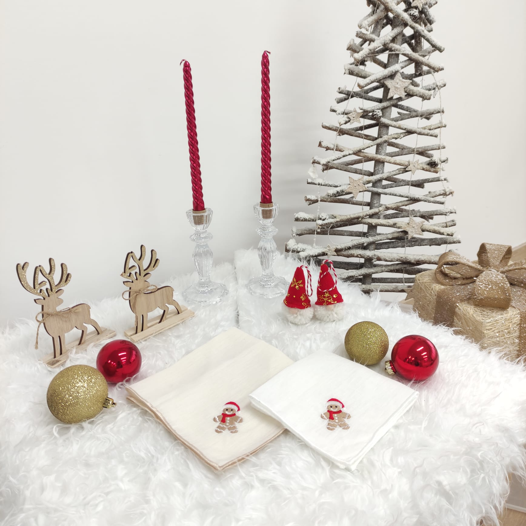 Guardanapo em linho pérola com bordado de Natal e acabamento em rolinho. Perfeito para a ceia de Natal.