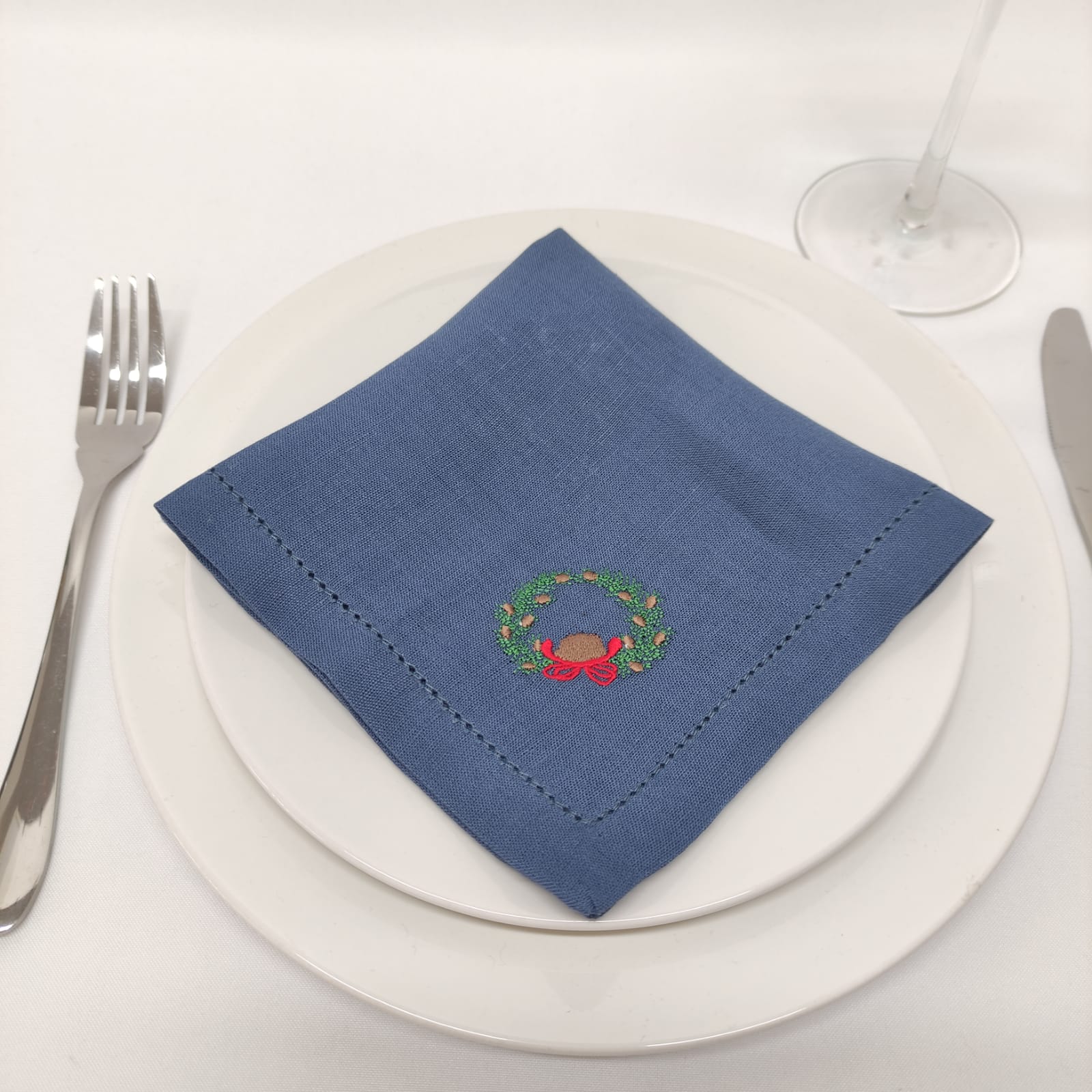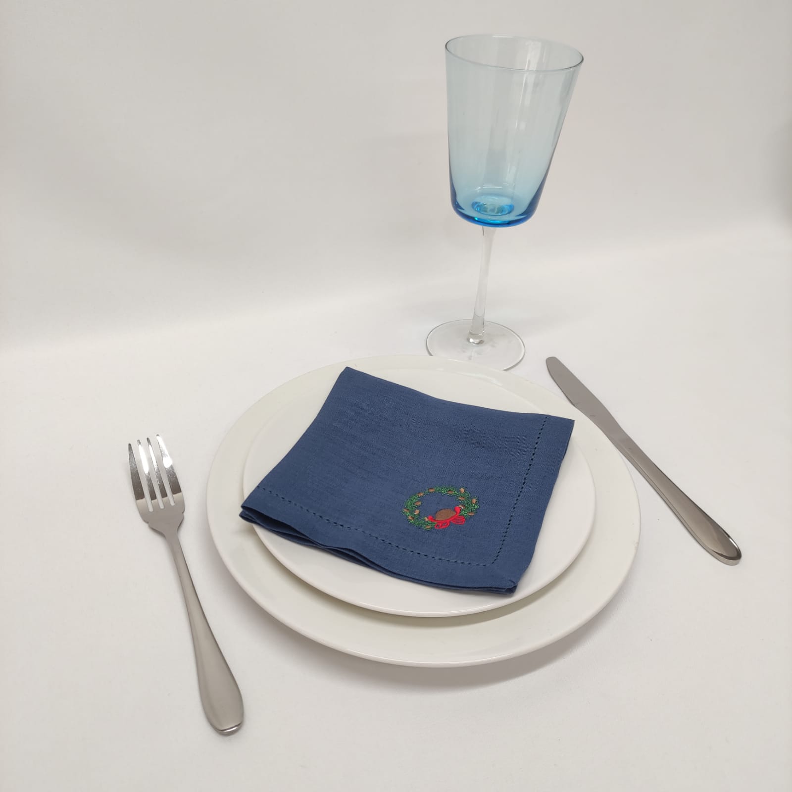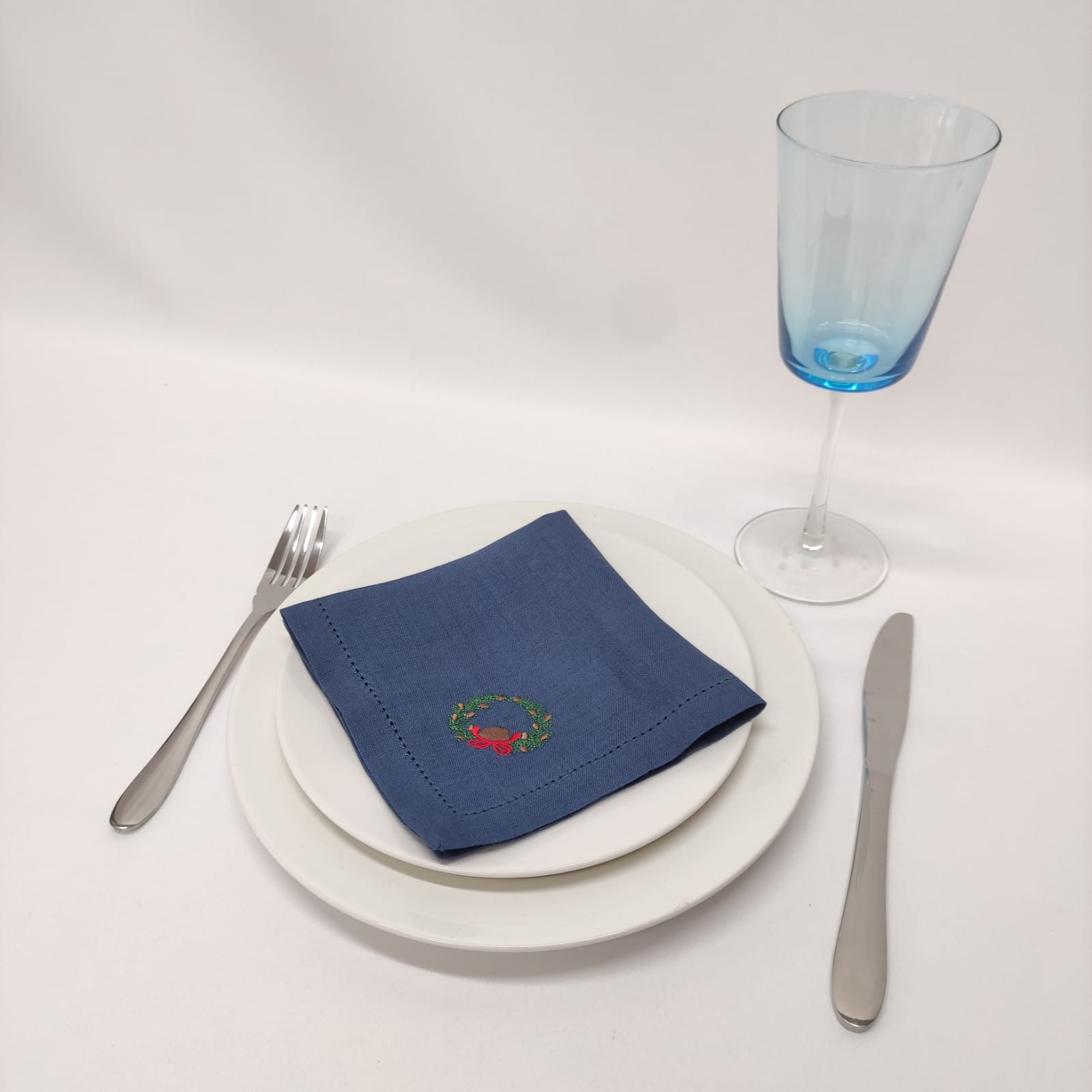 Guardanapo em linho azul com bordado. Acabamento em bainha de 2cm e ponto aberto.