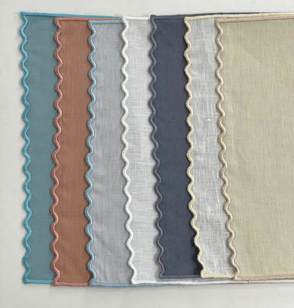 Guardanapo de merenda em linho com efeito de onda em dois lados laterais, acabamento rolinho.