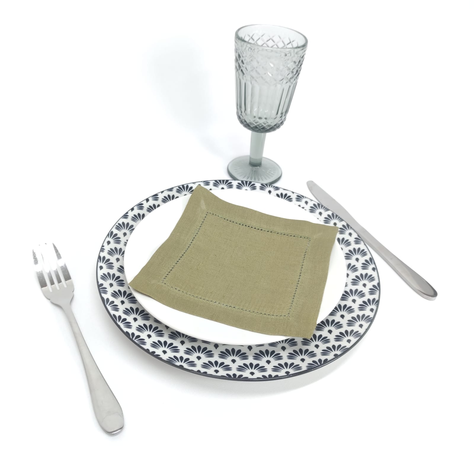 Guardanapo em linho com trabalhado em bainha Inglesa e Ponto Aberto, na cor verde musgo.