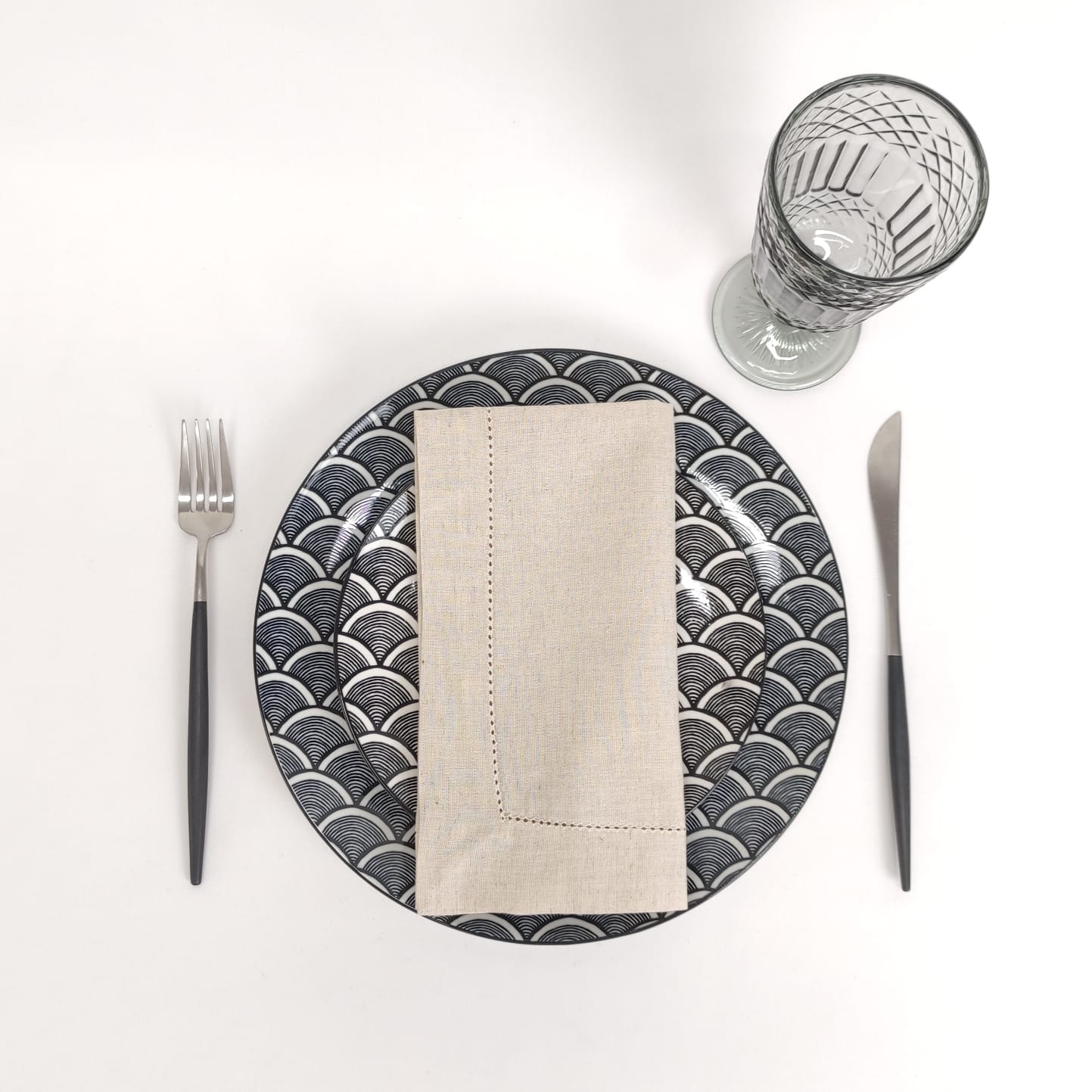 Guardanapo em Linho bege com acabamento em ponto aberto da mesma cor do guardanapo.