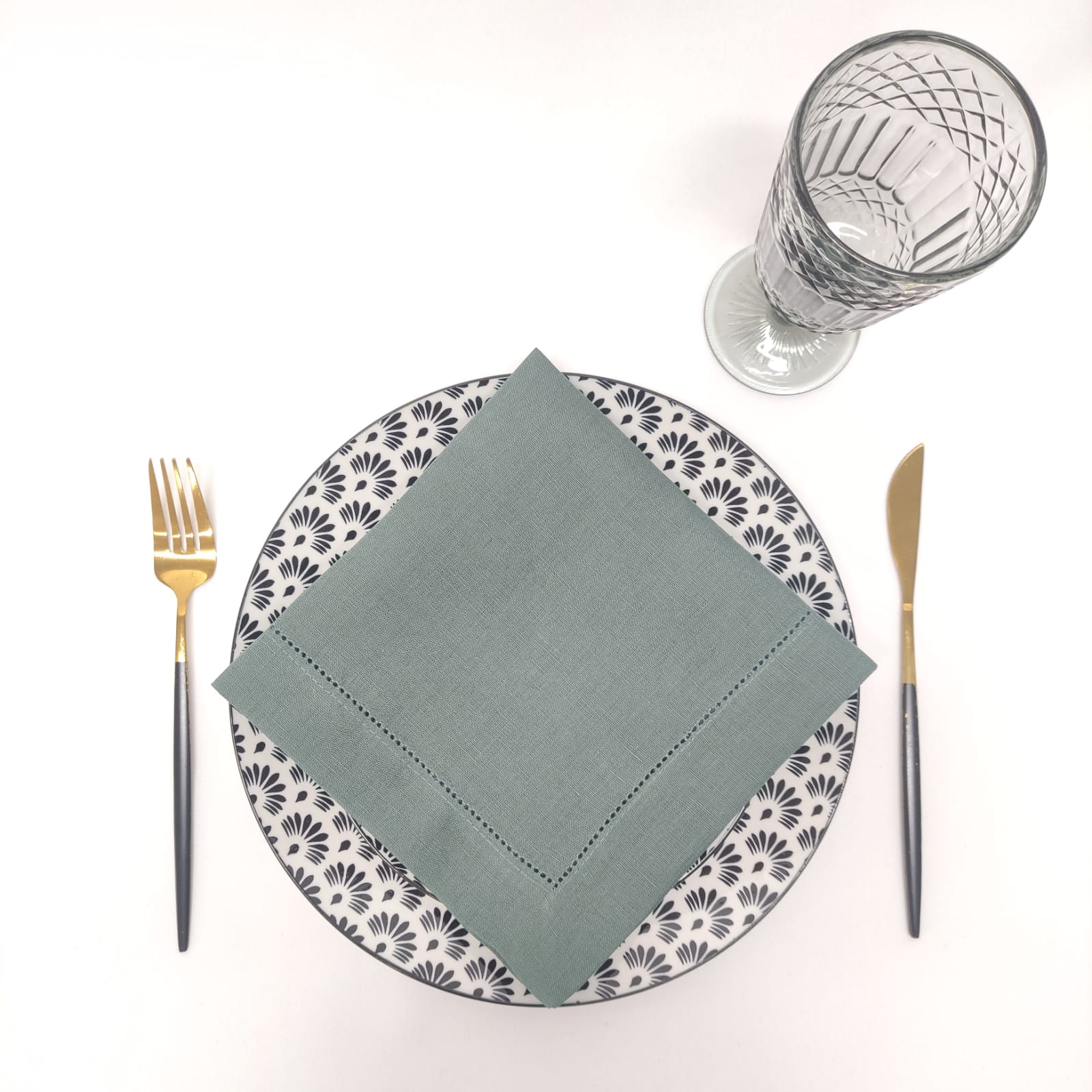 Guardanapo em linho com trabalhado em bainha Inglesa e Ponto Aberto, na cor verde Esmeralda.
