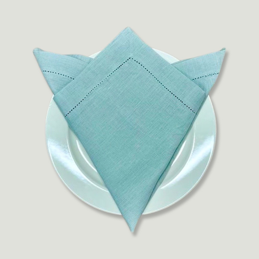 Guardanapo em Linho azul, acabamento de ponto aberto bainha de 3 cm.