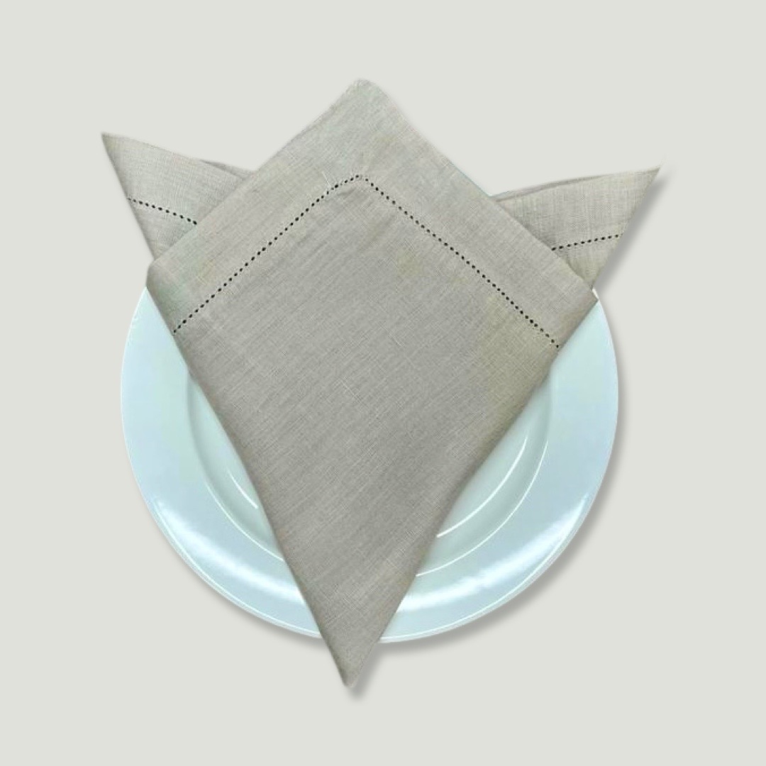 Guardanapo em Linho bege, acabamento de ponto aberto bainha de 3 cm.